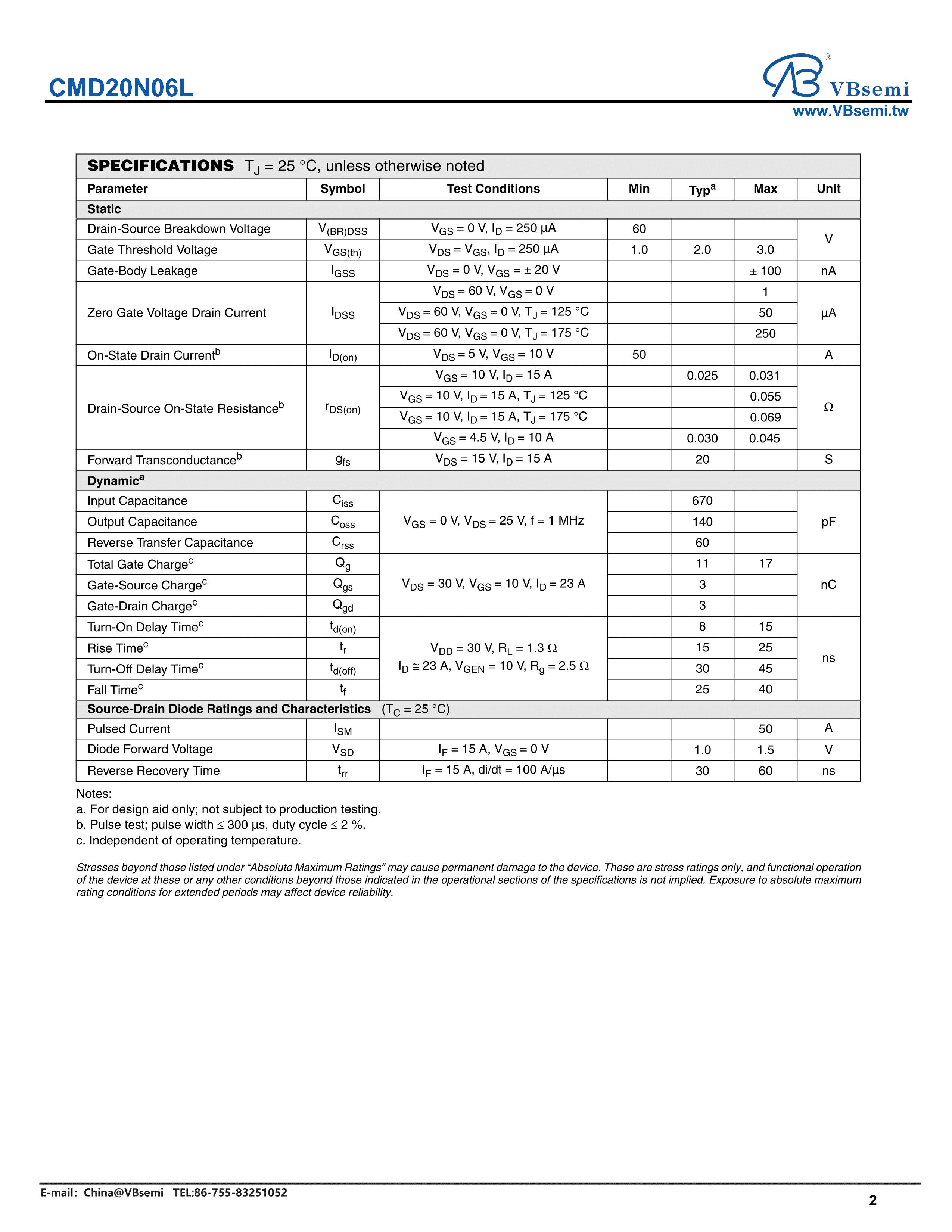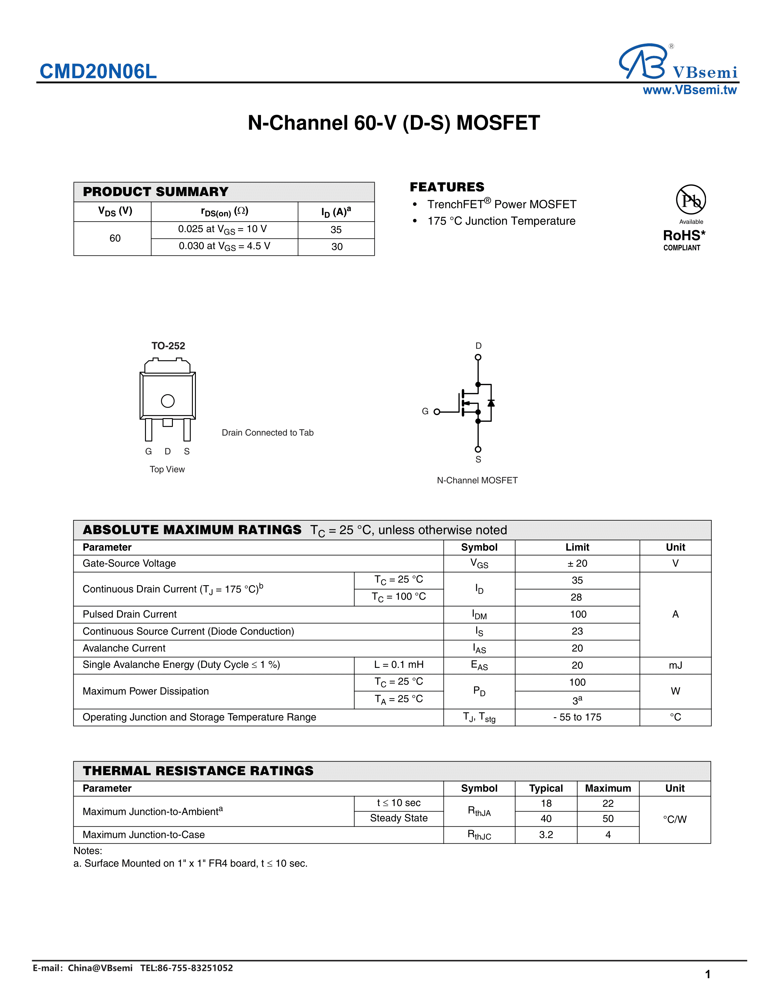 CMD20N06L数据手册TO-252封装VBsemi(台湾微碧)PDF规格书,中英文下载