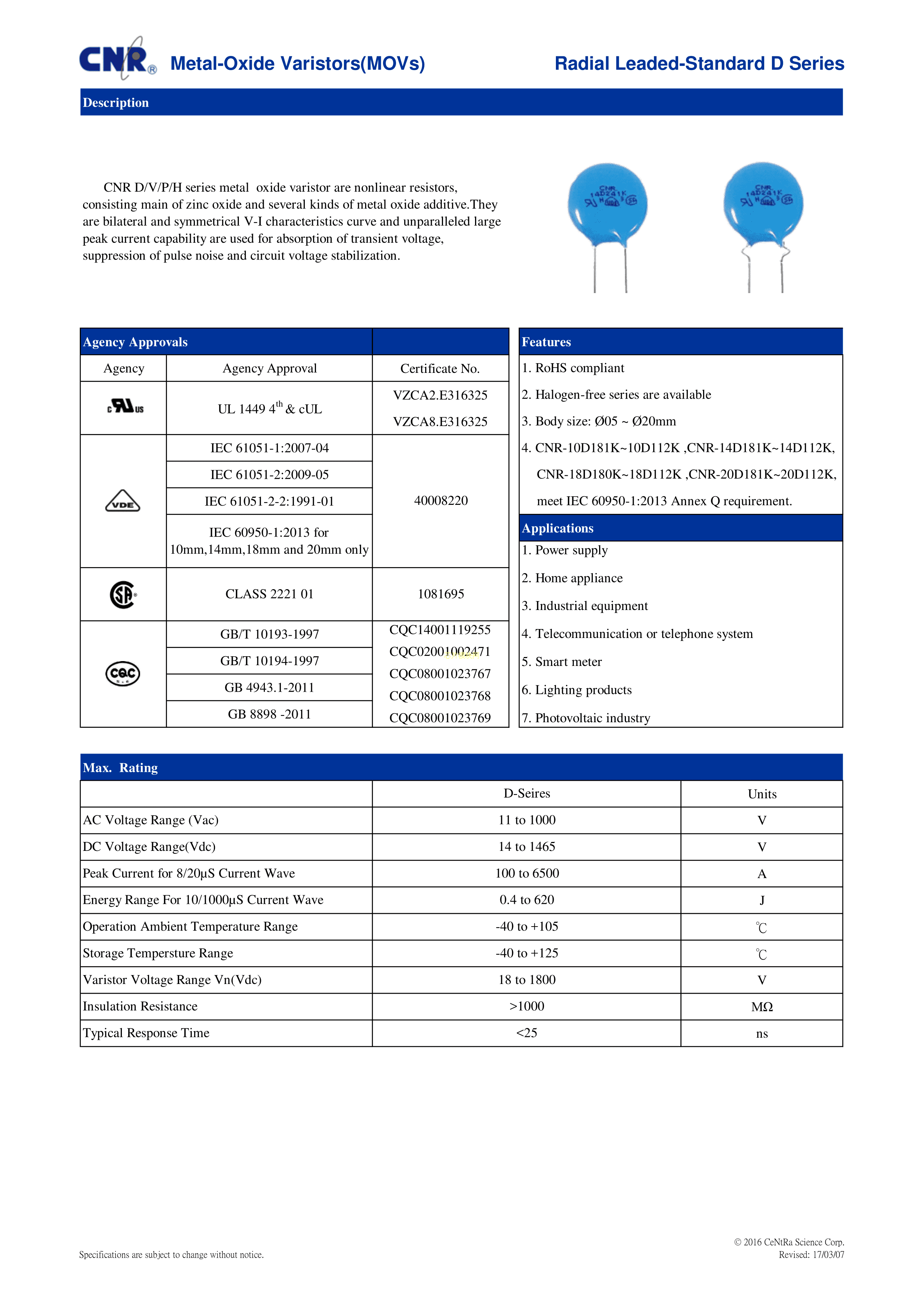 CNR-10V511KTRSA数据手册径向引线封装CNR(舜全)PDF规格书,中英文下载
