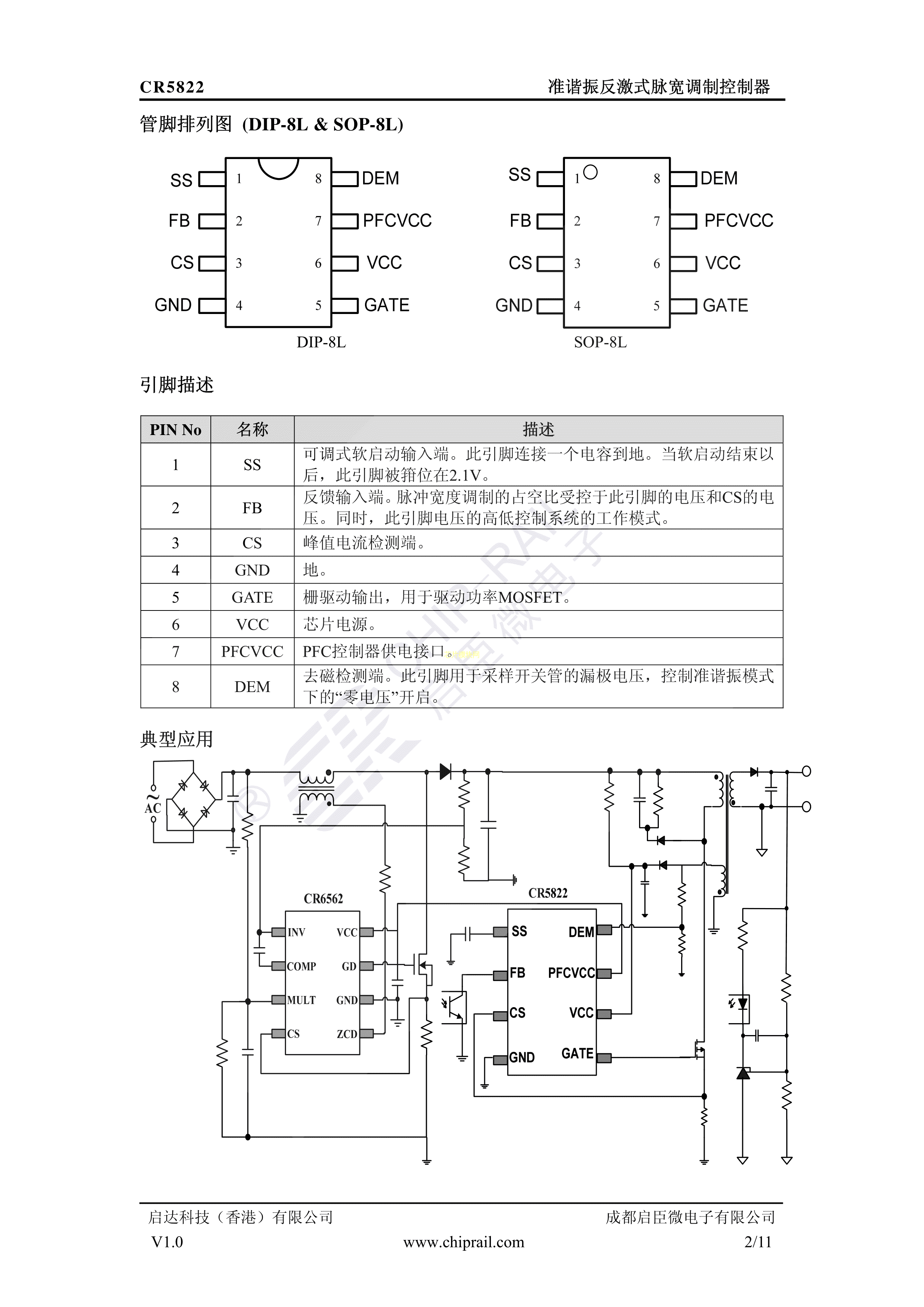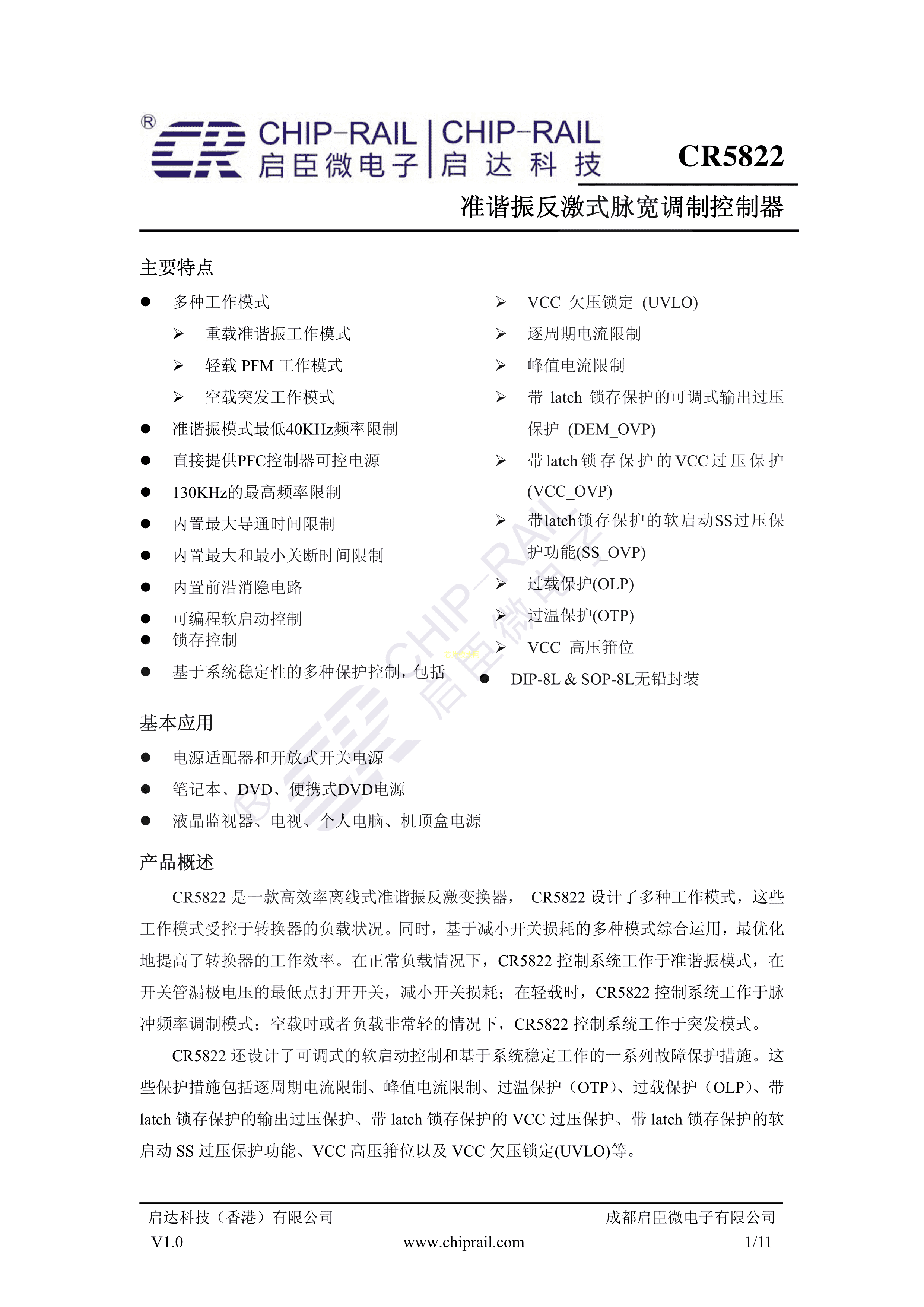 CR5822数据手册SOP-8封装Chip-Rail(启臣微)PDF规格书,中英文下载
