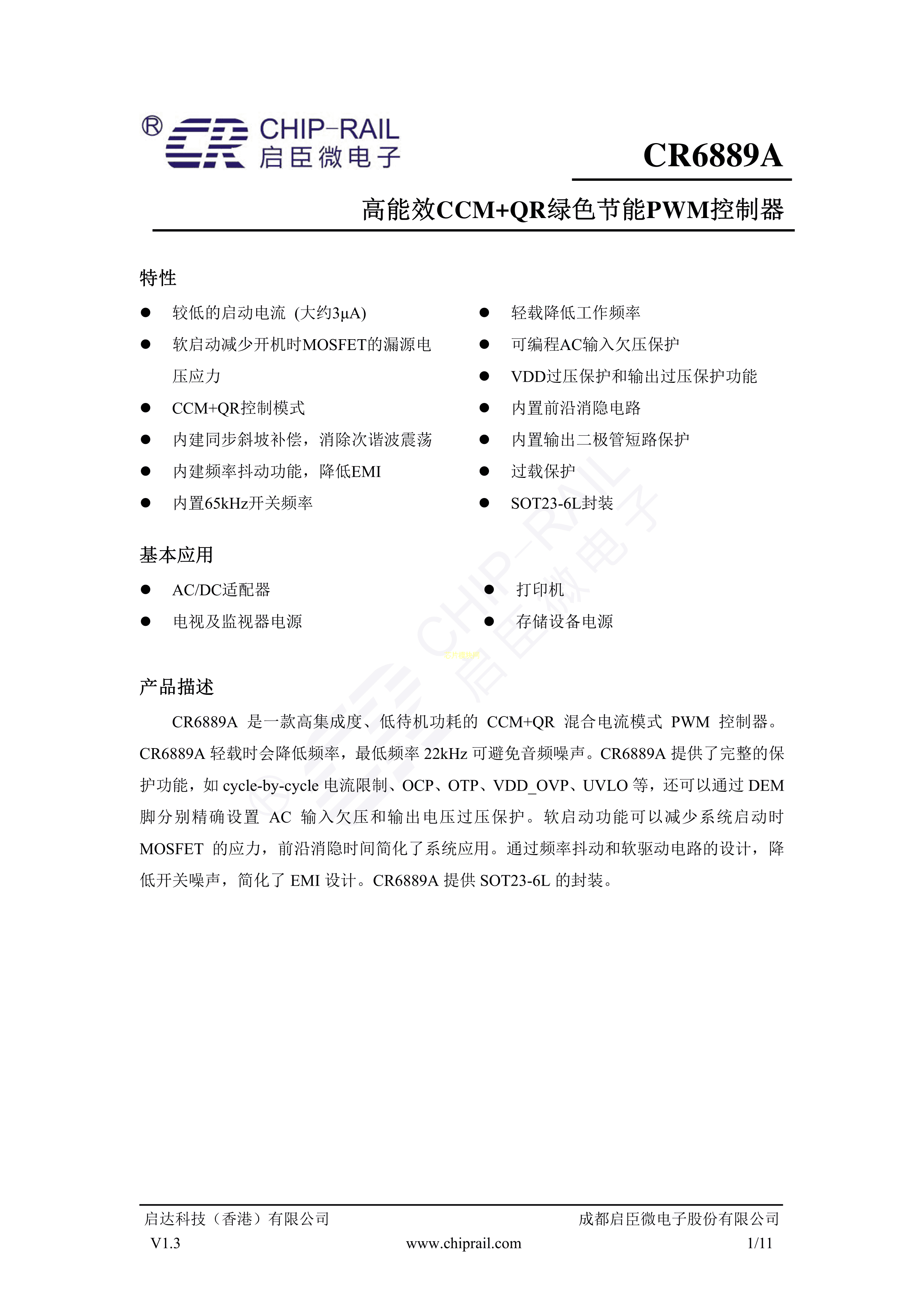 CR6889A数据手册SOT-23-6L封装Chip-Rail(启臣微)PDF规格书,中英文下载