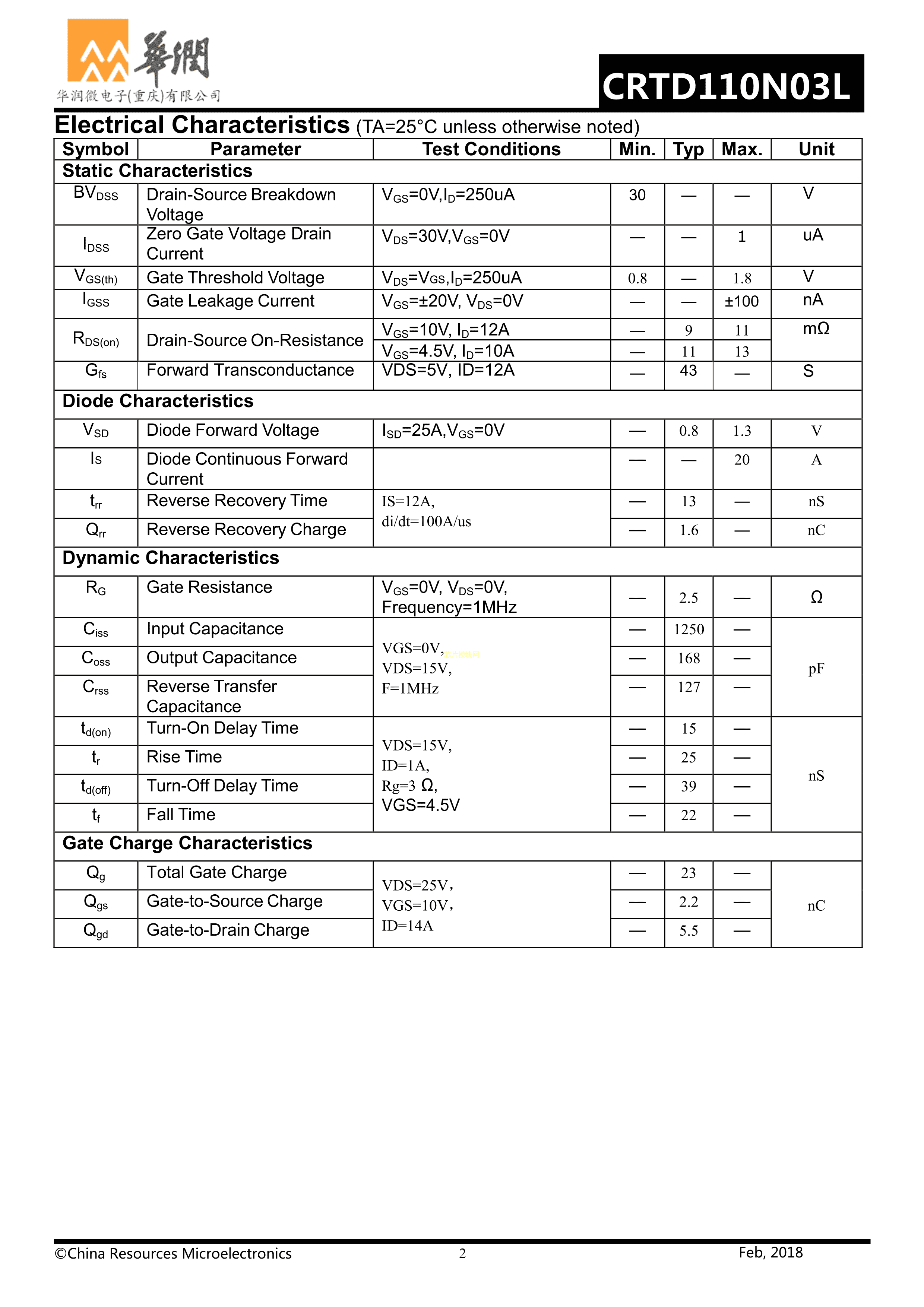 CRTD110N03L数据手册TO-252封装CRMICRO(华润微)PDF规格书,中英文下载