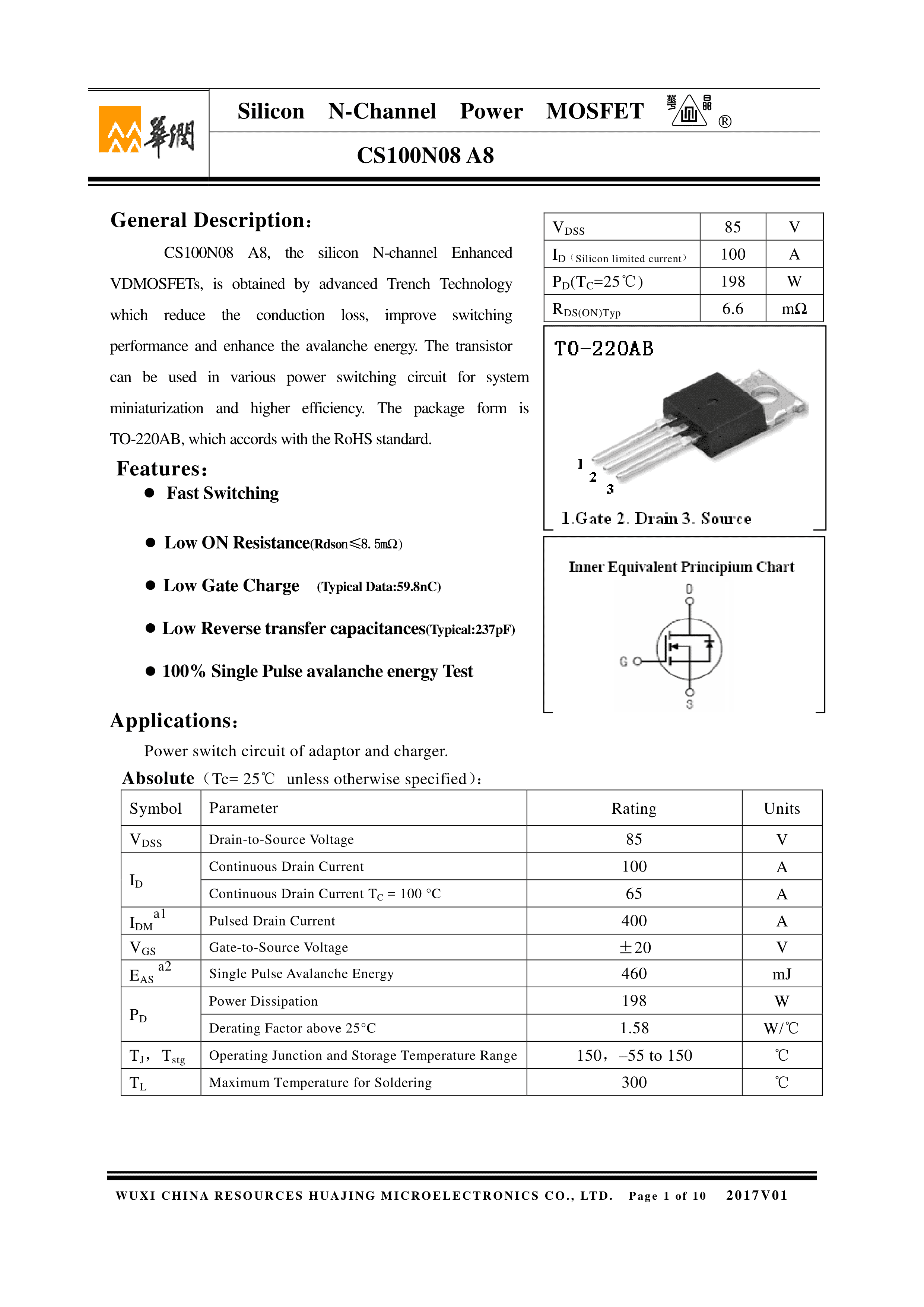 CS100N08A8数据手册TO-220(TO-220-3)封装华润华晶PDF规格书,中英文下载