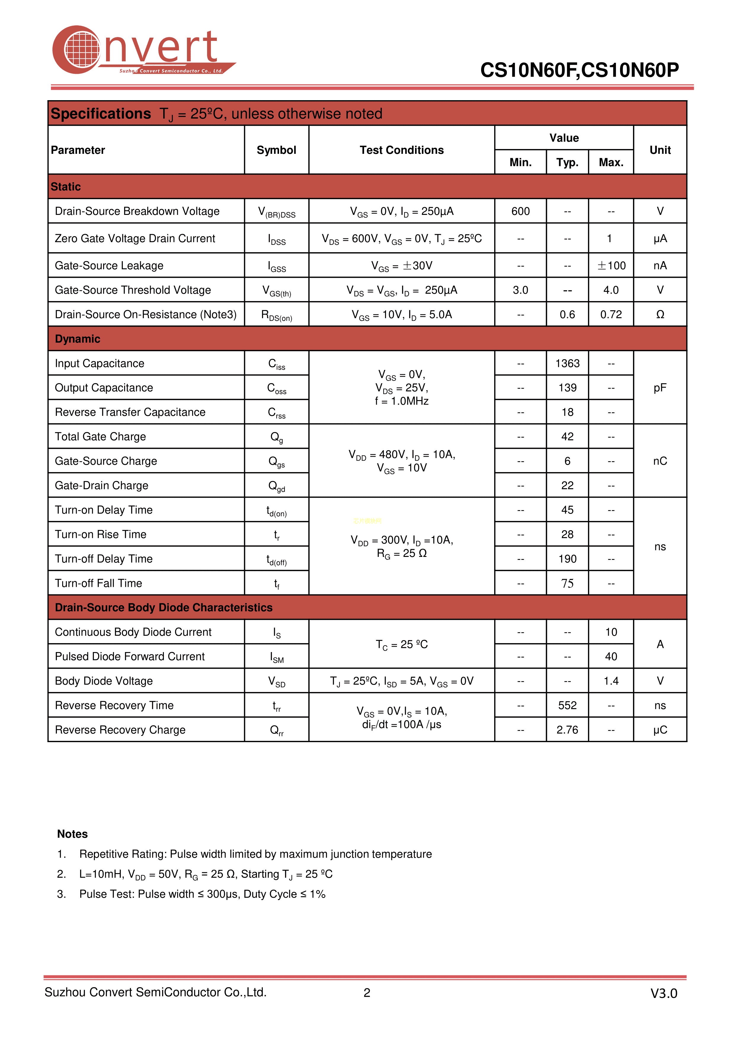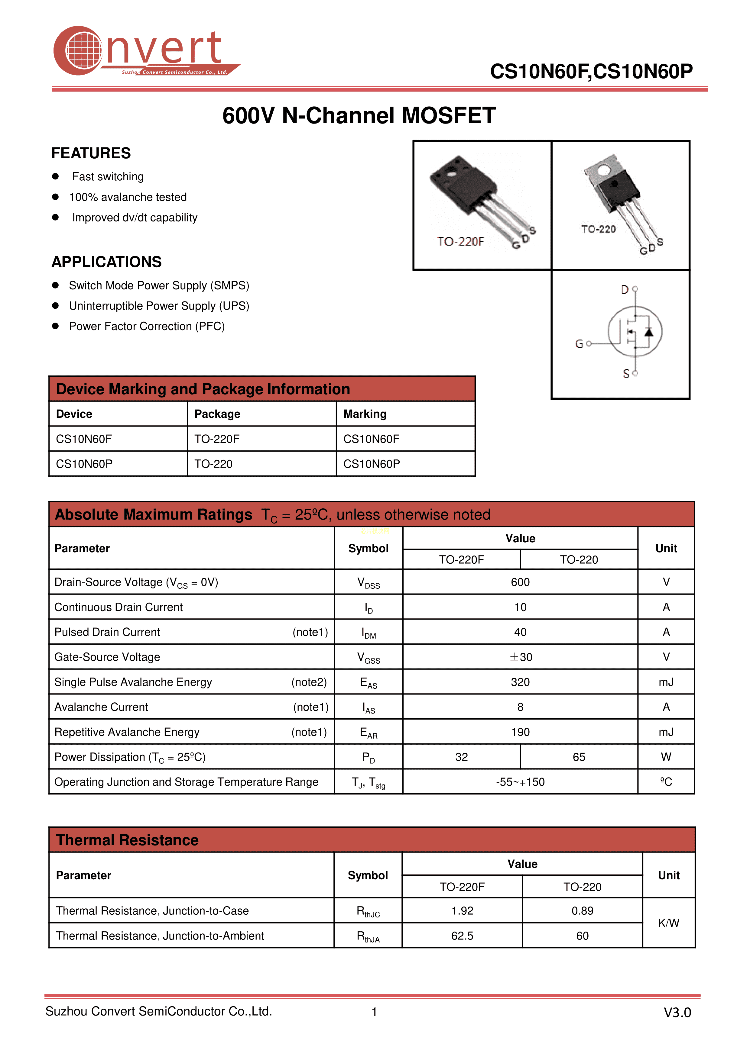 CS10N60P数据手册TO-220封装ConvertSemiconductor(锴威特半导体)PD