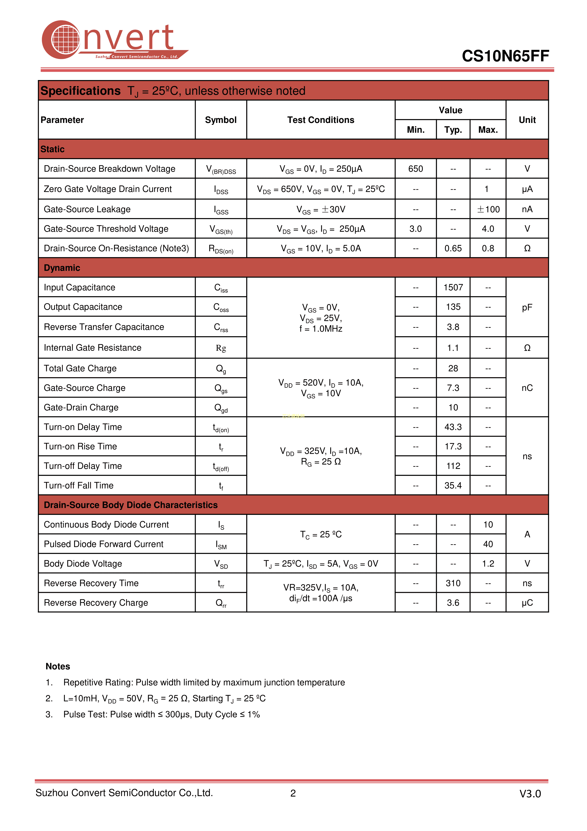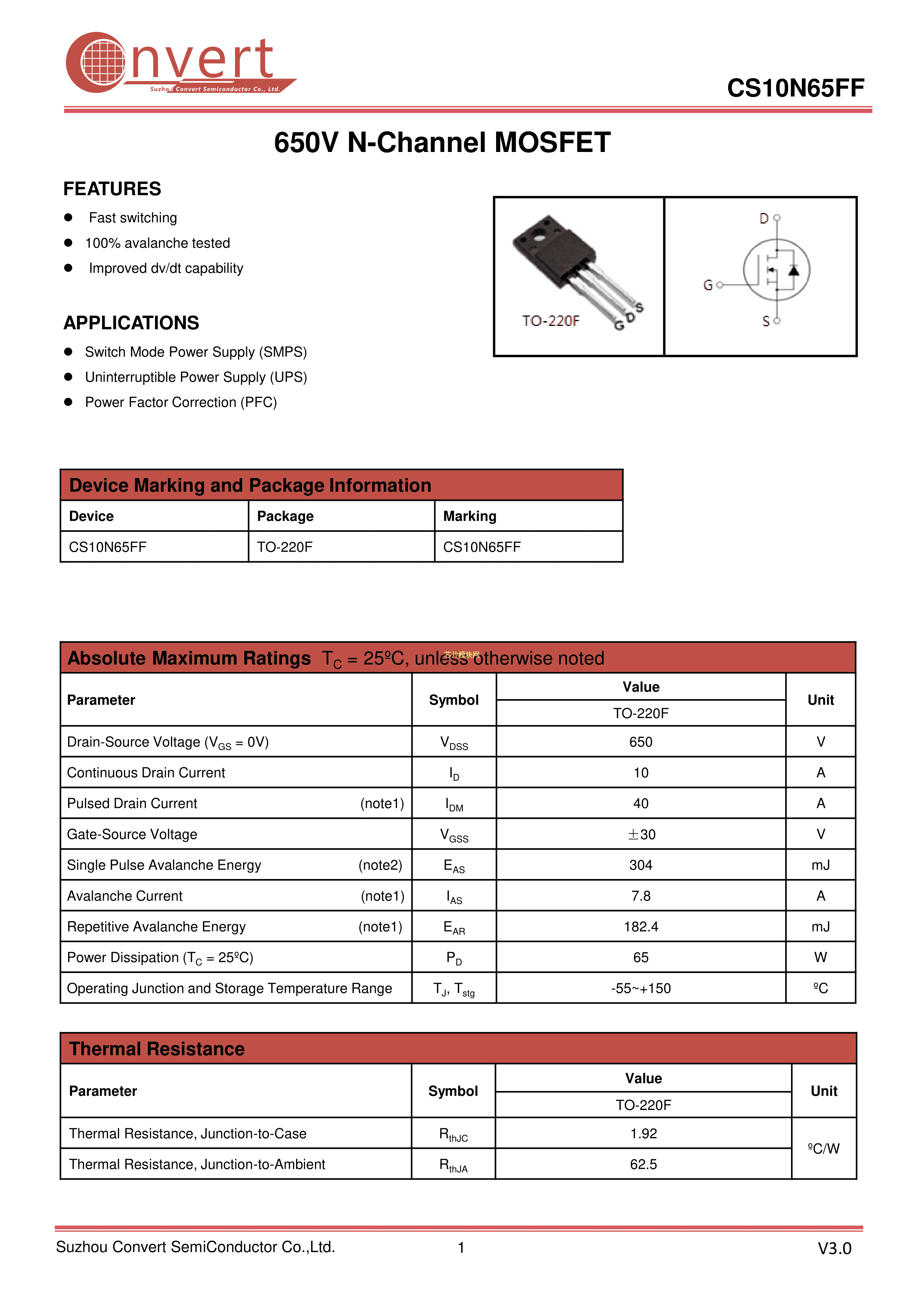 CS10N65FF数据手册TO-220F封装ConvertSemiconductor(锴威特半导体)