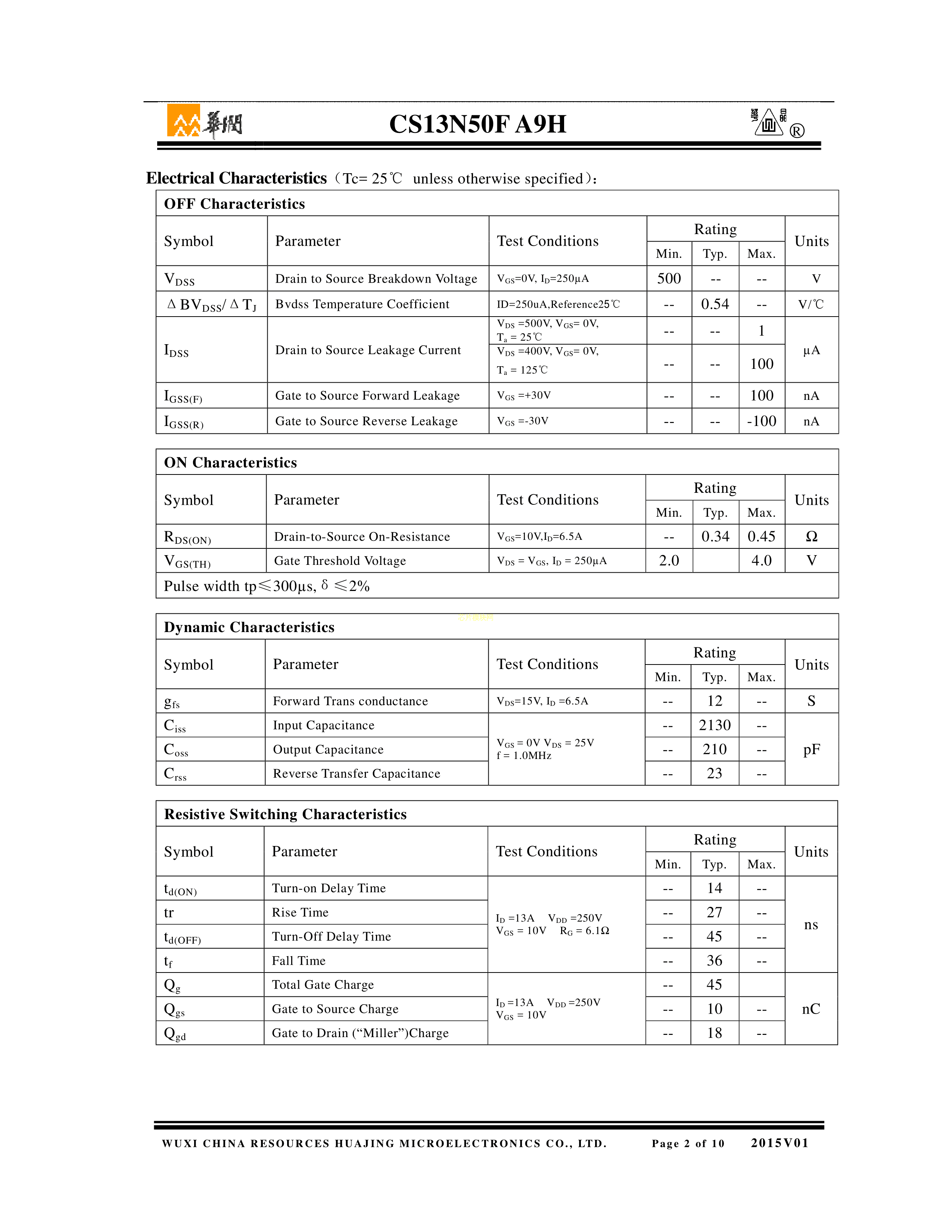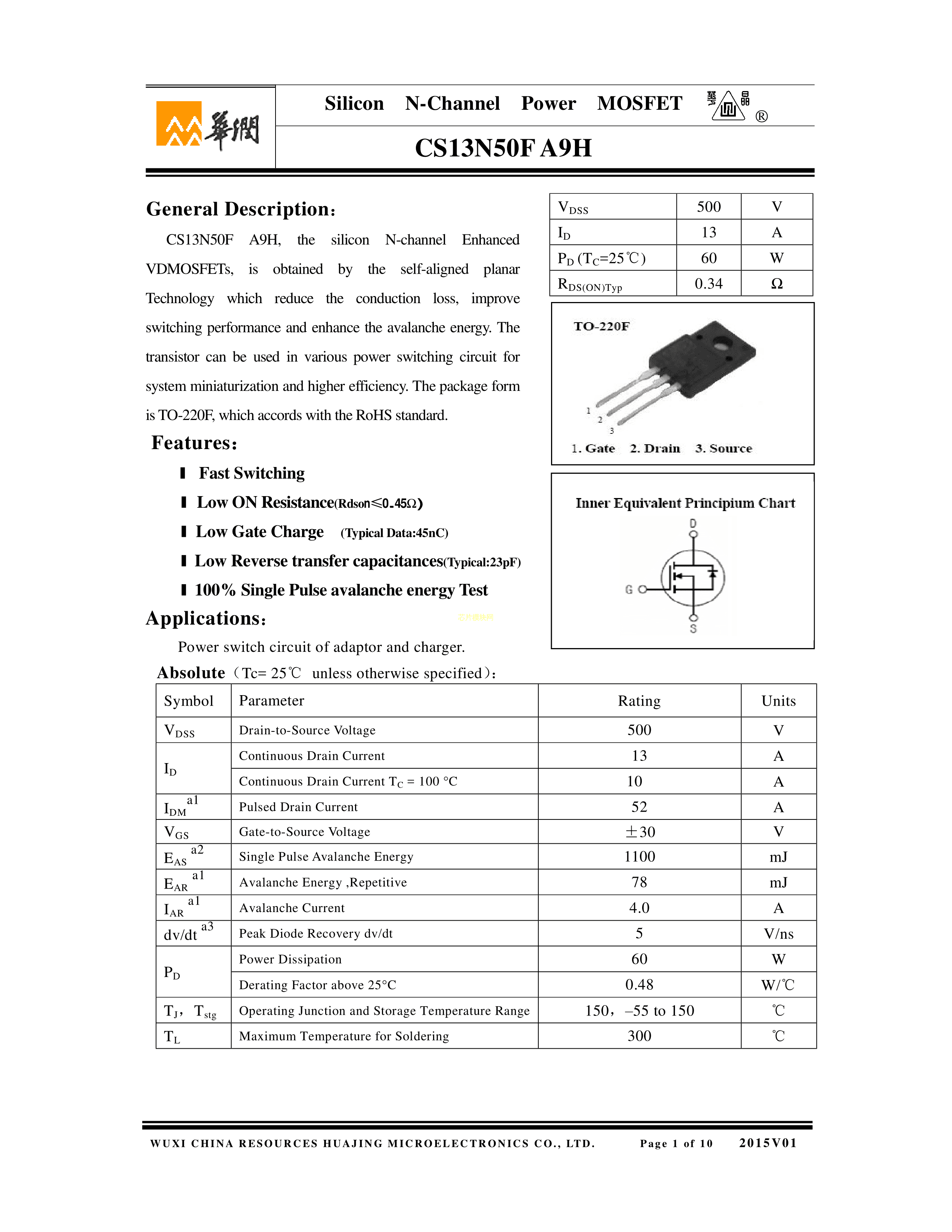 CS13N50FA9H数据手册TO-220F(TO-220IS)封装华润华晶PDF规格书,中英文下载