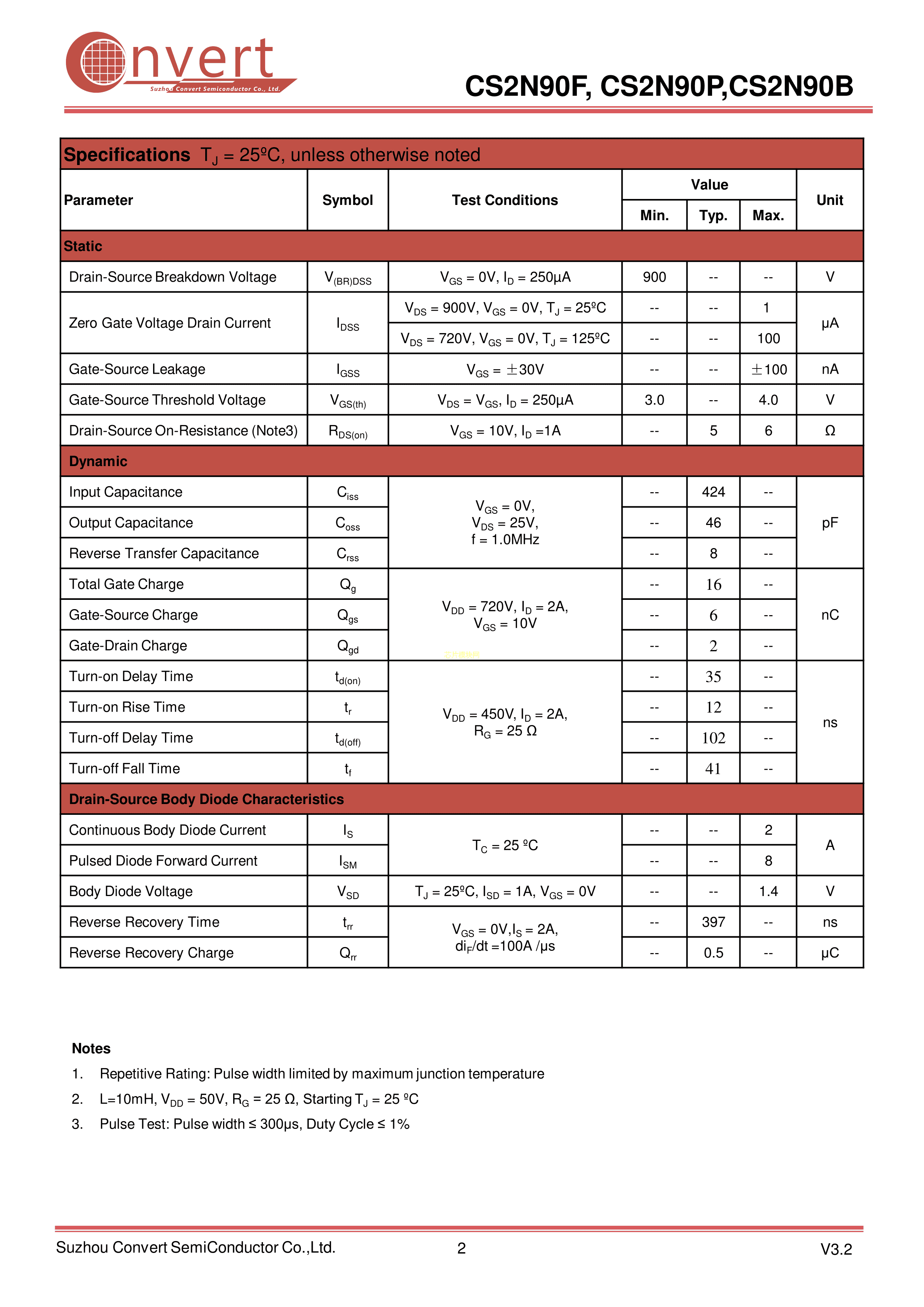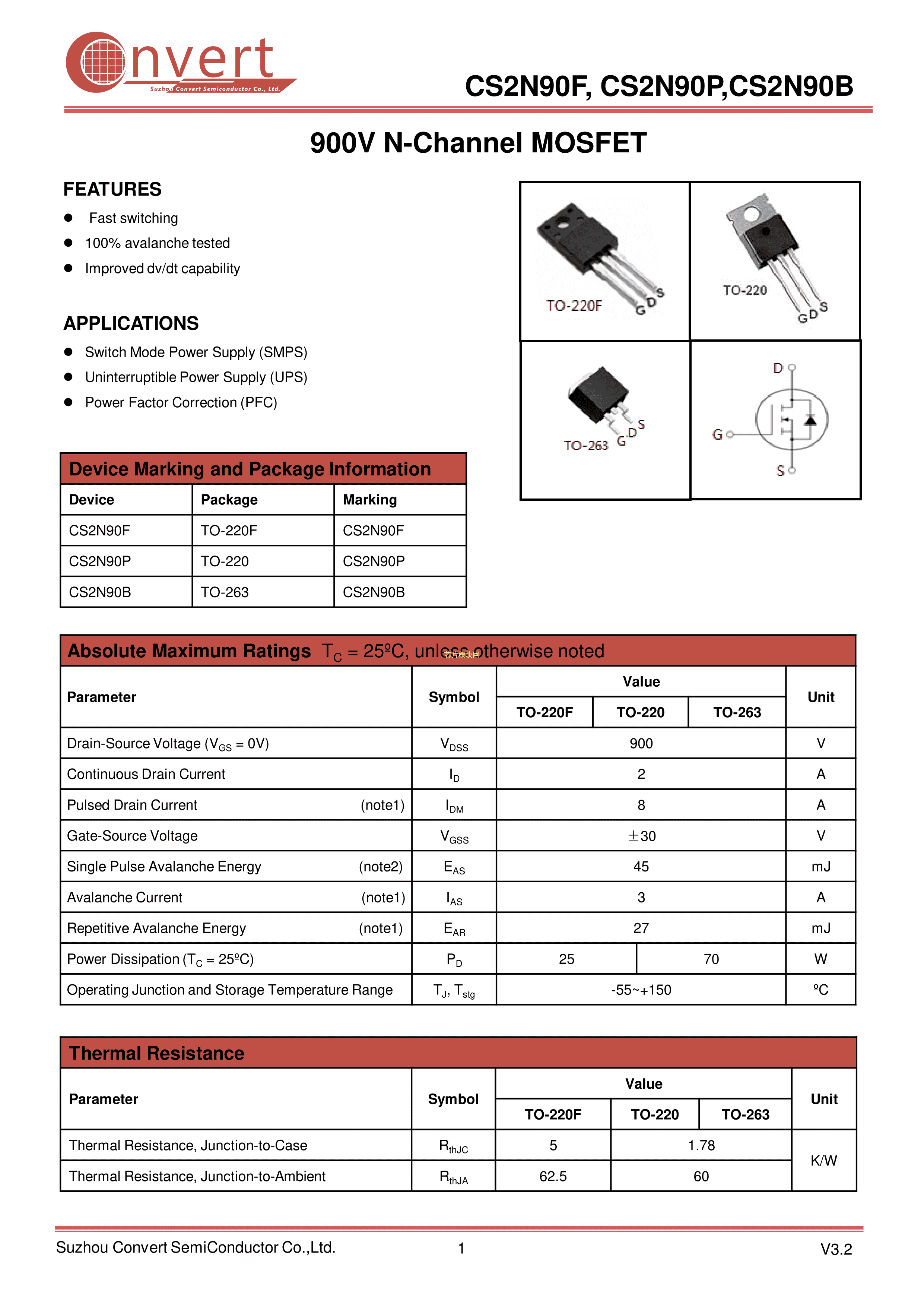 CS2N90P数据手册TO-220封装ConvertSemiconductor(锴威特半导体)PDF