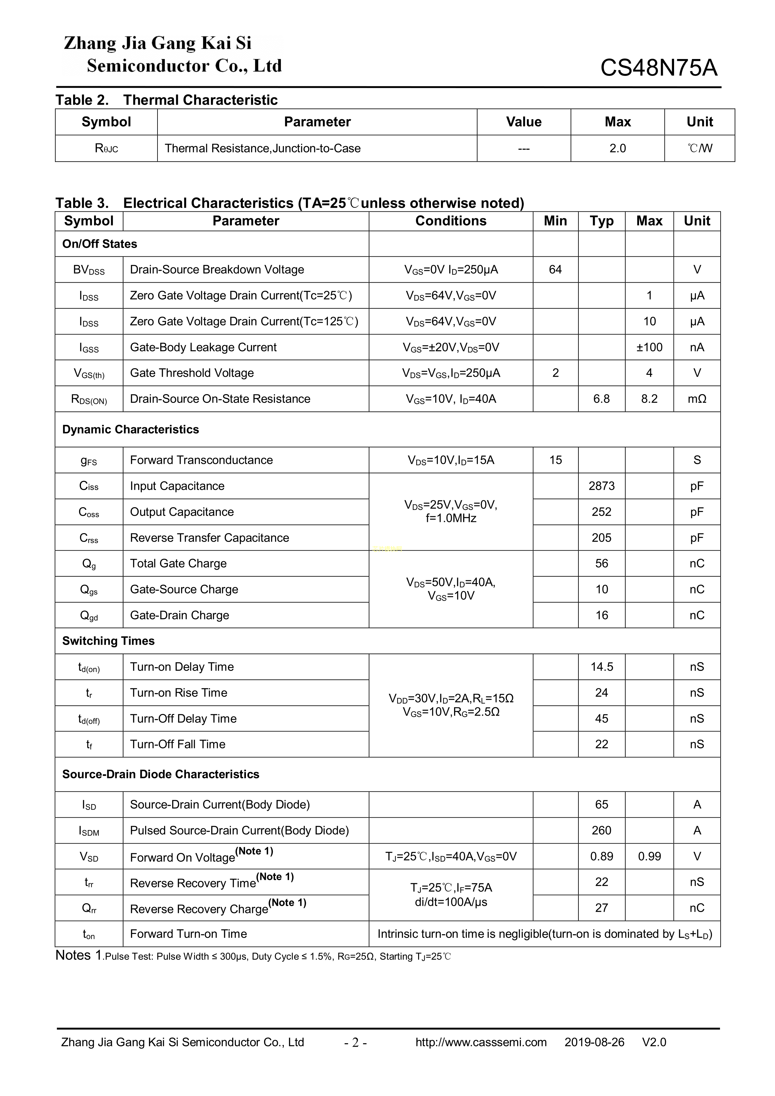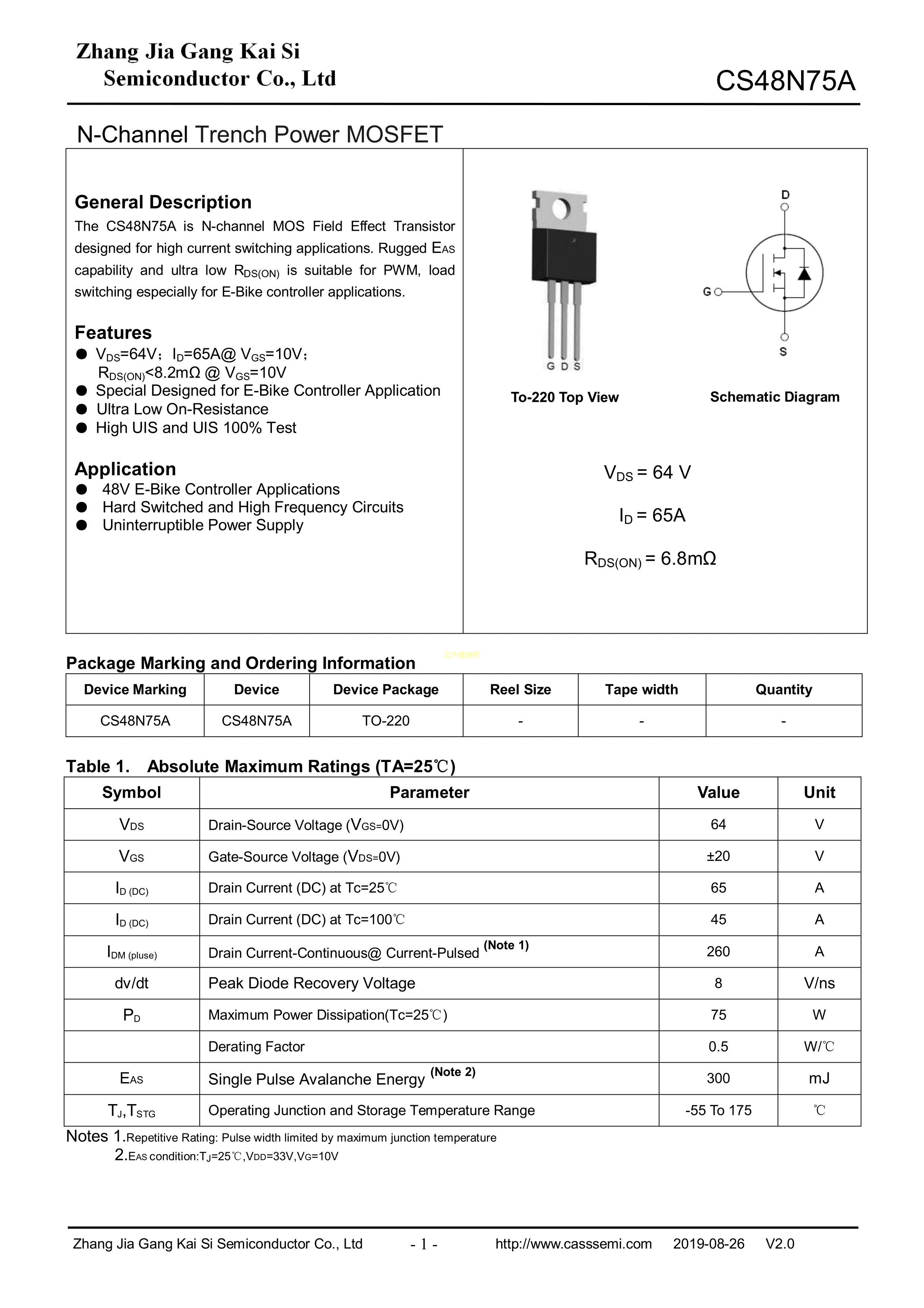 CS48N75A数据手册TO-220封装CASS(凯思)PDF规格书,中英文下载