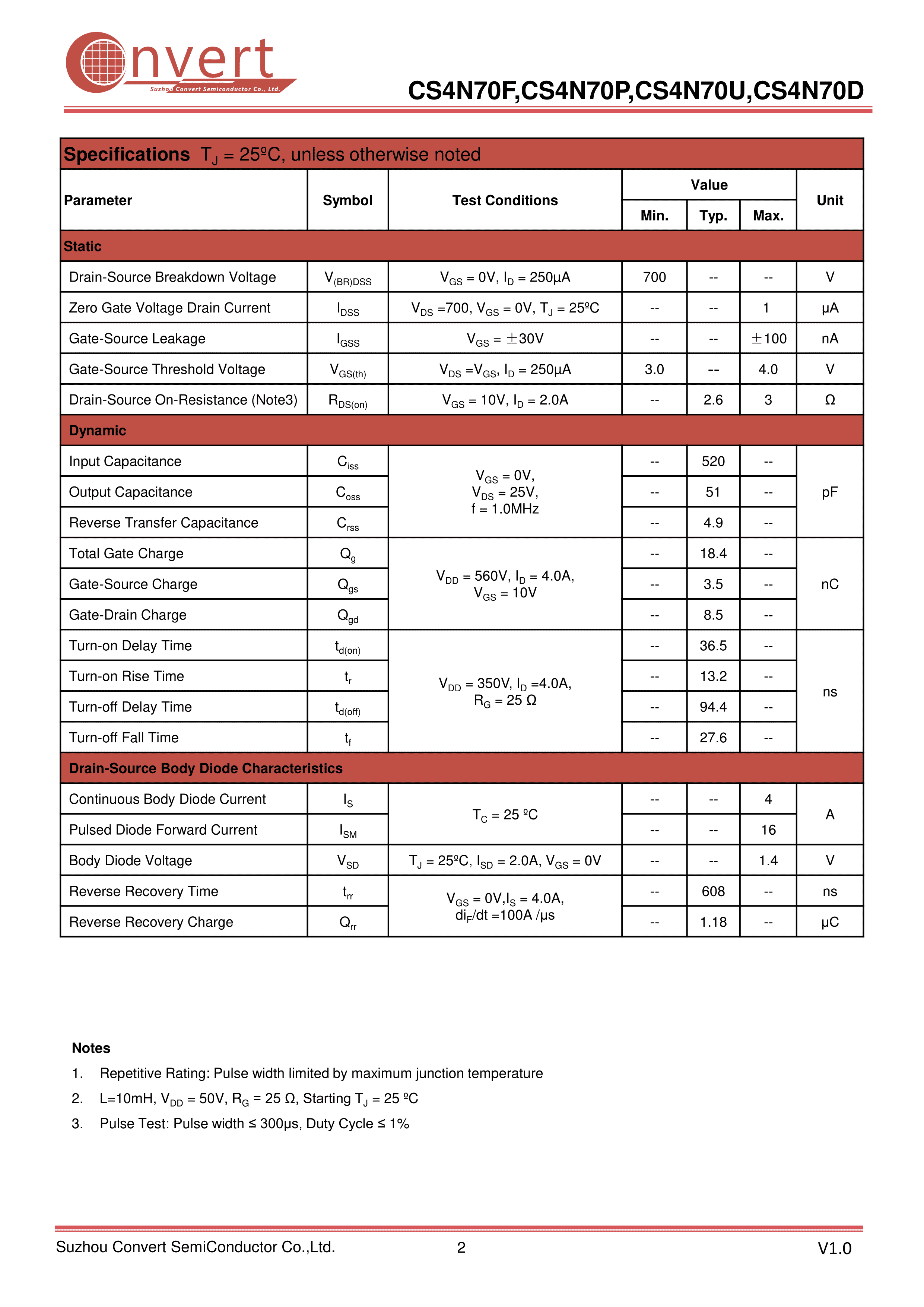 CS4N70F数据手册TO-220F封装Convert Semiconductor(锴威特半导体)P