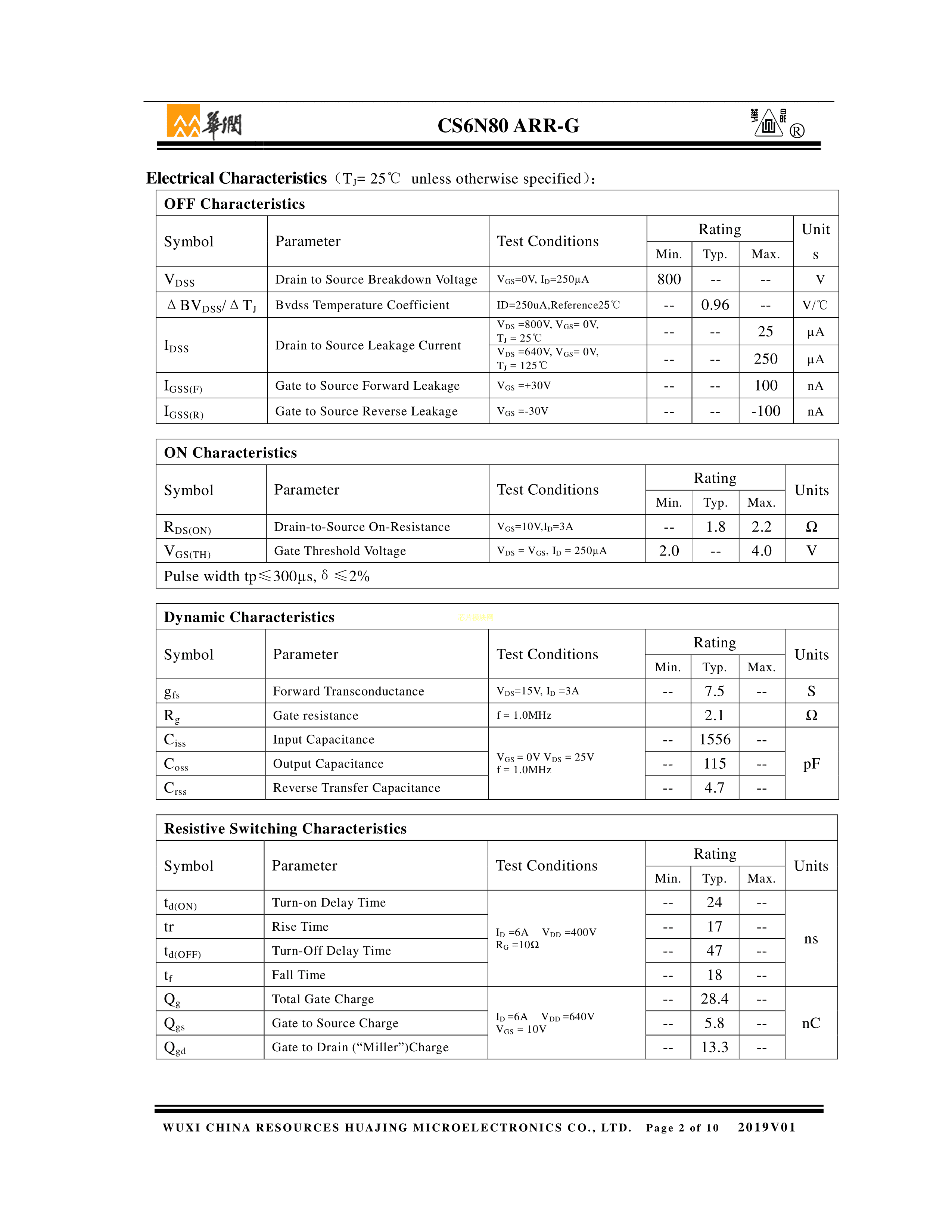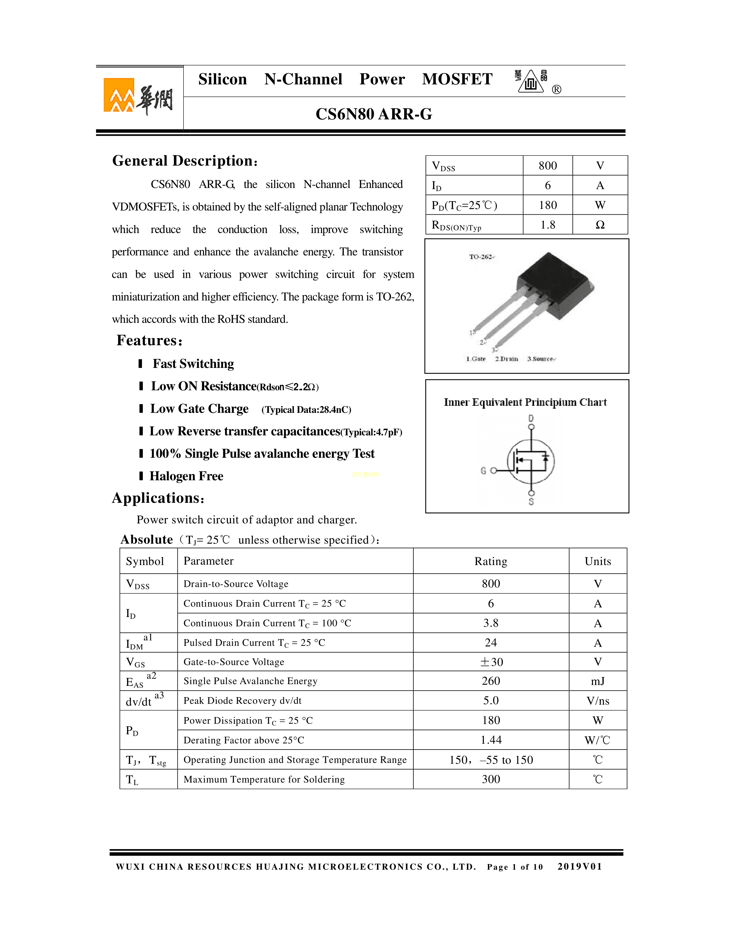 CS6N80ARR-G数据手册TO-262封装华润华晶PDF规格书,中英文下载
