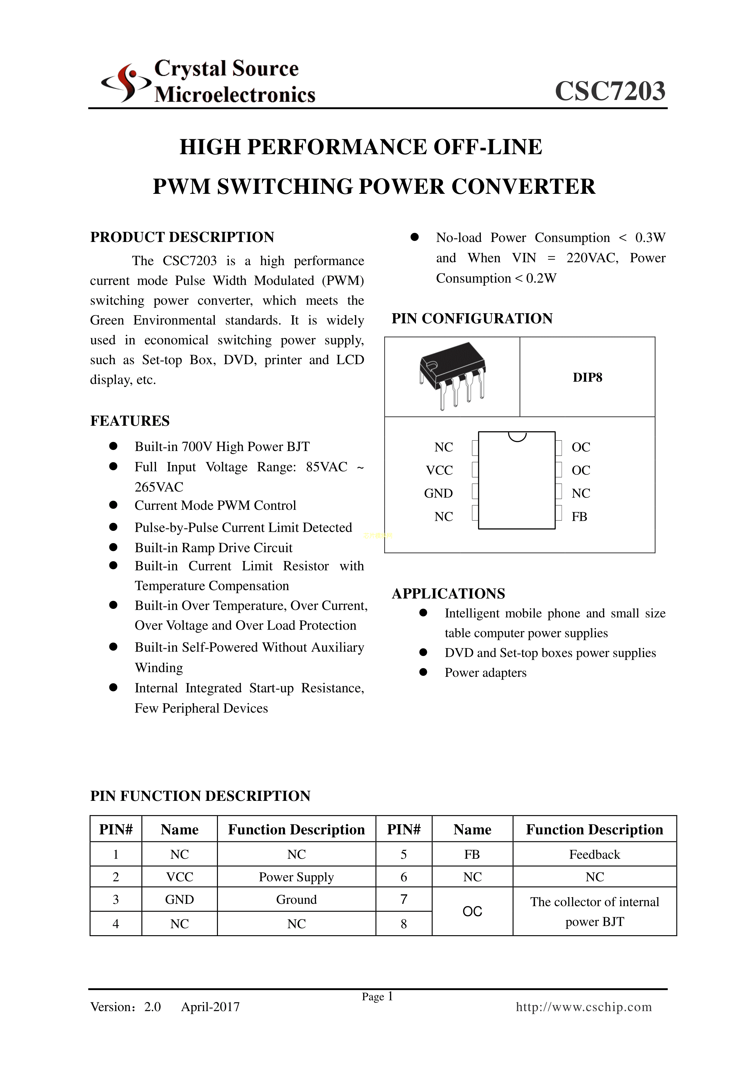 CSC7203数据手册DIP-8封装cschip(晶源微)PDF规格书,中英文下载