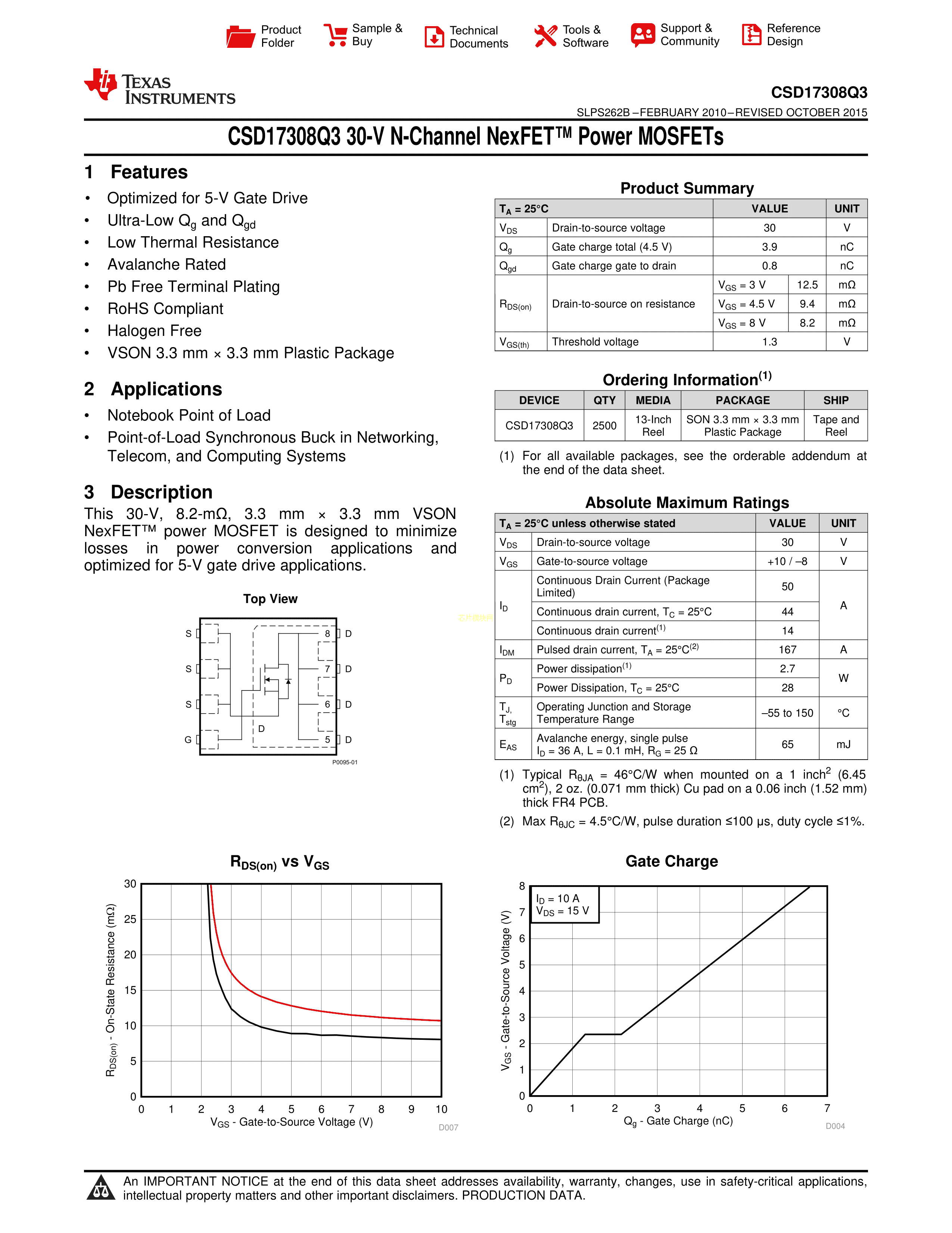 CSD17308Q3数据手册VSON-CLIP-8封装TI(德州仪器)PDF规格书,中英文下载