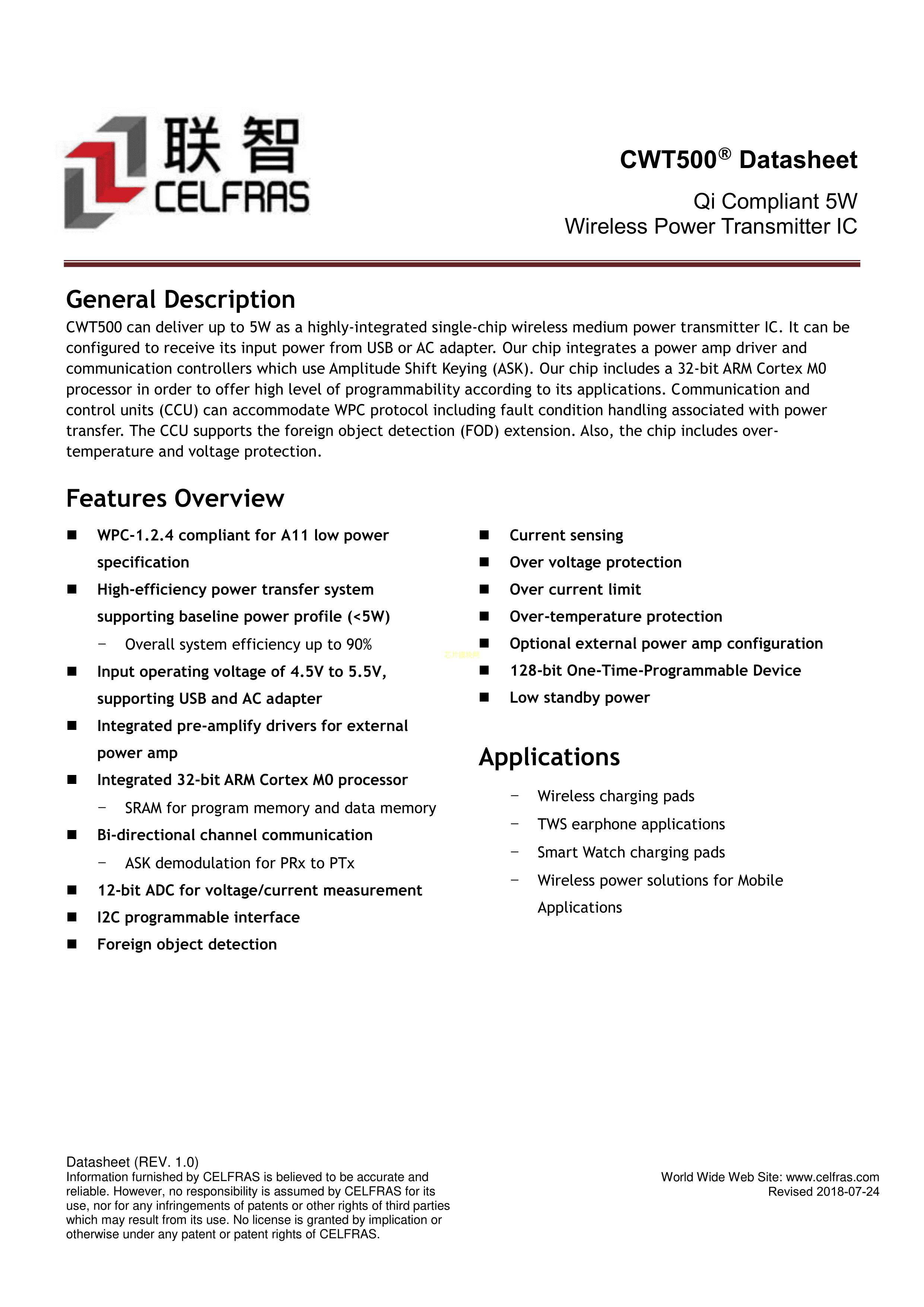 CWT500数据手册QFN5x5封装Celfras(联智)PDF规格书,中英文下载