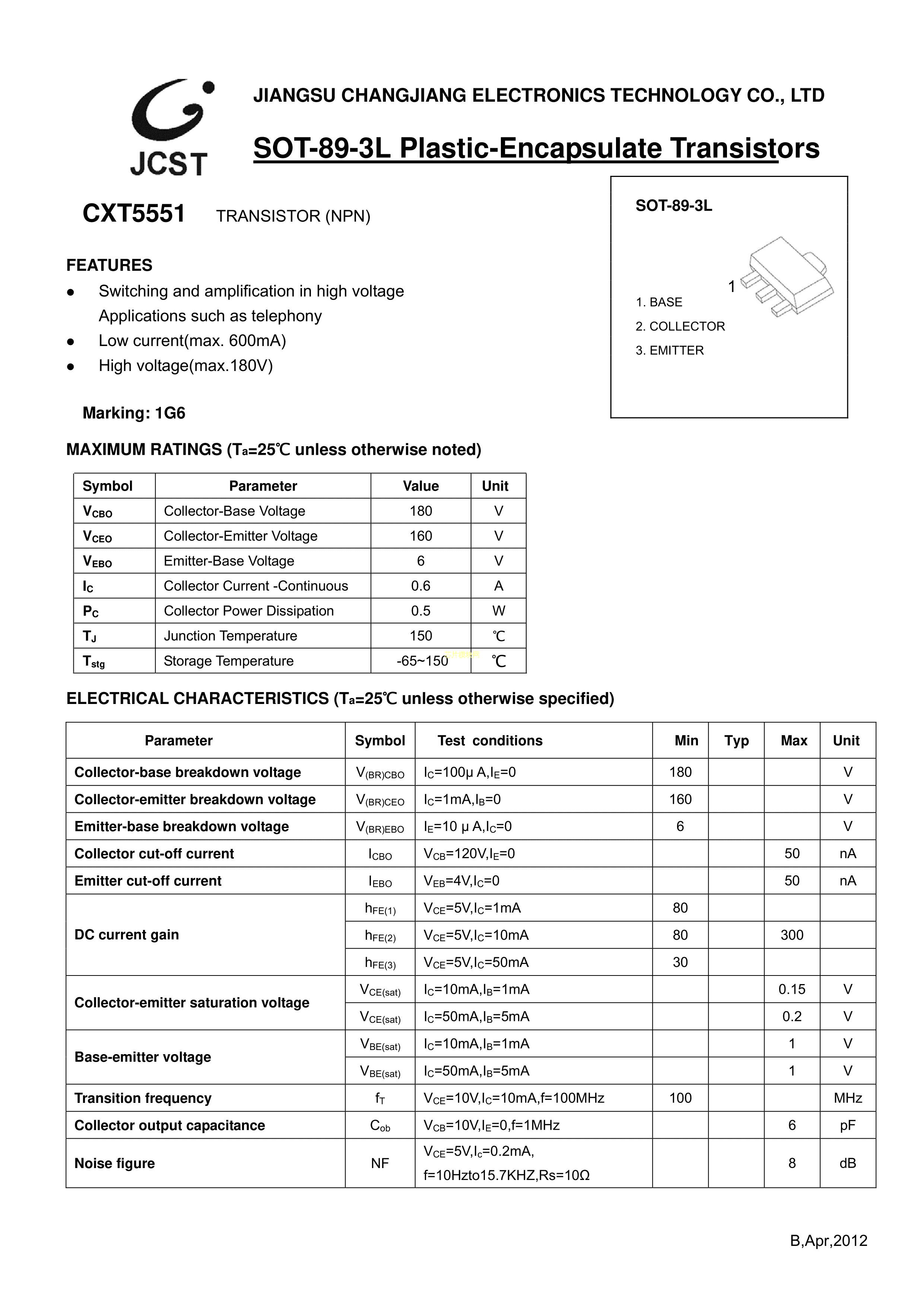CXT5551数据手册SOT-89(SOT-89-3)封装CJ(江苏长电-长晶)PDF规格书,中英文