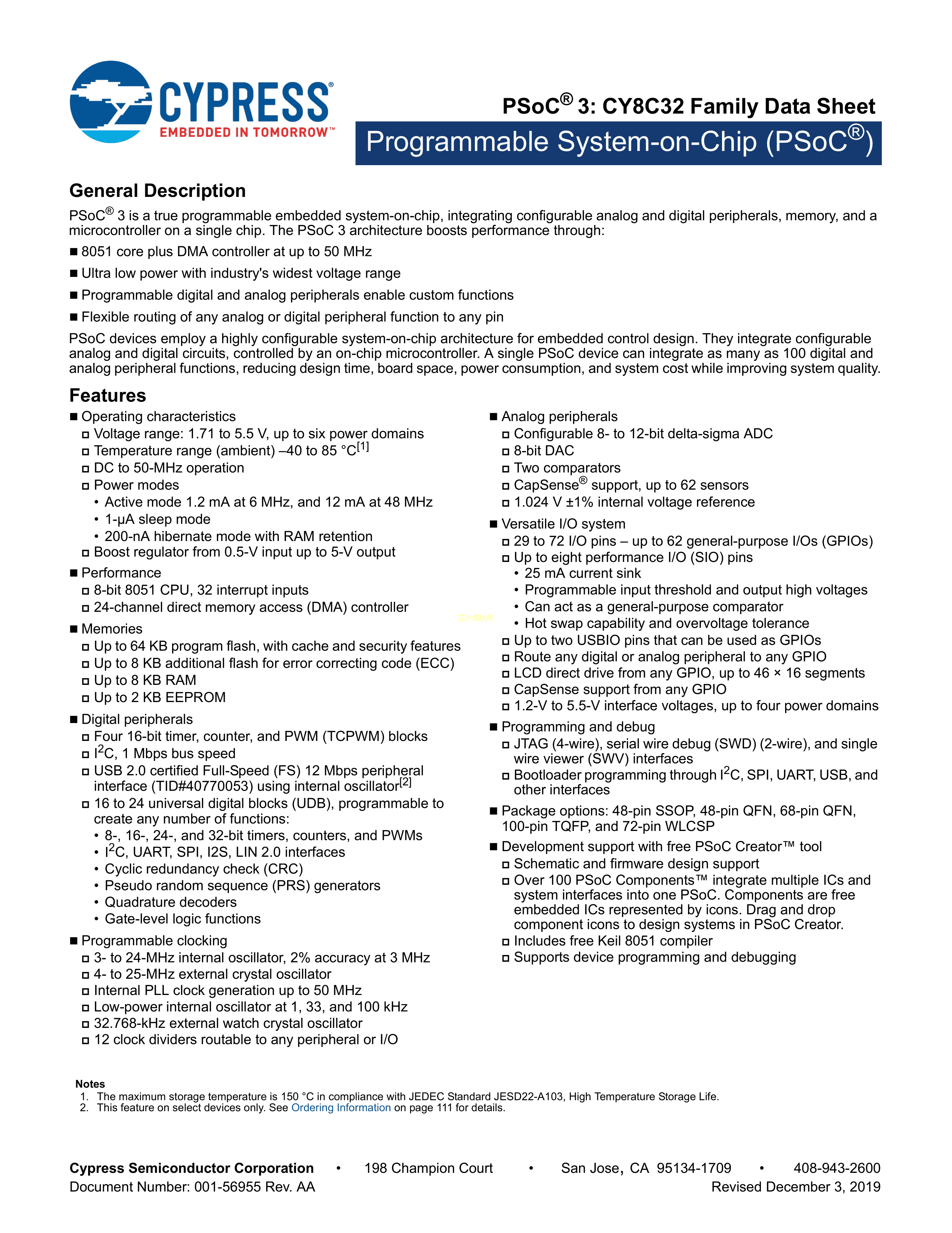 CY8C3246AXI-131数据手册TQFP-100封装CYPRESS(赛普拉斯)PDF规格书,中