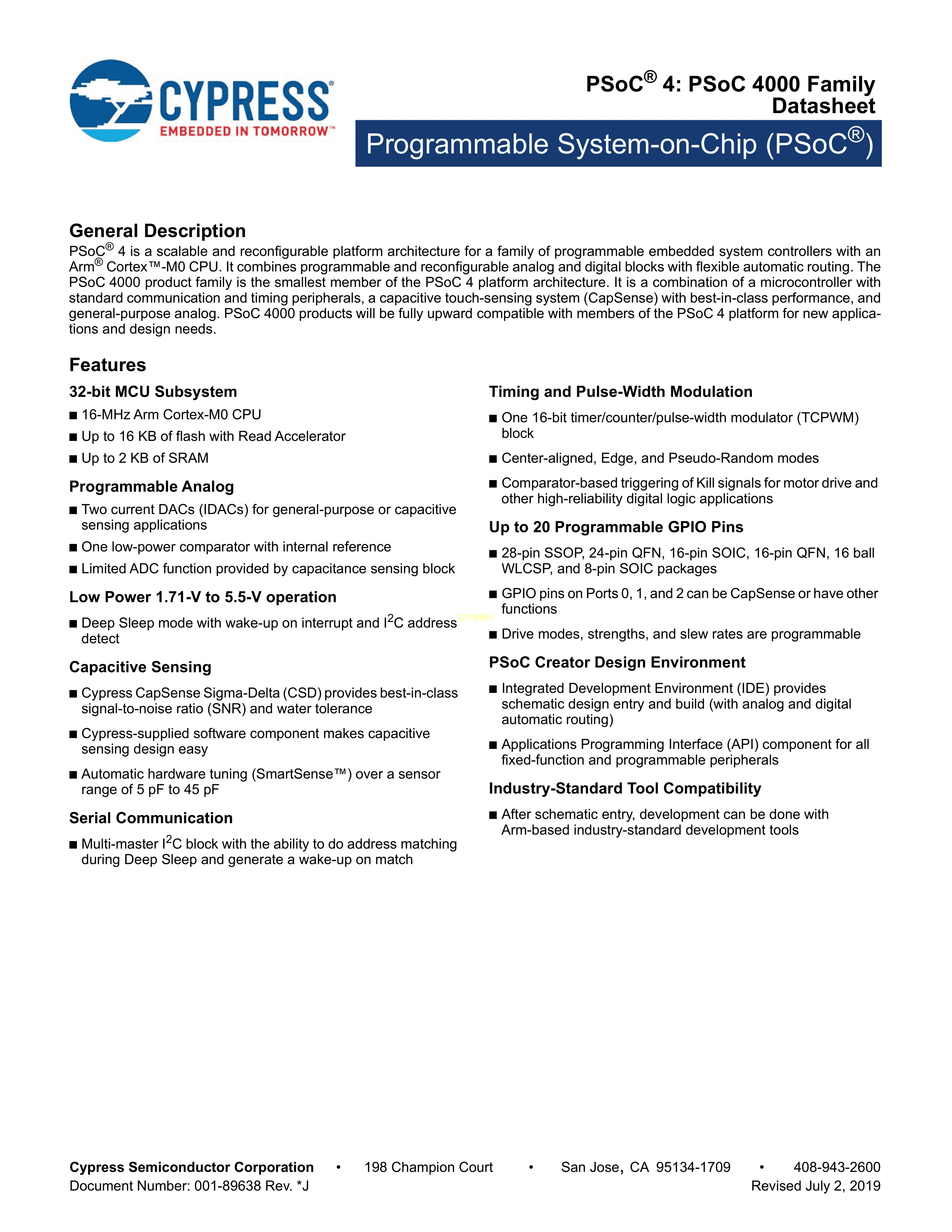 CY8C4014LQI-412数据手册SQFN-24(4x4)封装SPANSION(飞索)PDF规格