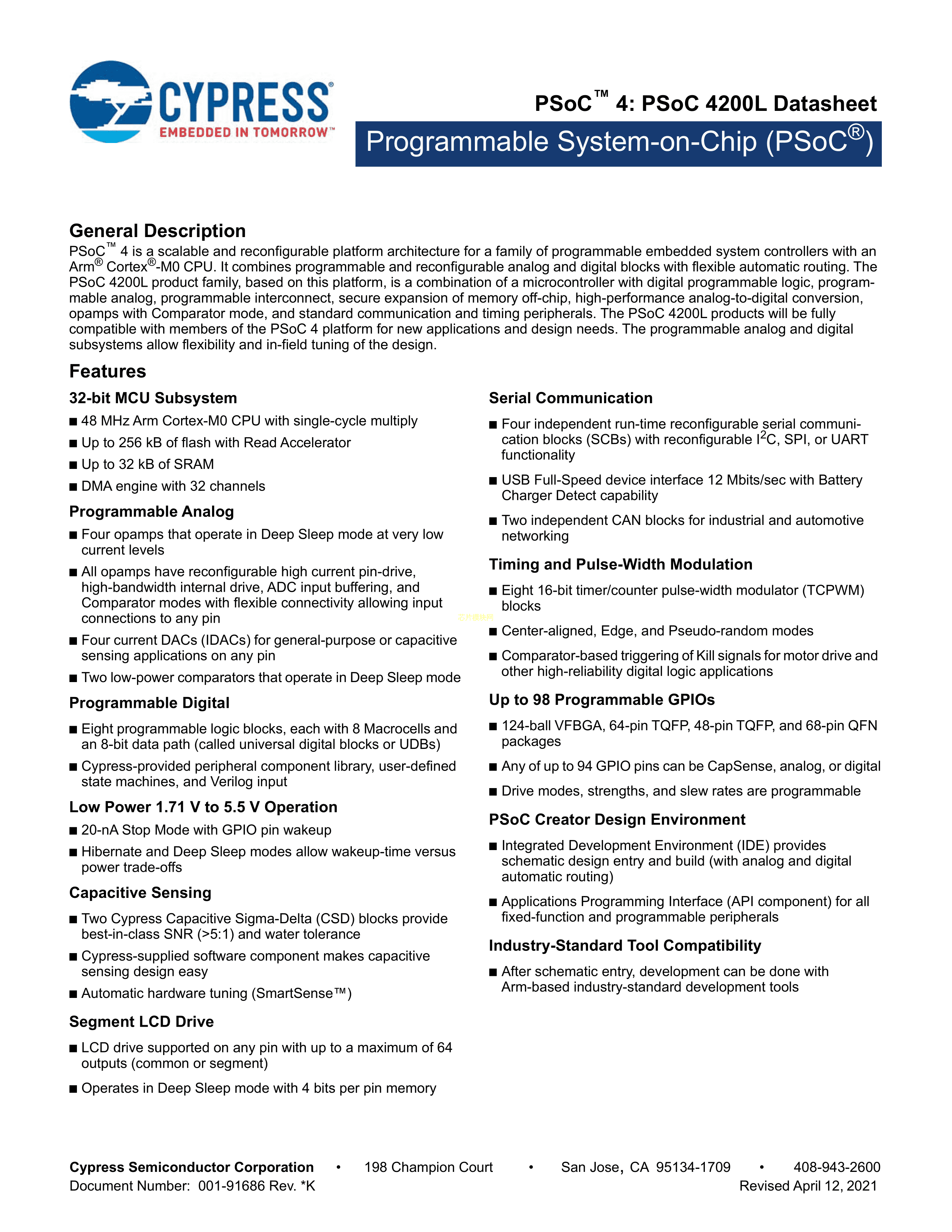 CY8C4248LTI-L475数据手册QFN-68(8x8)封装SPANSION(飞索)PDF规格