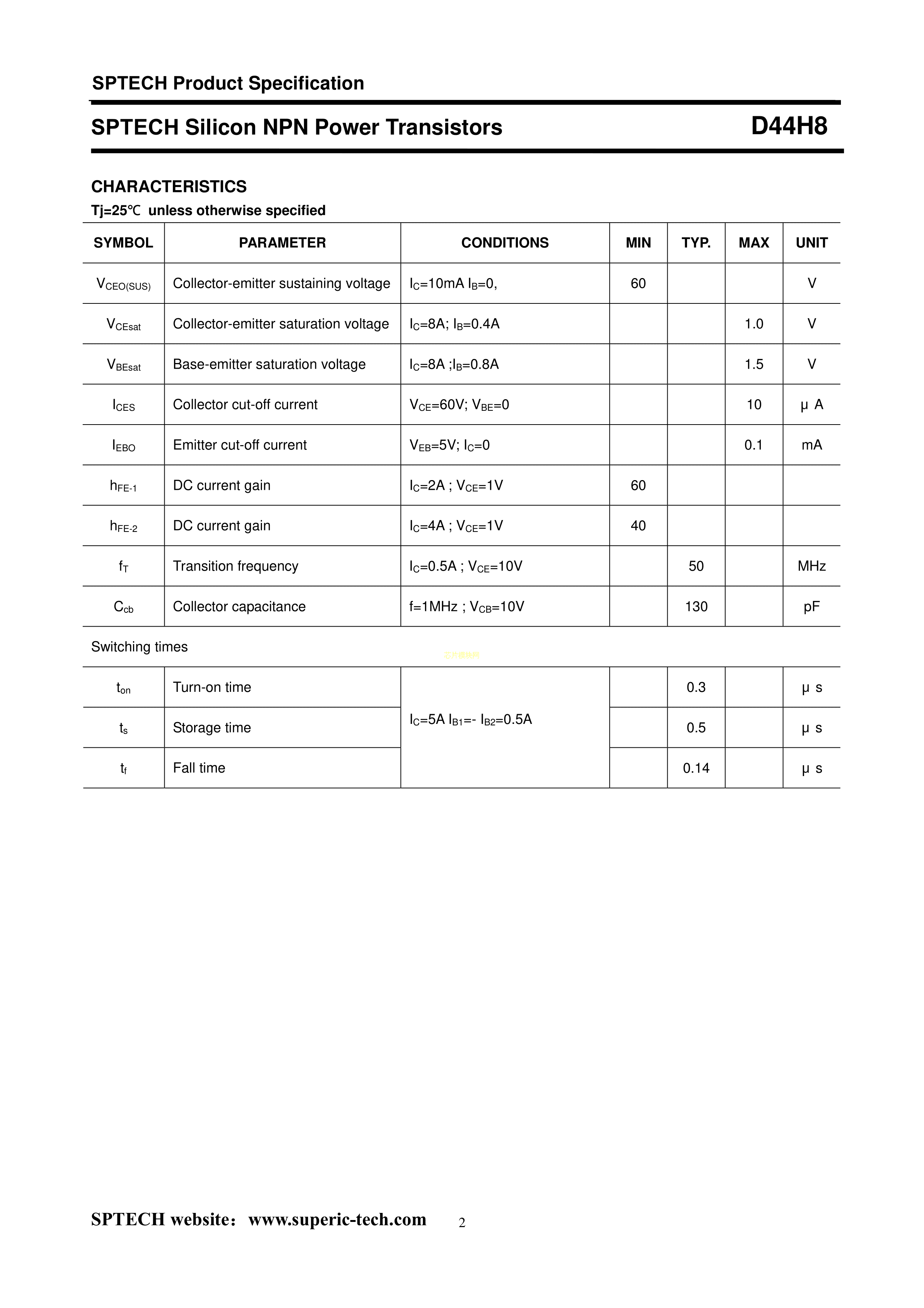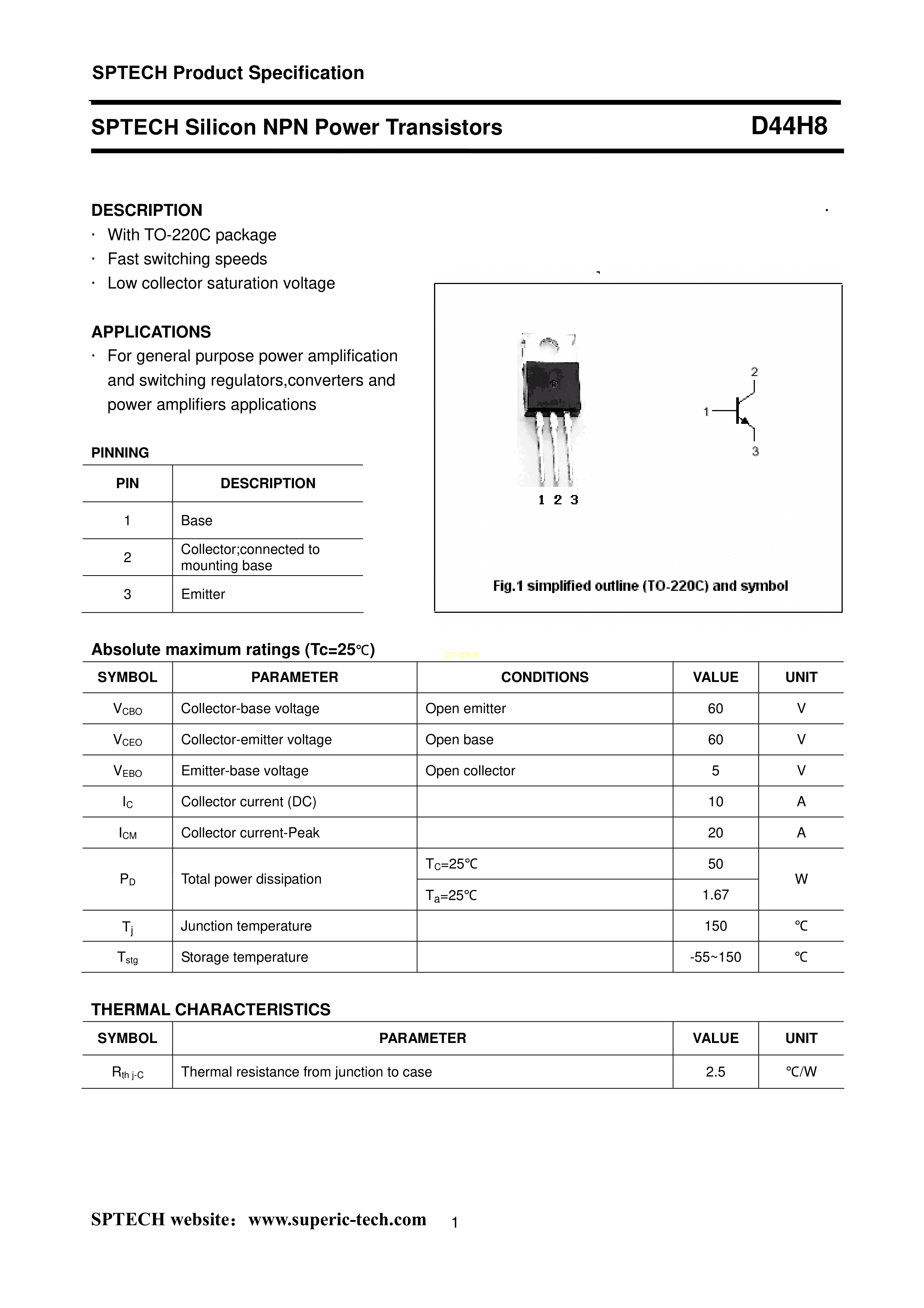 D44H8数据手册TO-220C封装SPTECH(深圳质超)PDF规格书,中英文下载