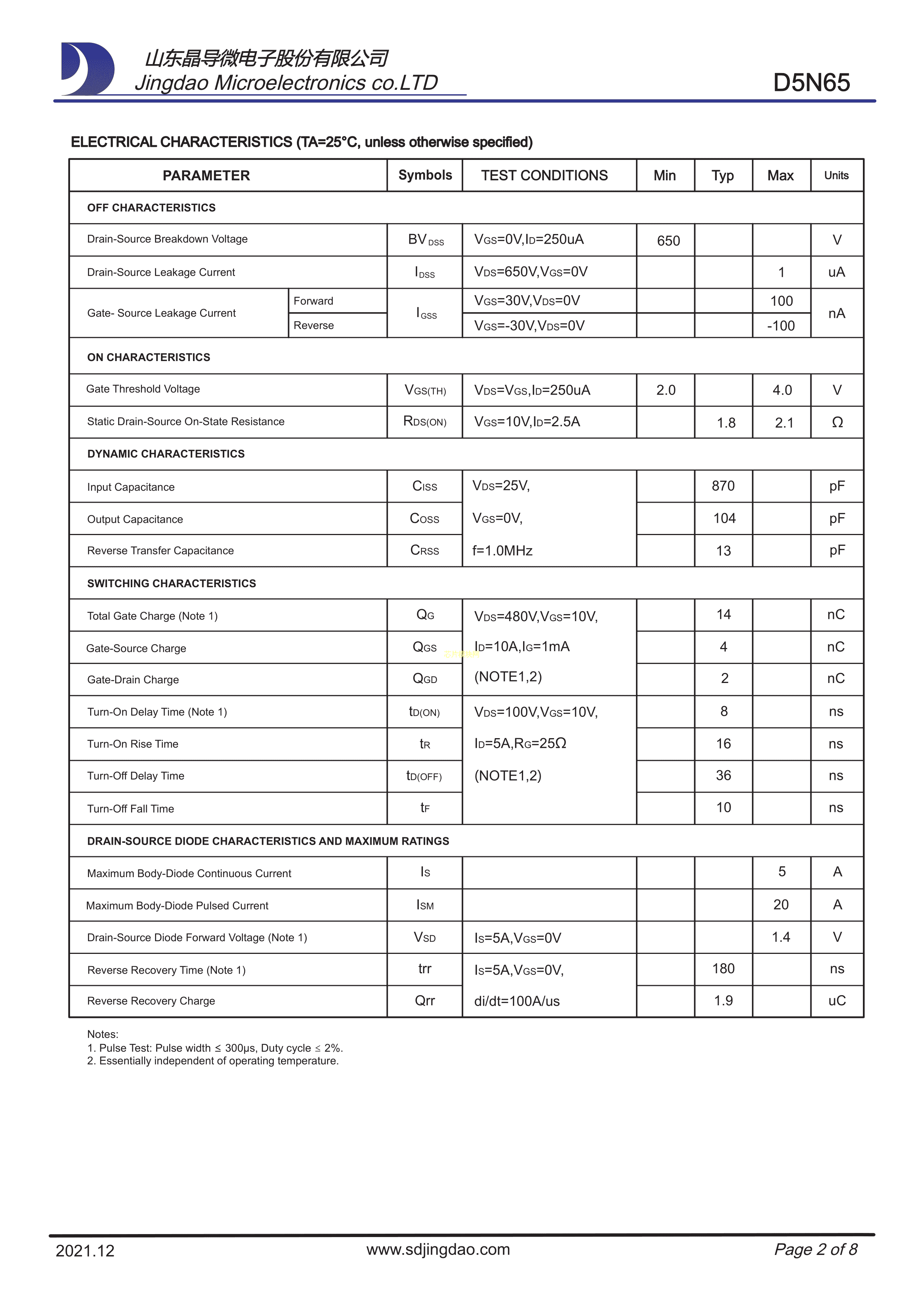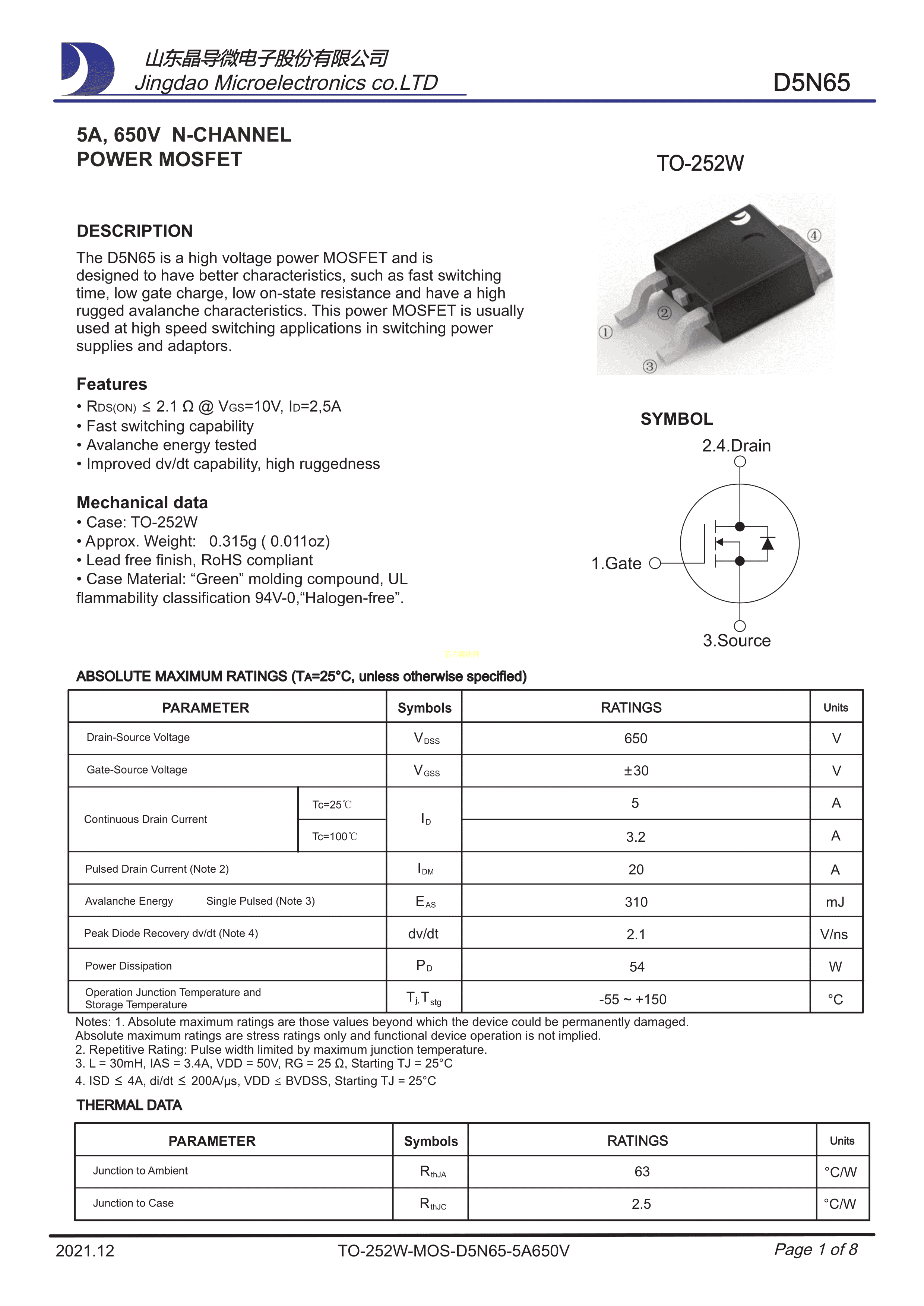 D5N65数据手册TO-252W封装晶导微电子PDF规格书,中英文下载
