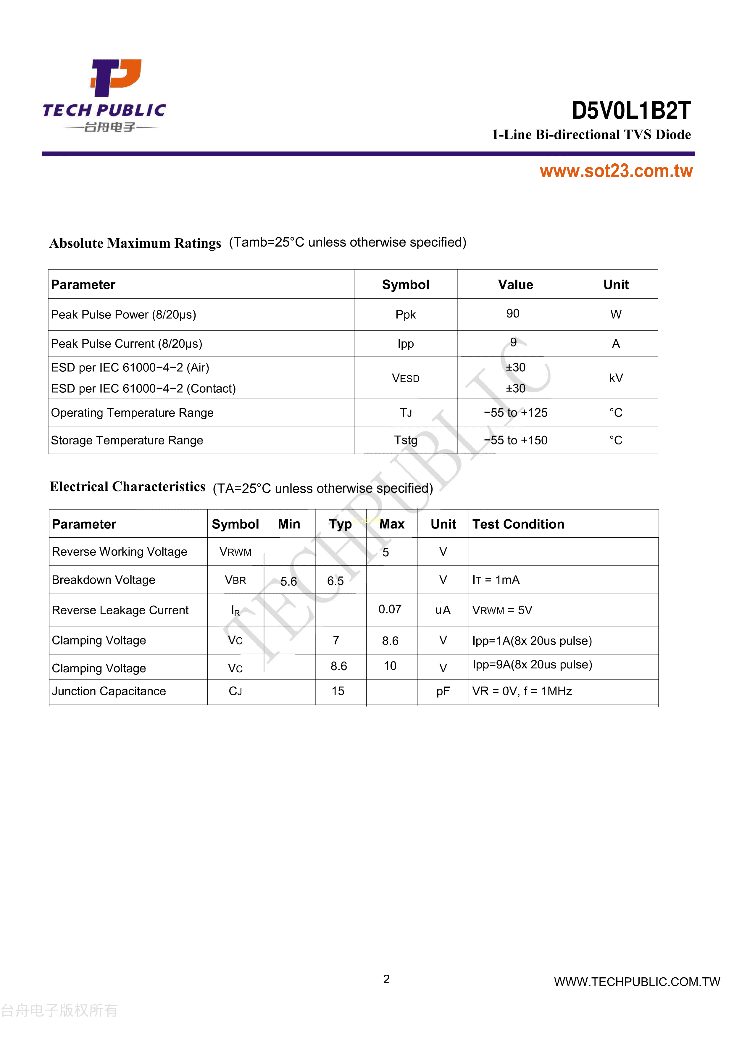 D5V0L1B2T数据手册SOD-523封装TECHPUBLIC(台舟)PDF规格书,中英文下载