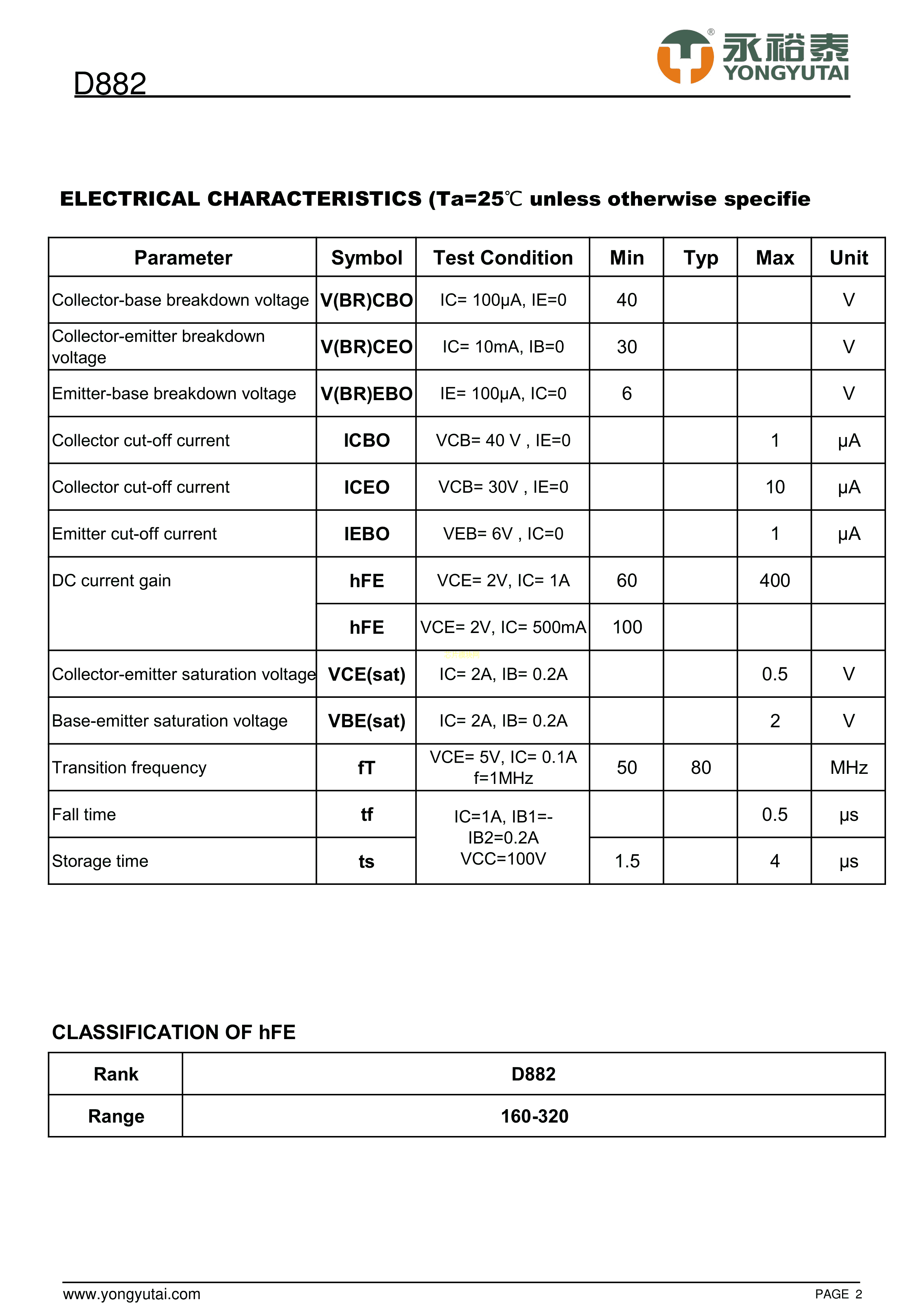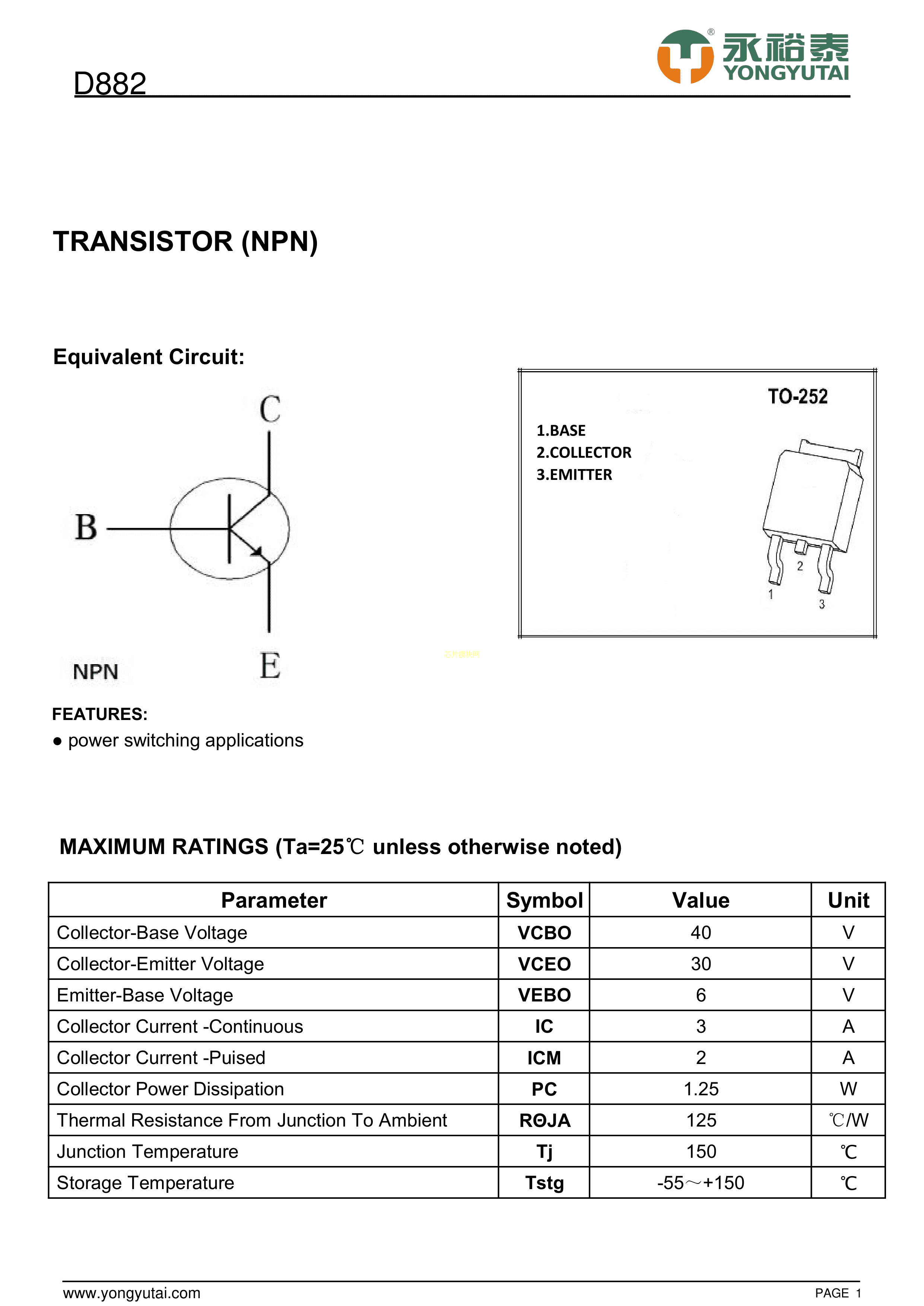 D882数据手册TO-252封装YONGYUTAI(永裕泰)PDF规格书,中英文下载