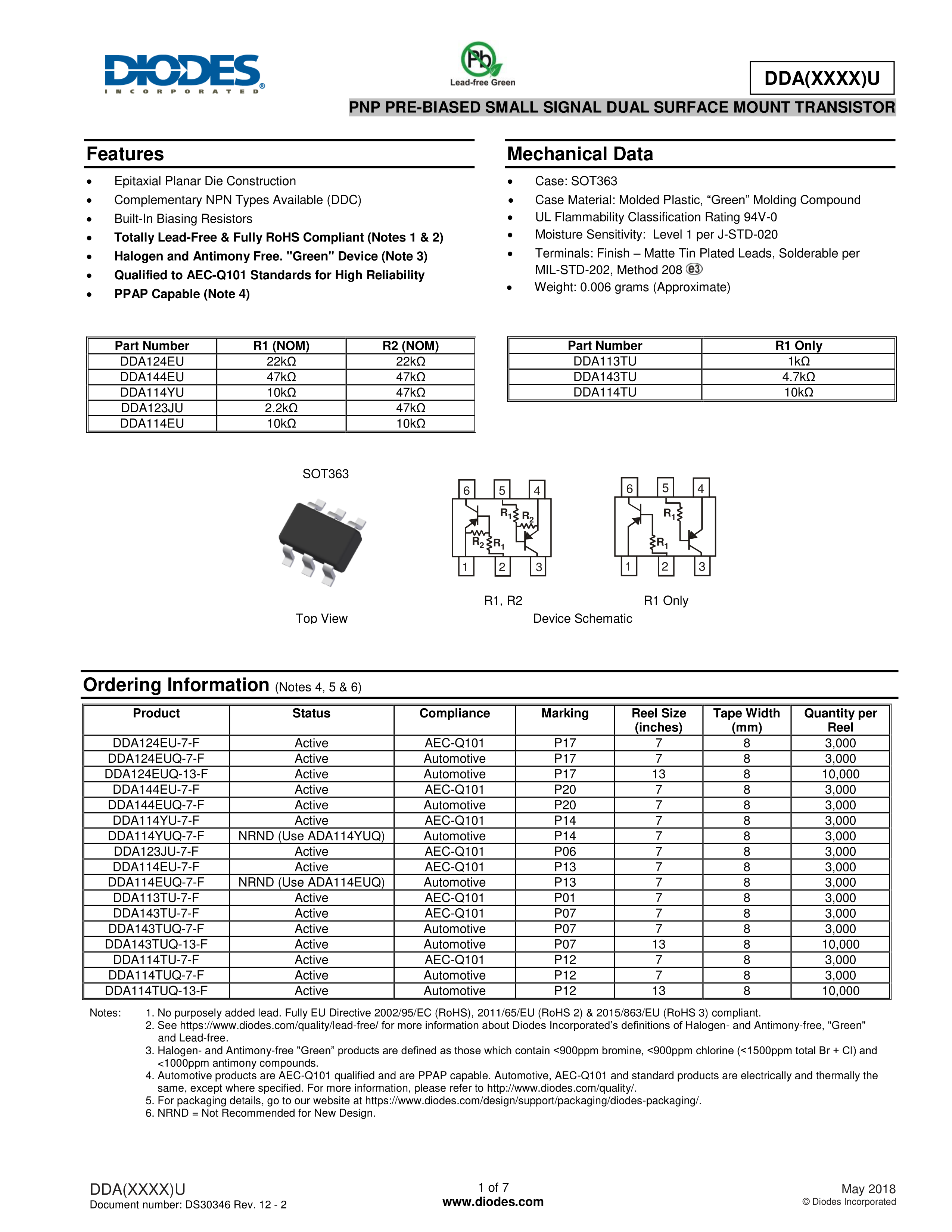 DDA144EU-7-F数据手册SOT-363封装DIODES(美台)PDF规格书,中英文下载