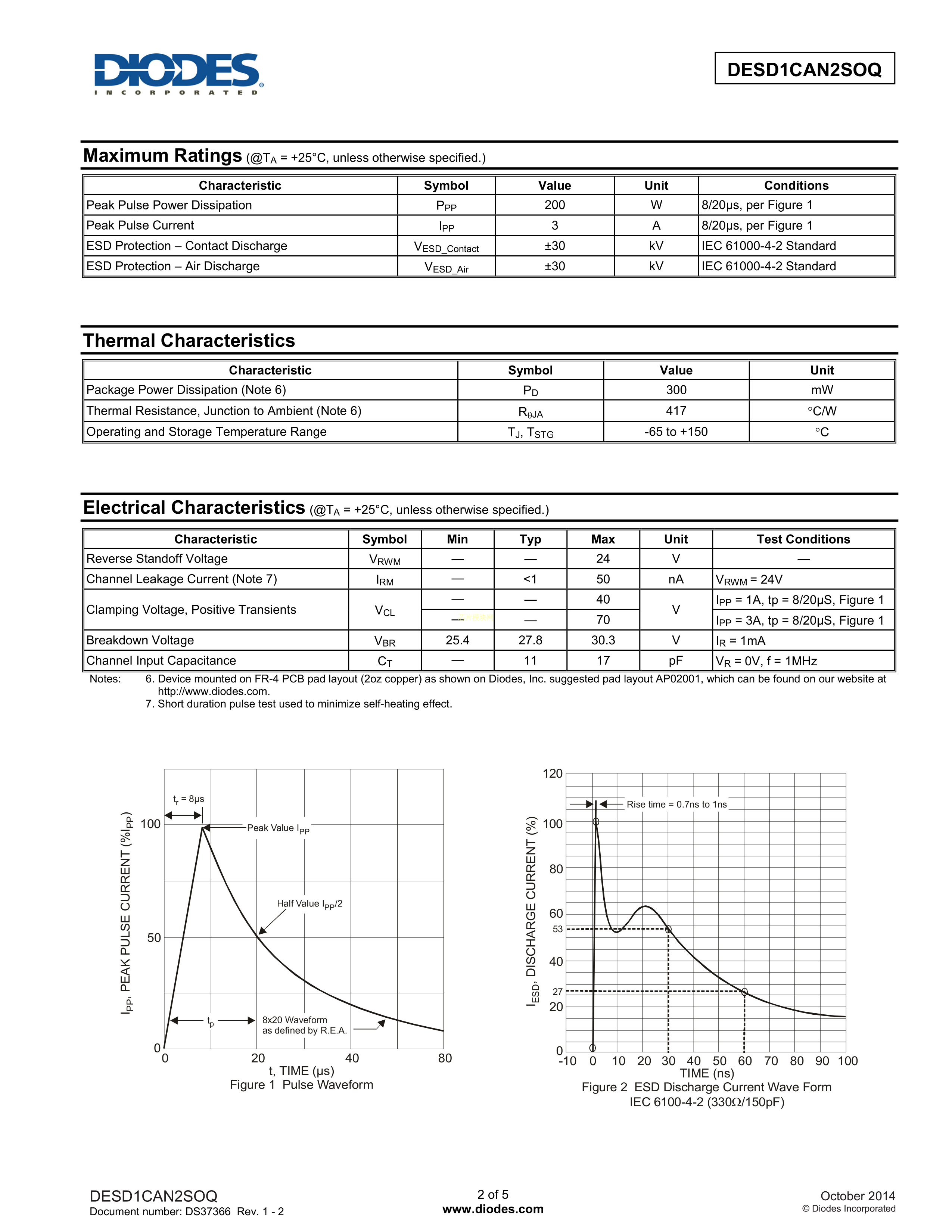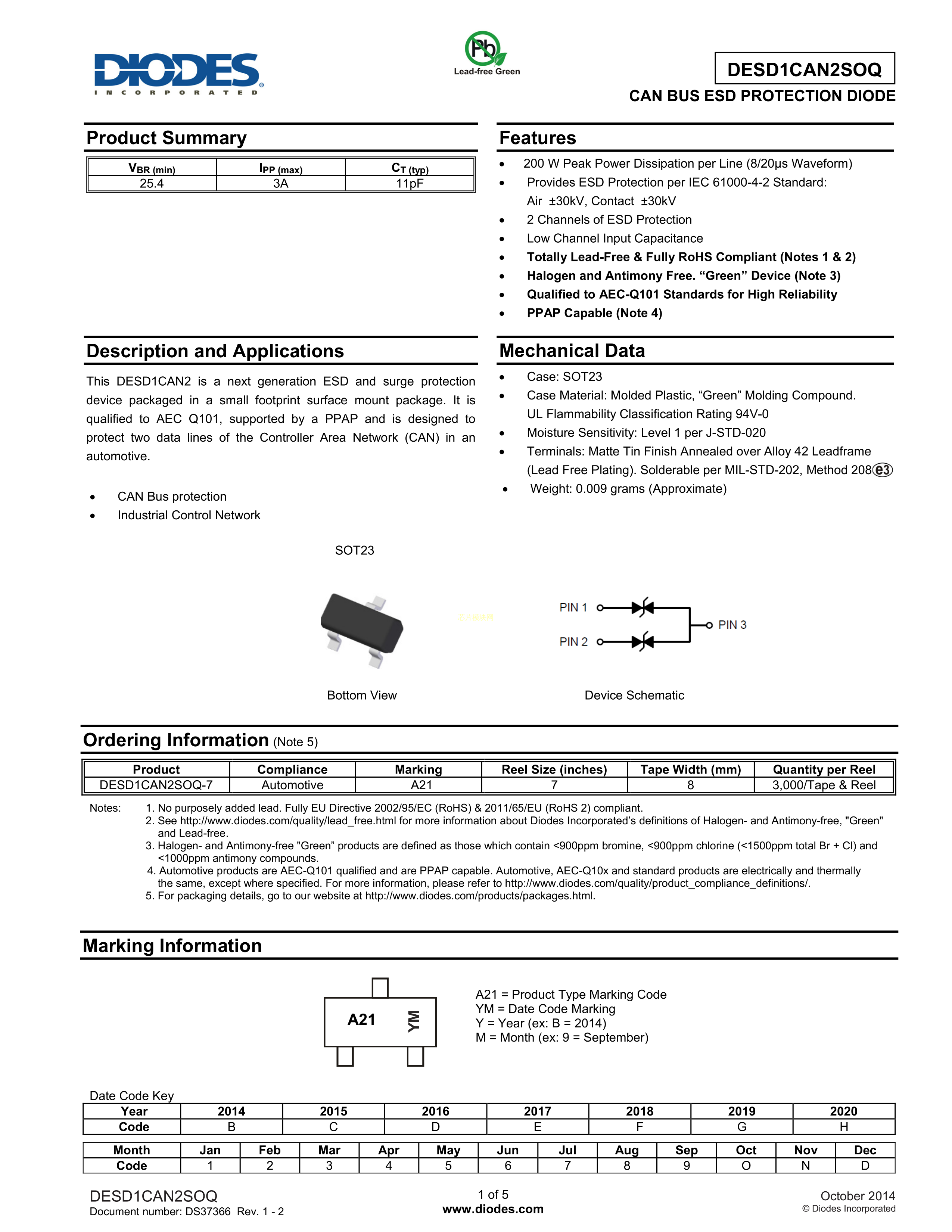 DESD1CAN2SOQ-7数据手册SOT-23封装DIODES(美台)PDF规格书,中英文下载