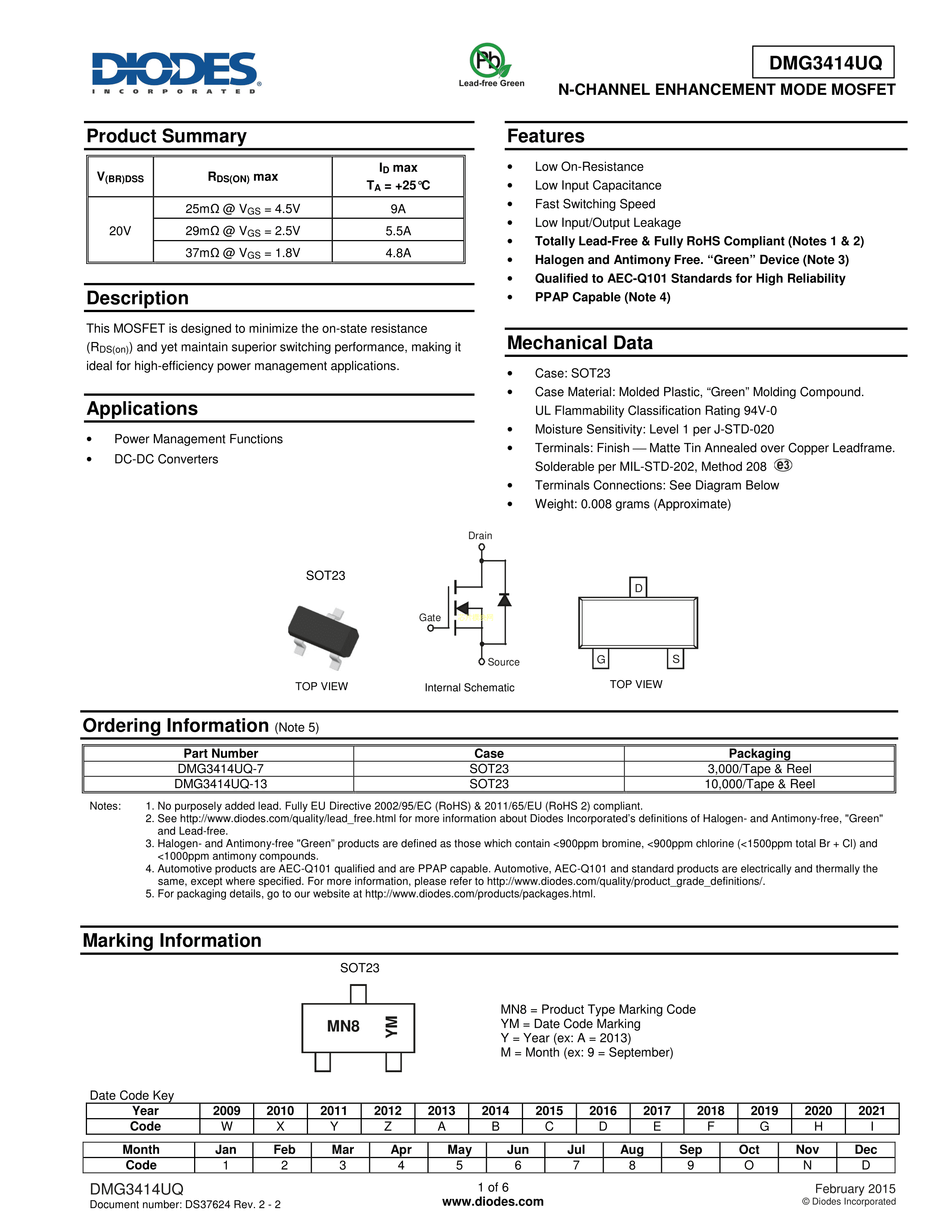 DMG3414UQ-7数据手册SOT-23封装DIODES(美台)PDF规格书,中英文下载