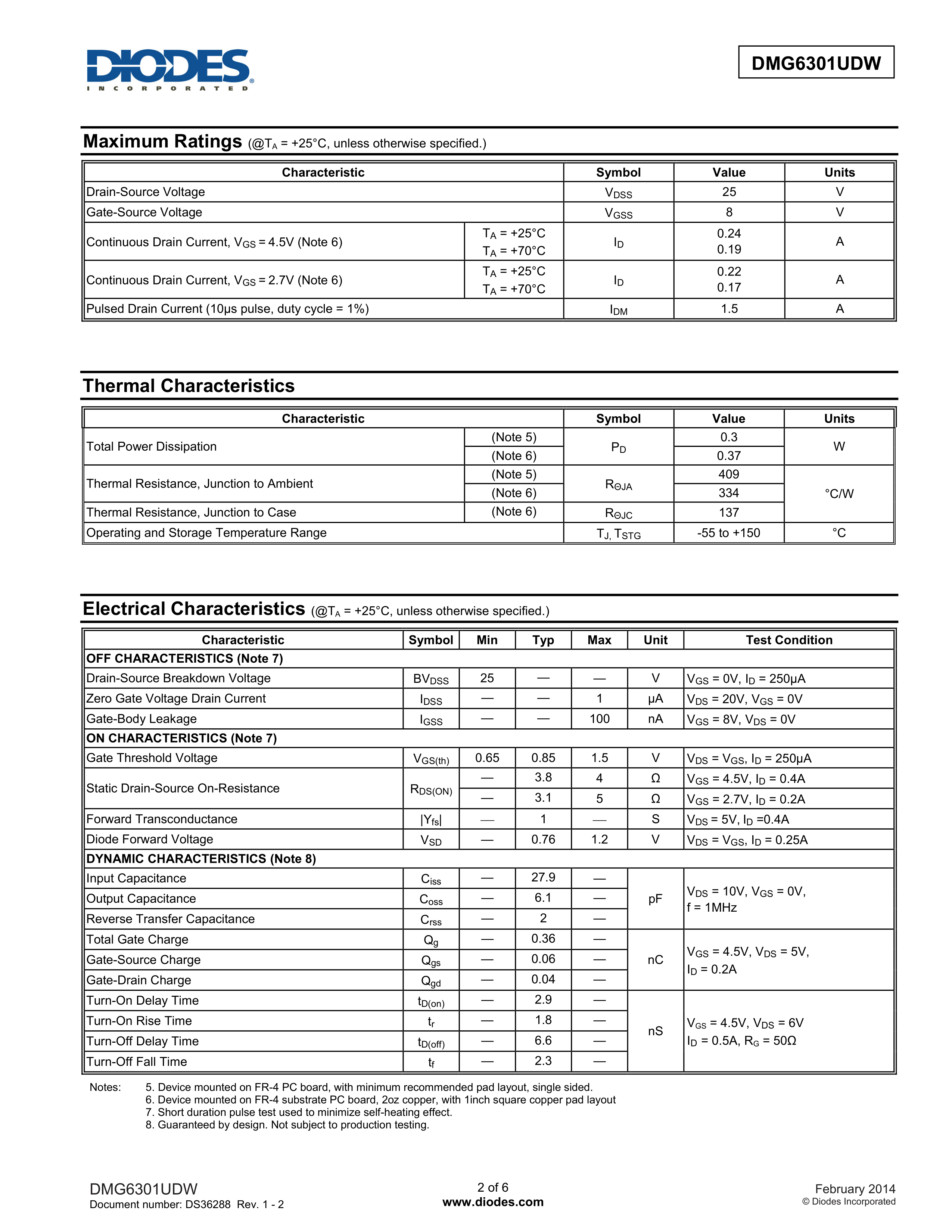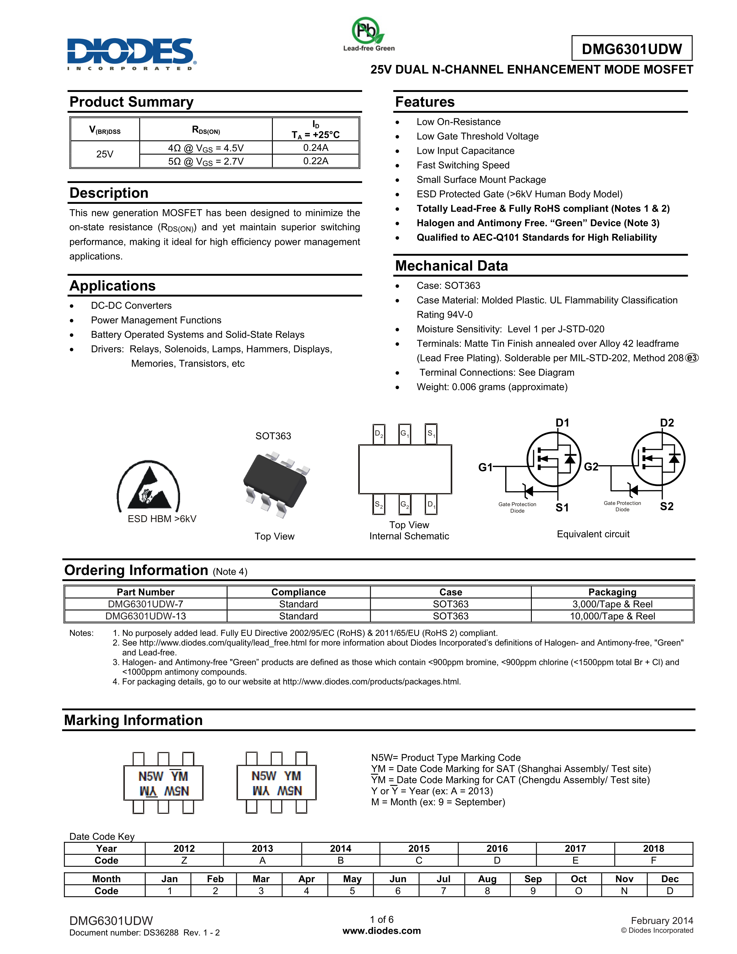 DMG6301UDW-7数据手册SOT-363封装DIODES(美台)PDF规格书,中英文下载