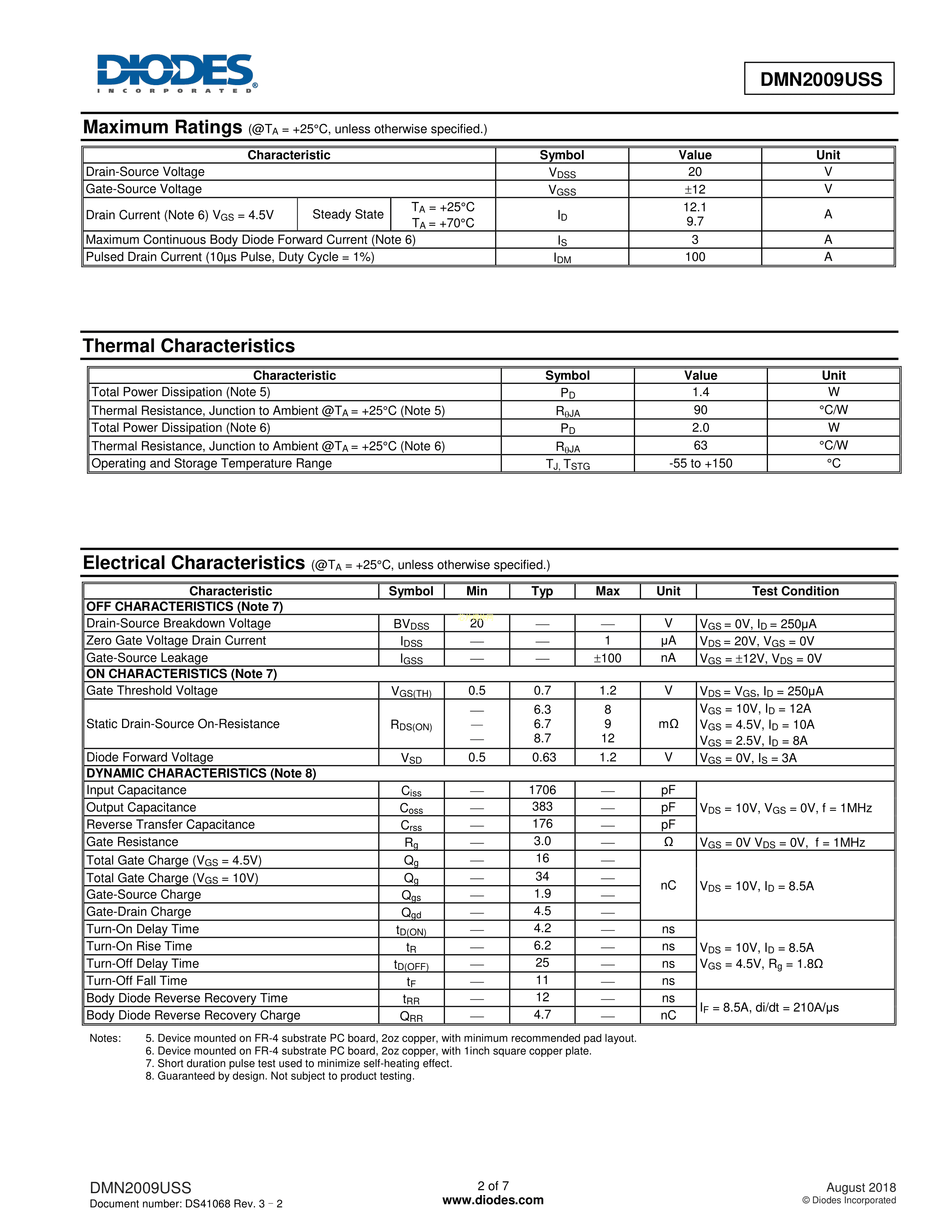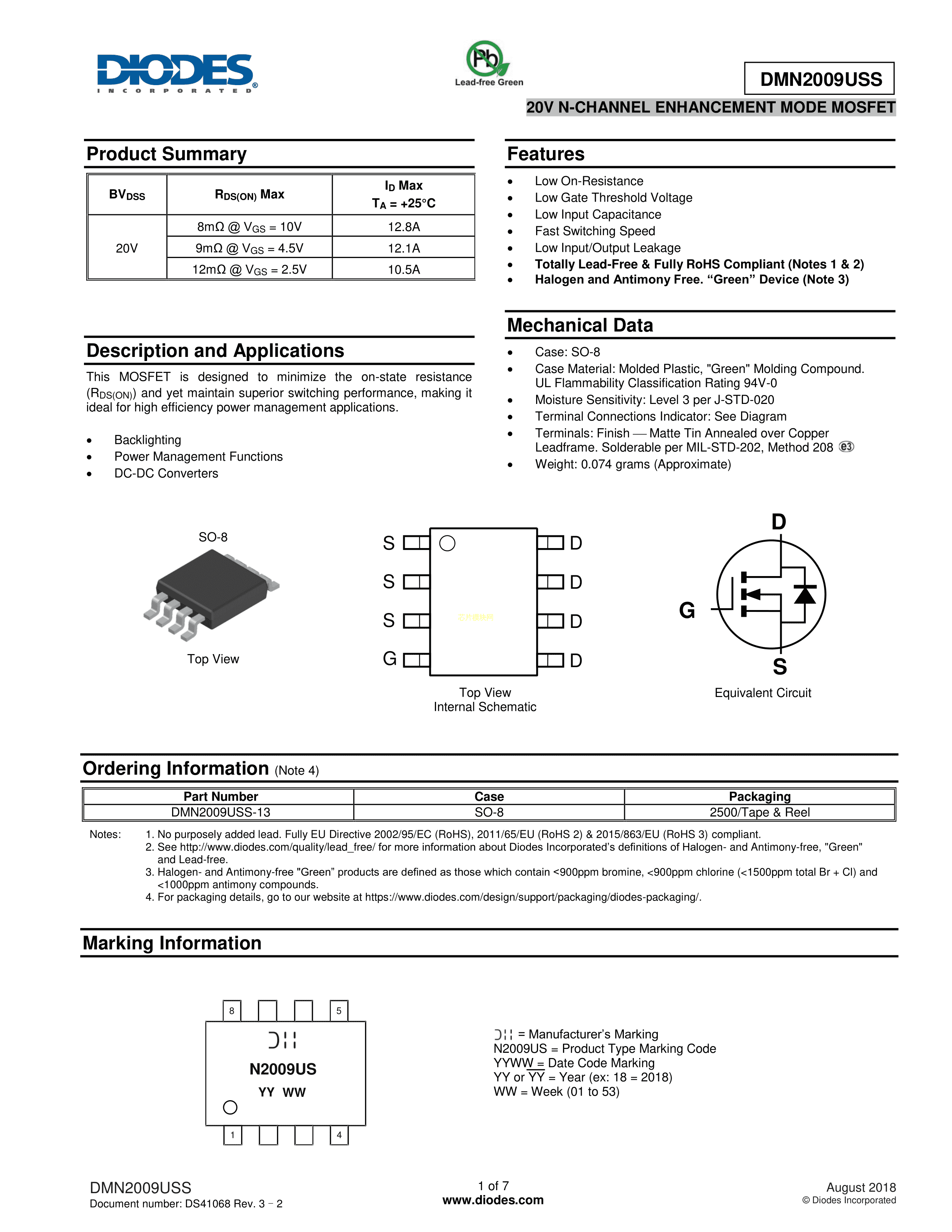 DMN2009USS-13数据手册SO-8封装DIODES(美台)PDF规格书,中英文下载