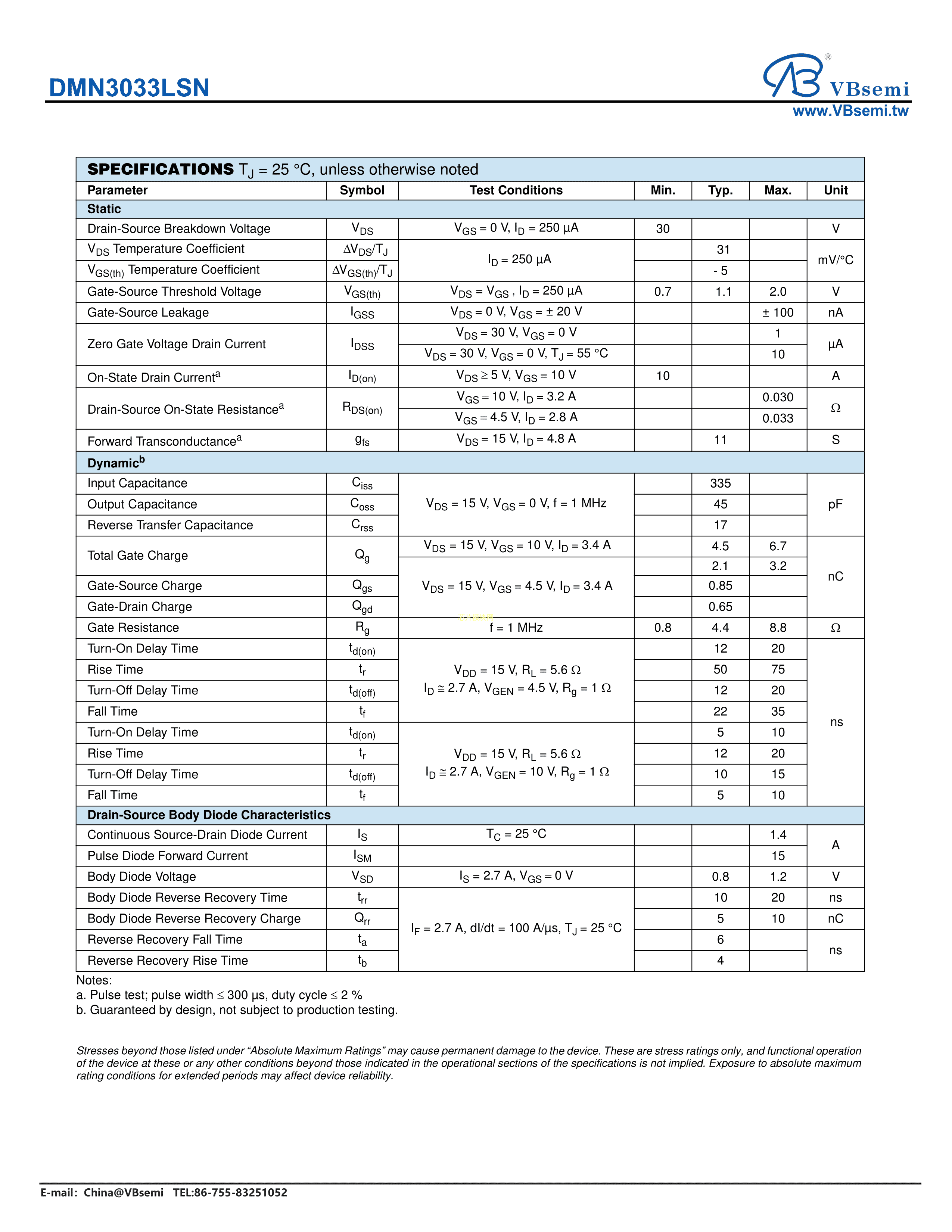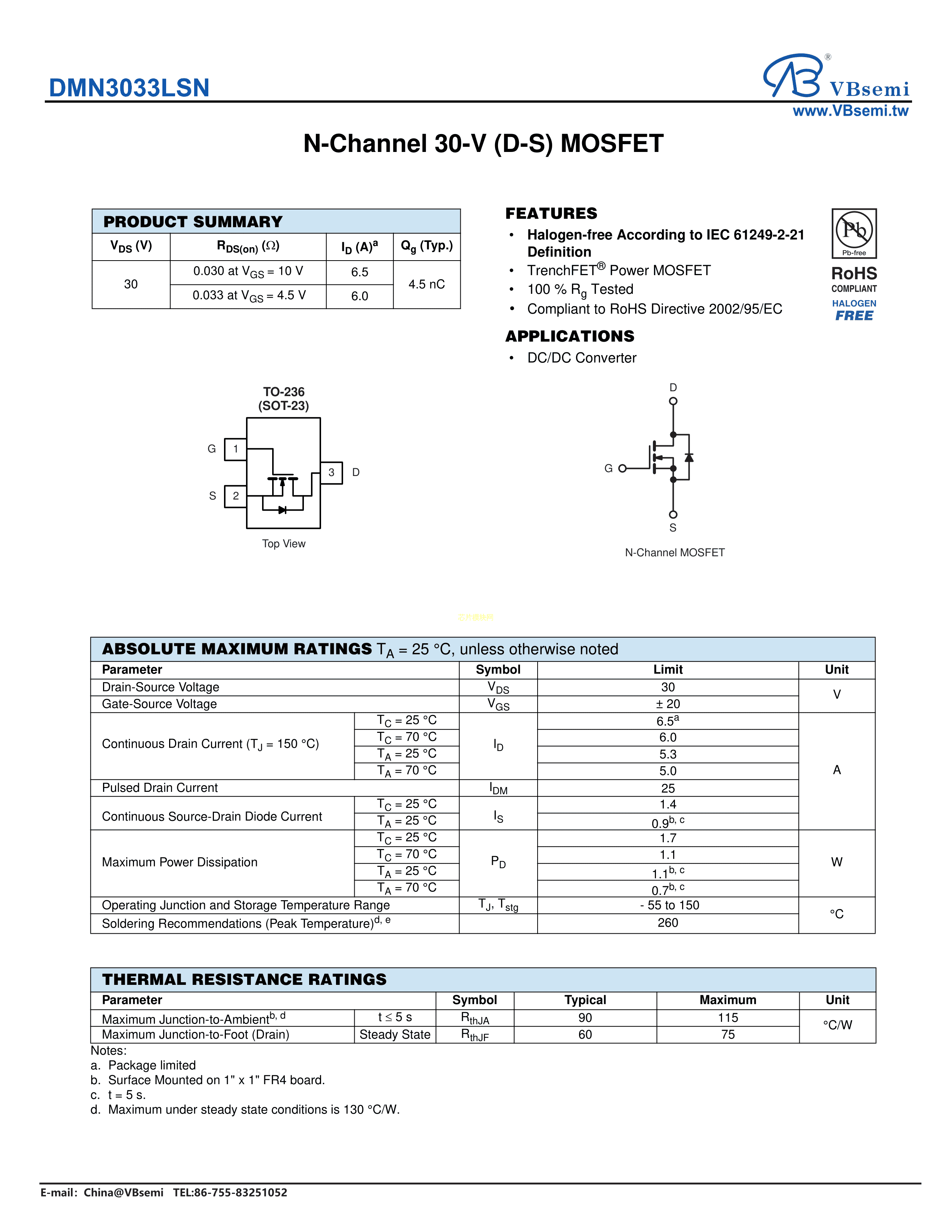 DMN3033LSN数据手册SOT-23-3封装VBsemi(台湾微碧)PDF规格书,中英文下载