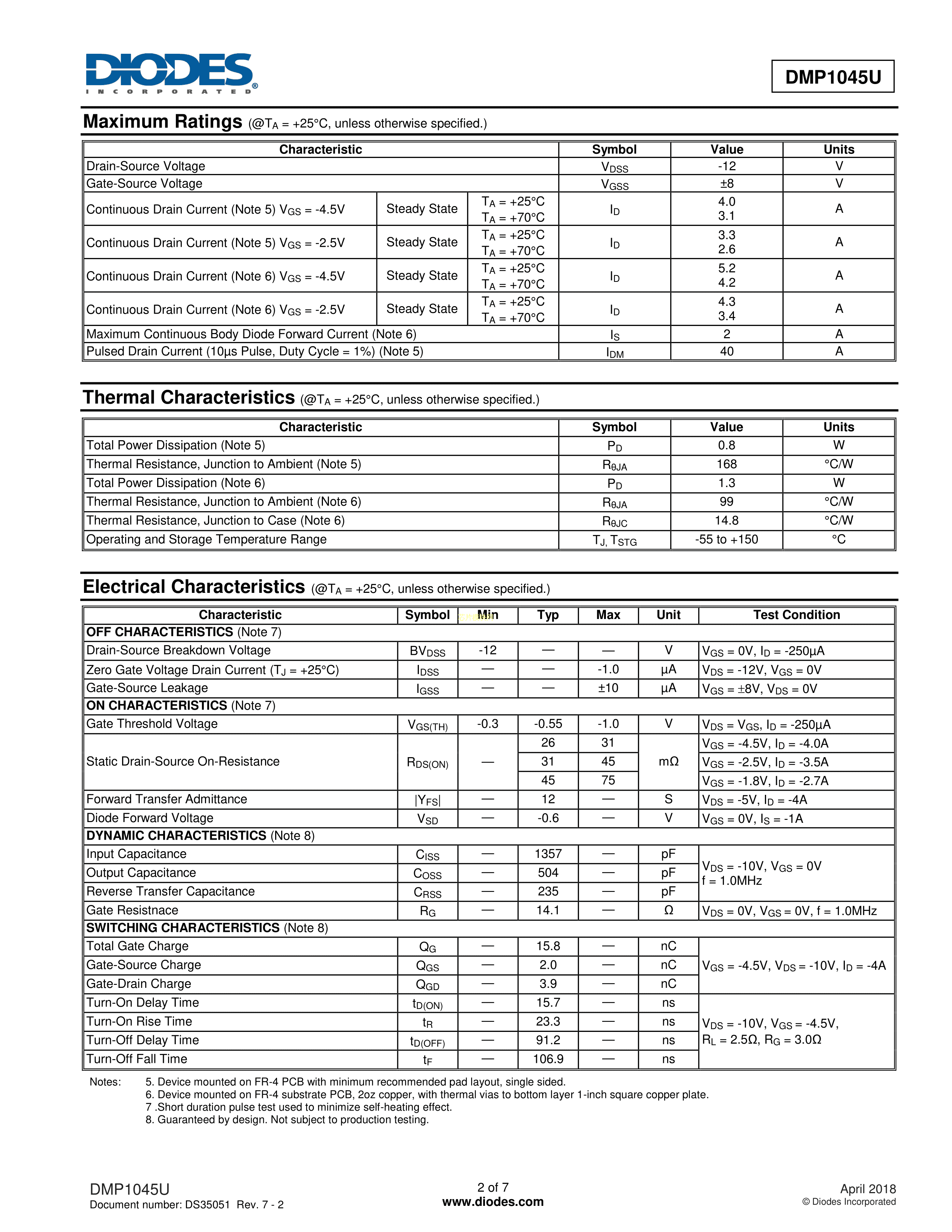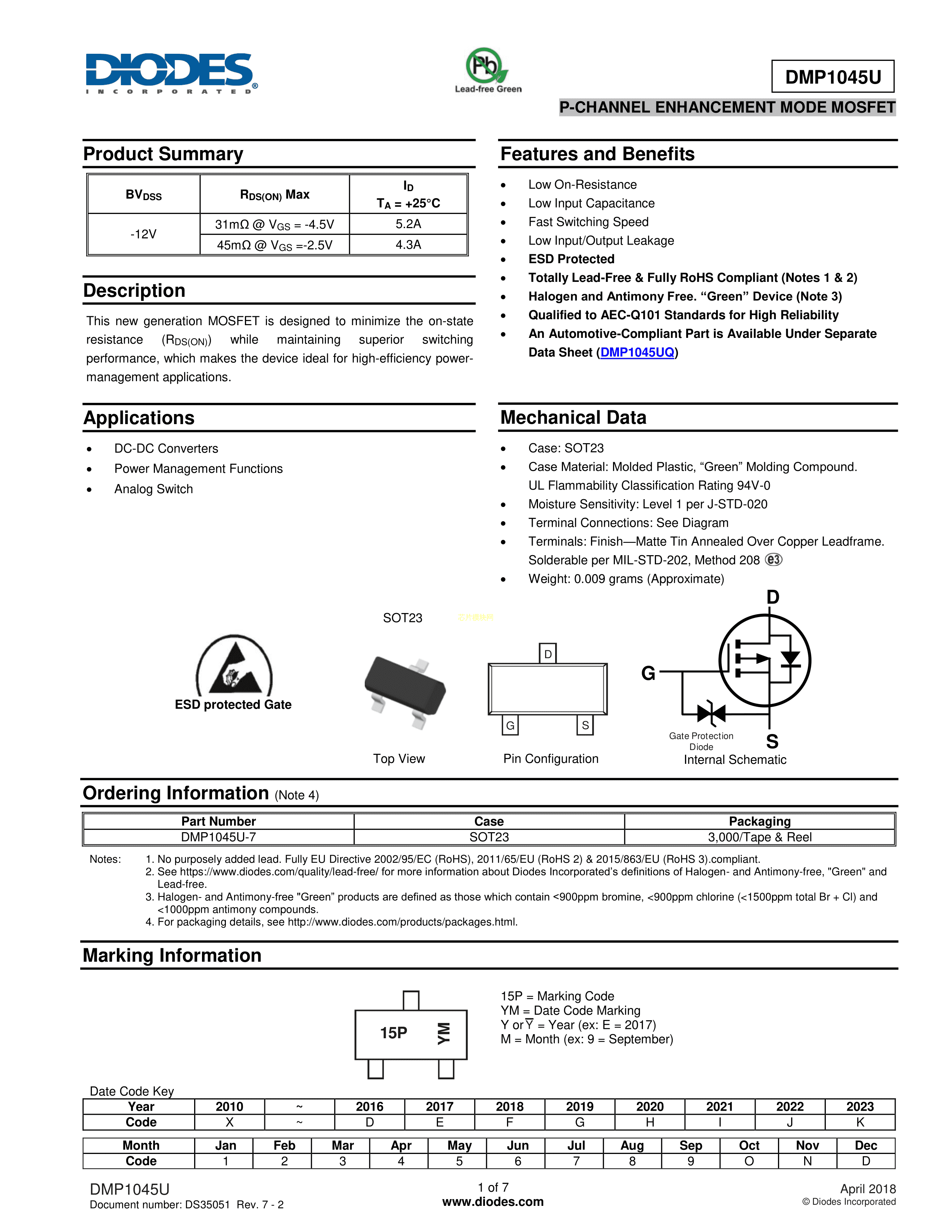 DMP1045U-7数据手册SOT-23(SOT-23-3)封装DIODES(美台)PDF规格书,中