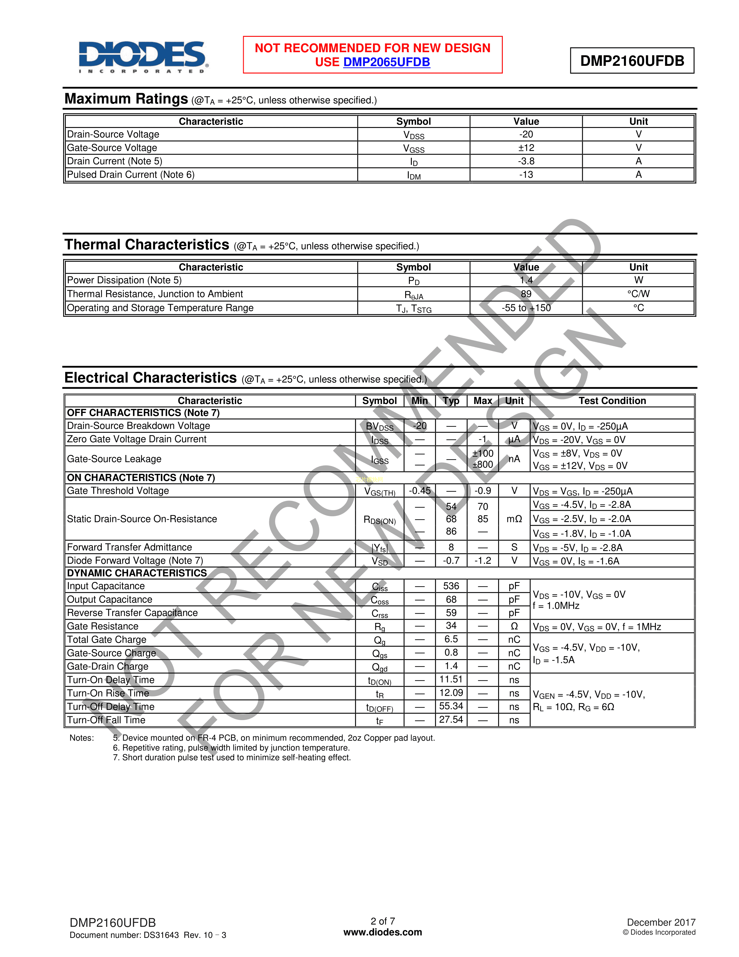 DMP2160UFDB-7数据手册U-DFN2020-6封装DIODES(美台)PDF规格书,中英文