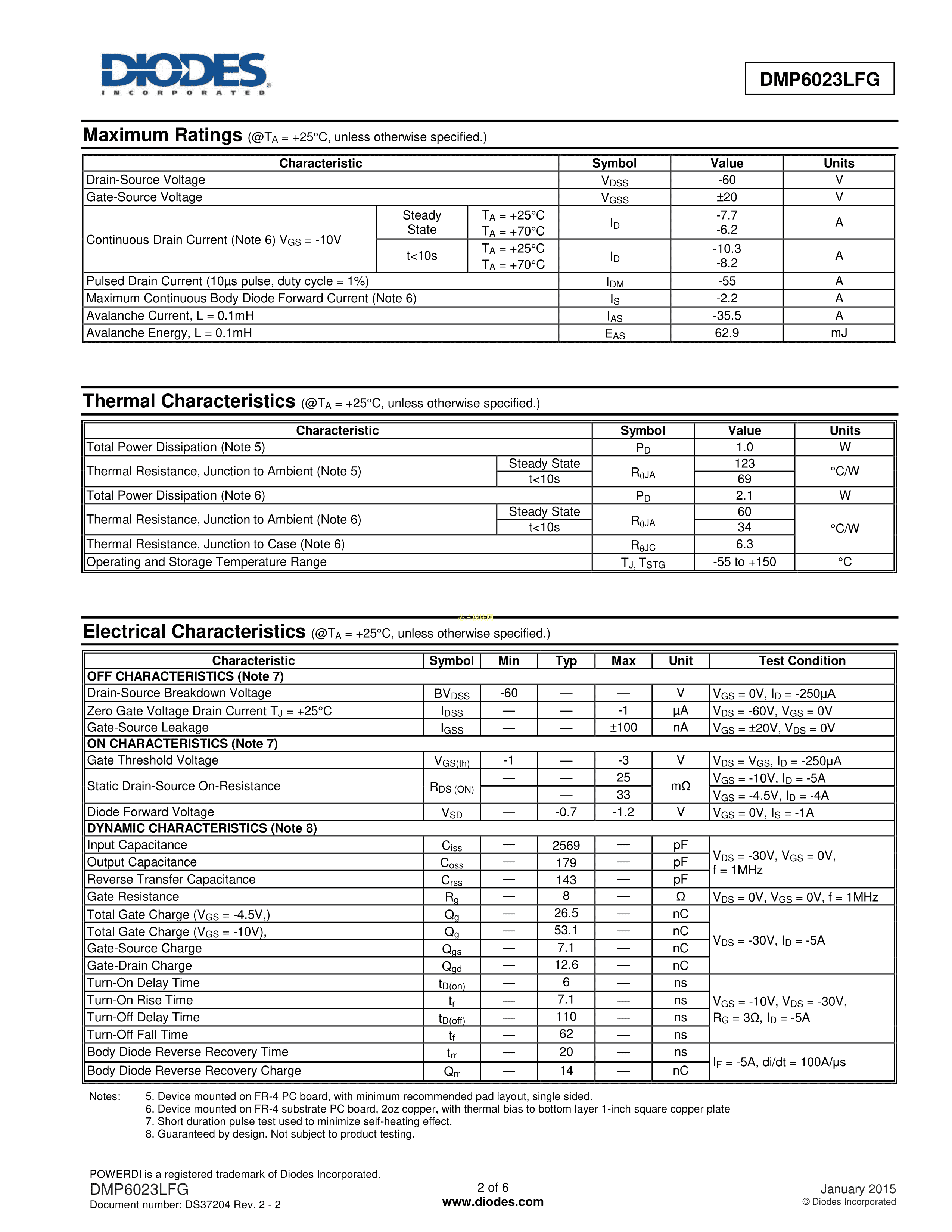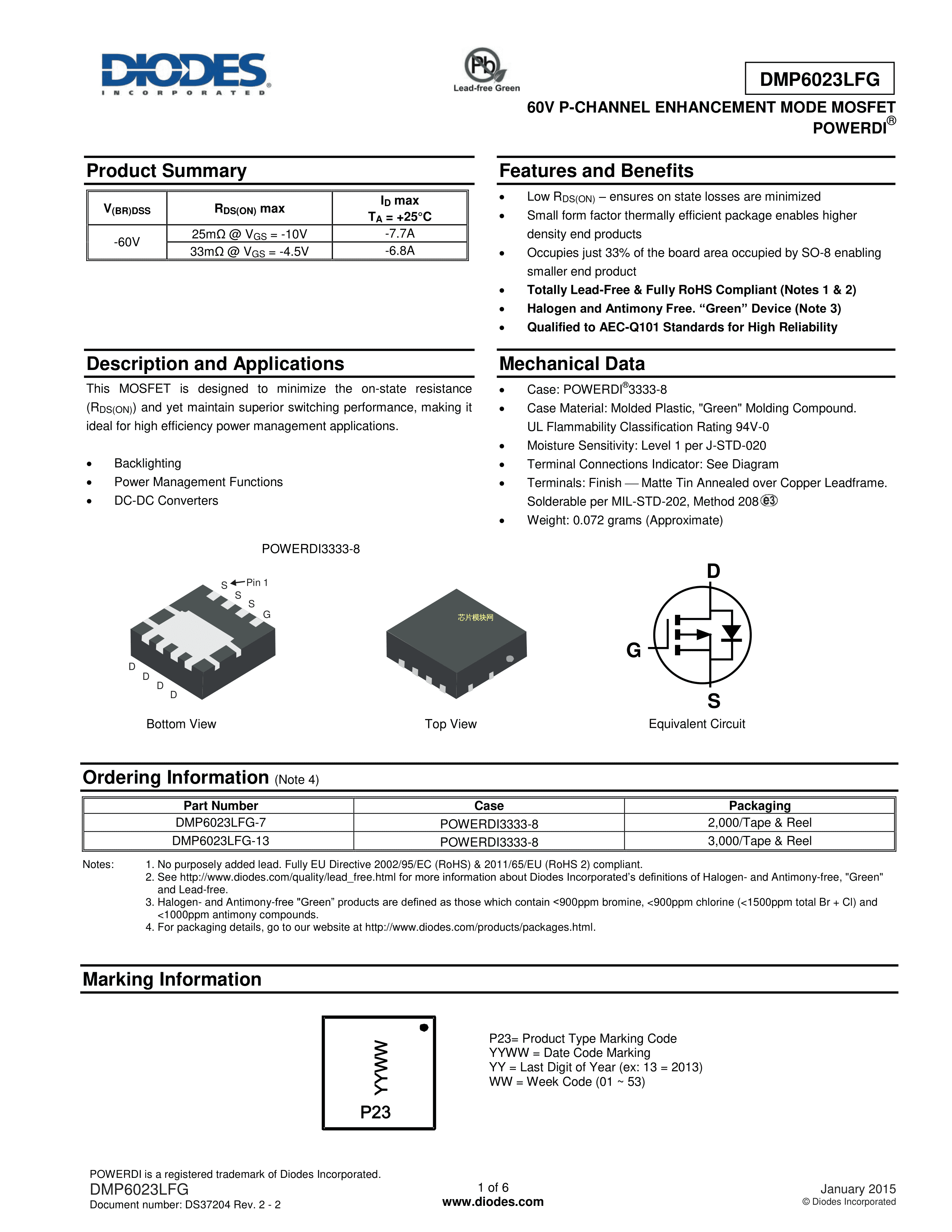 DMP6023LFG-7数据手册POWERDI3333-8封装DIODES(美台)PDF规格书,中英