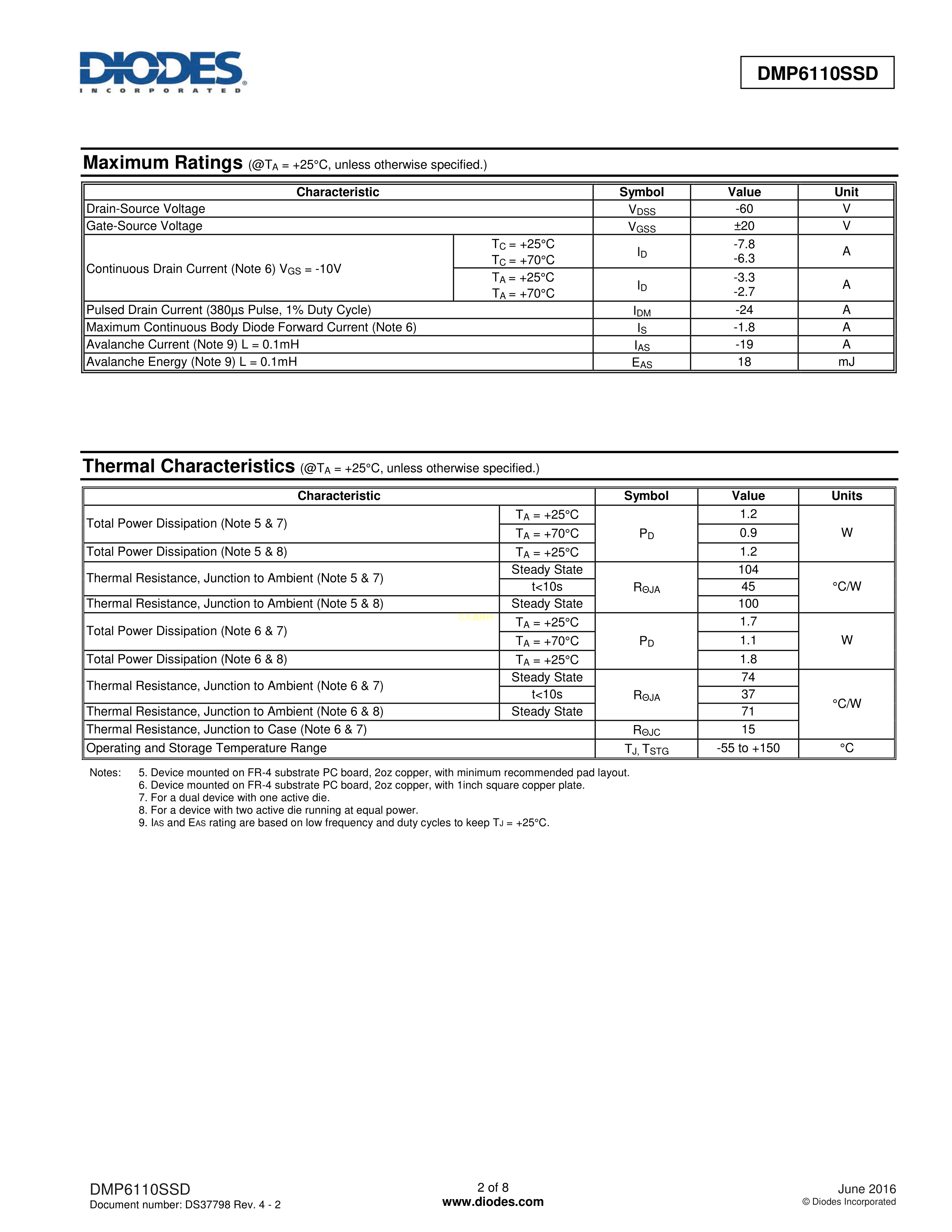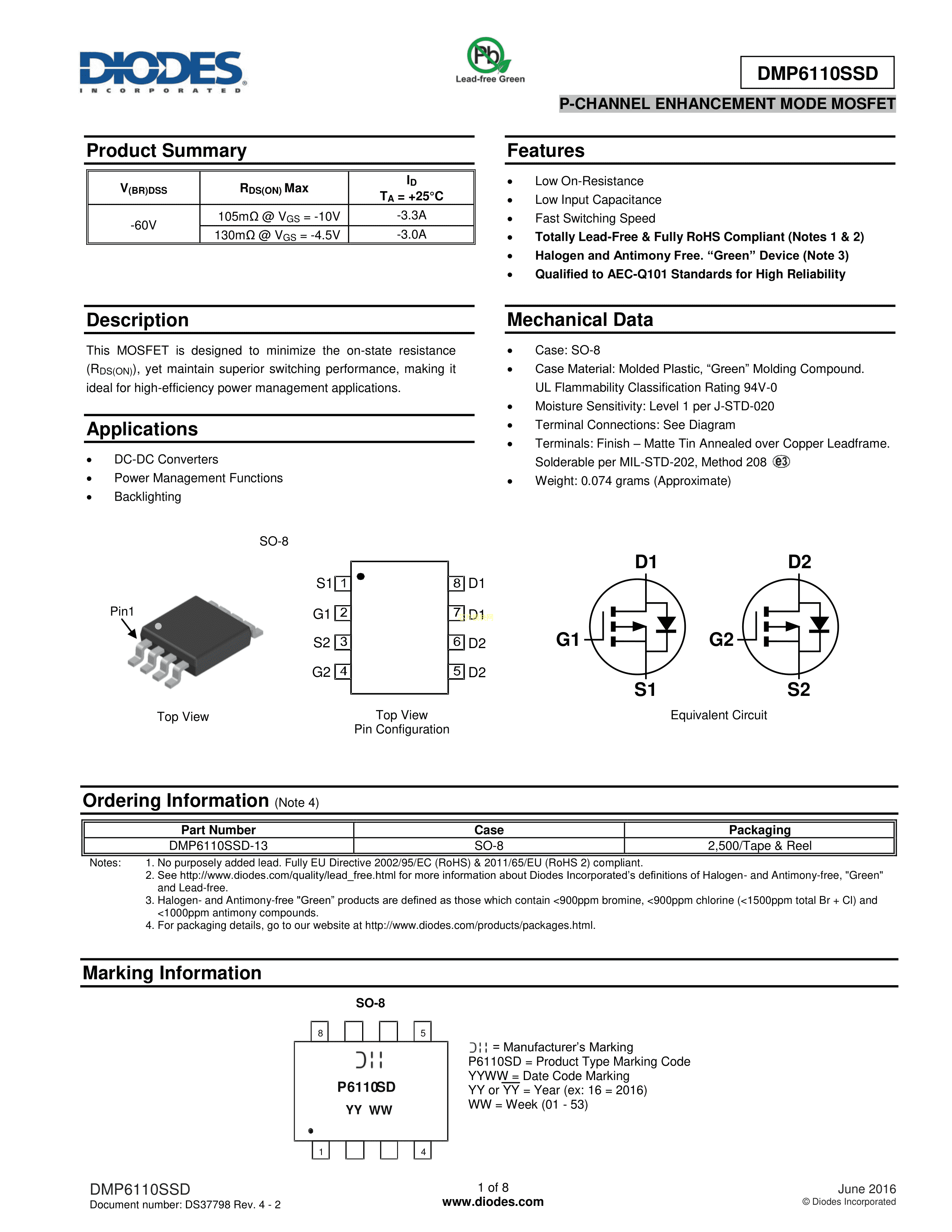 DMP6110SSD-13数据手册SO-8封装DIODES(美台)PDF规格书,中英文下载