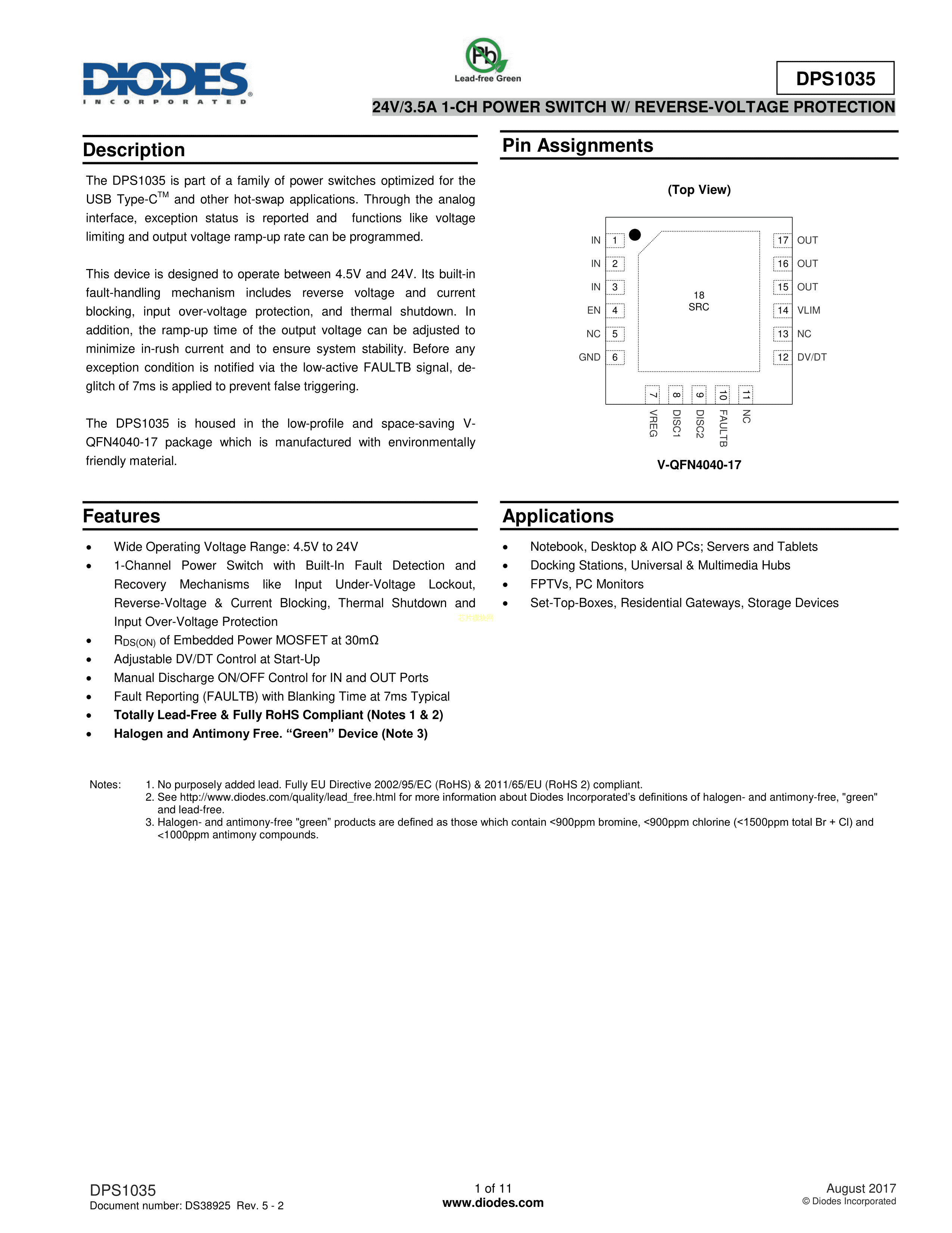 DPS1035FIA-13数据手册V-QFN4040-17封装DIODES(美台)PDF规格书,中英