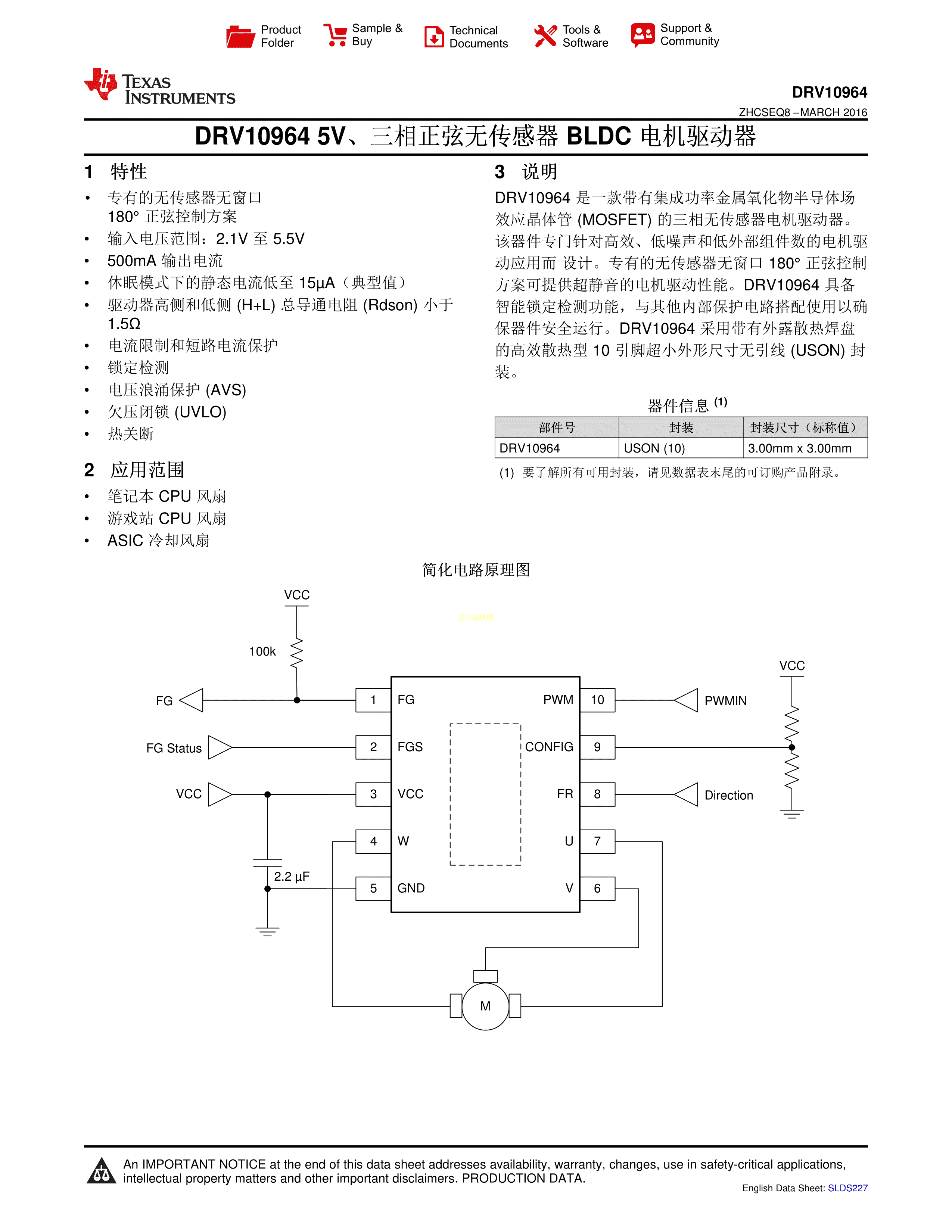 DRV10964FFDSNT数据手册SON-10(3x3)封装TI(德州仪器)PDF规格书,中英文下载