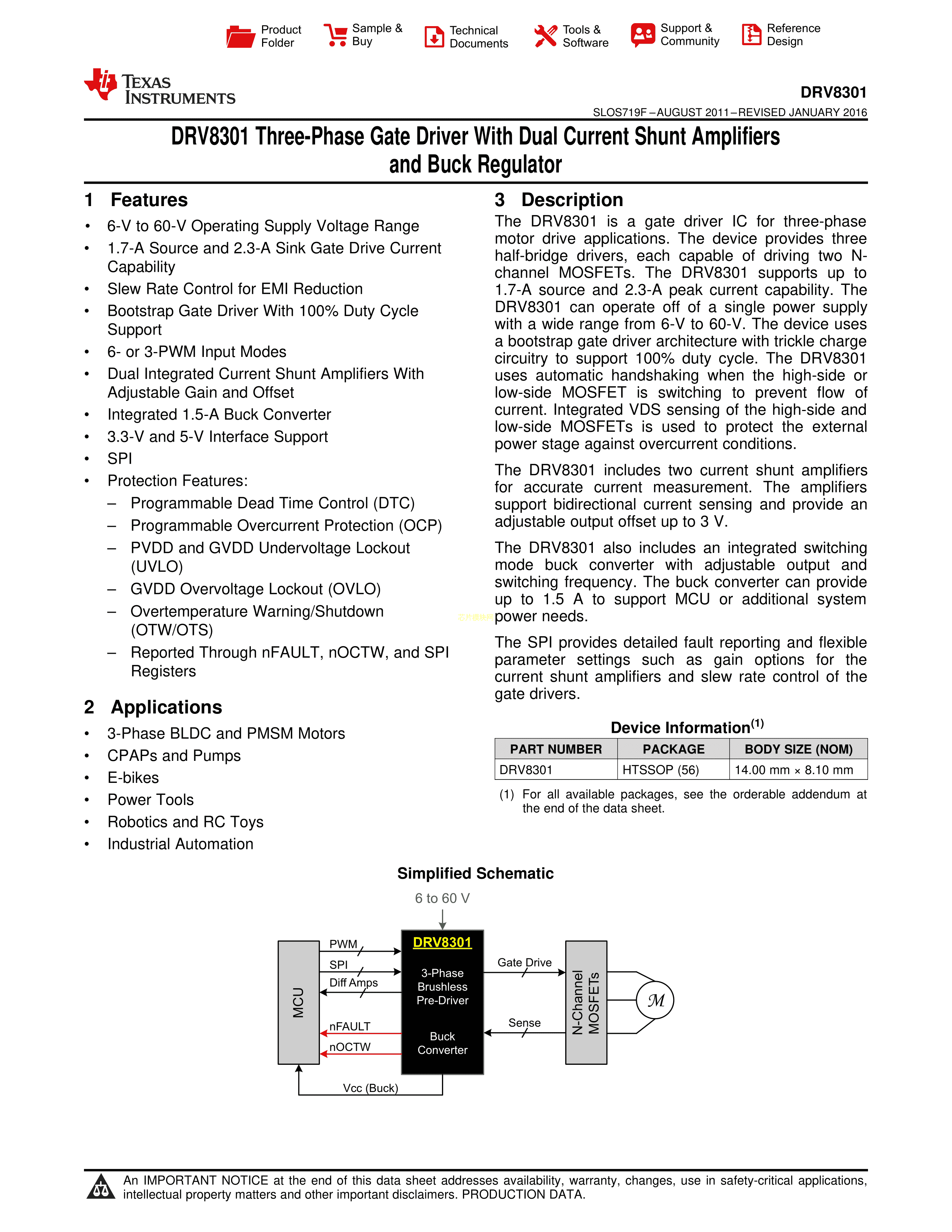 DRV8301DCAR数据手册HTSSOP-56封装TI(德州仪器)PDF规格书,中英文下载