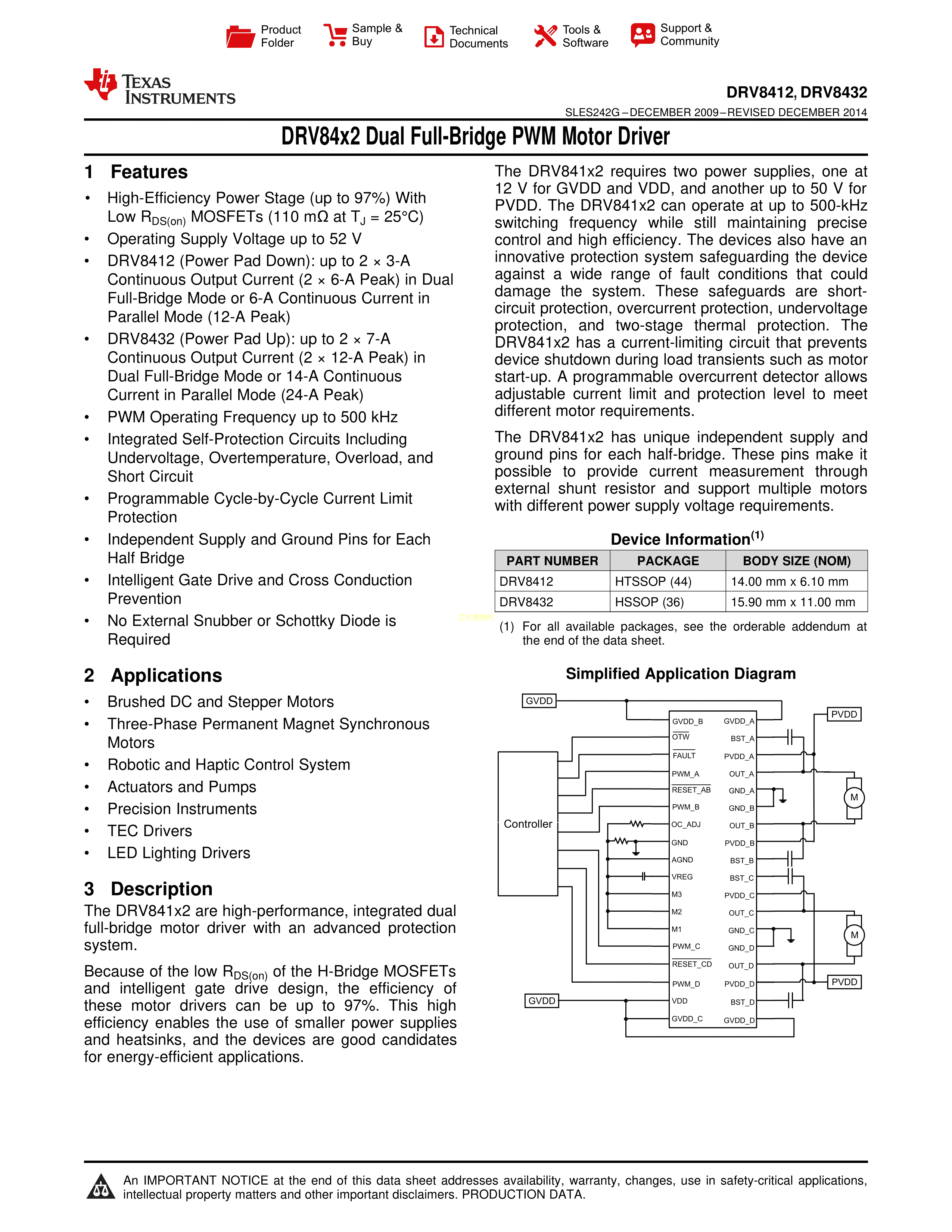 DRV8412DDWR数据手册HTSSOP-44封装TI(德州仪器)PDF规格书,中英文下载
