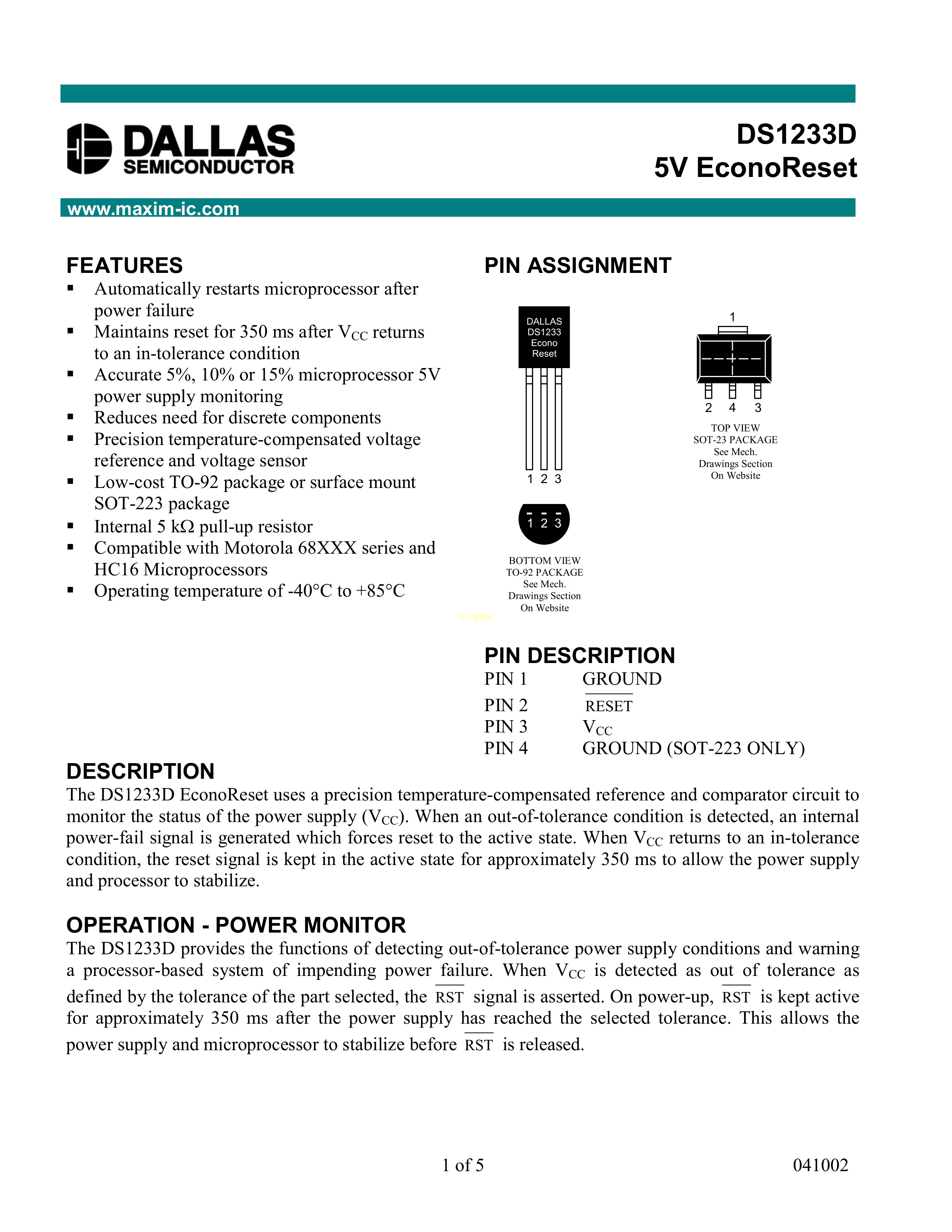 DS1233DZ-5+TR数据手册SOT-223-3封装MAXIM(美信)PDF规格书,中英文下载