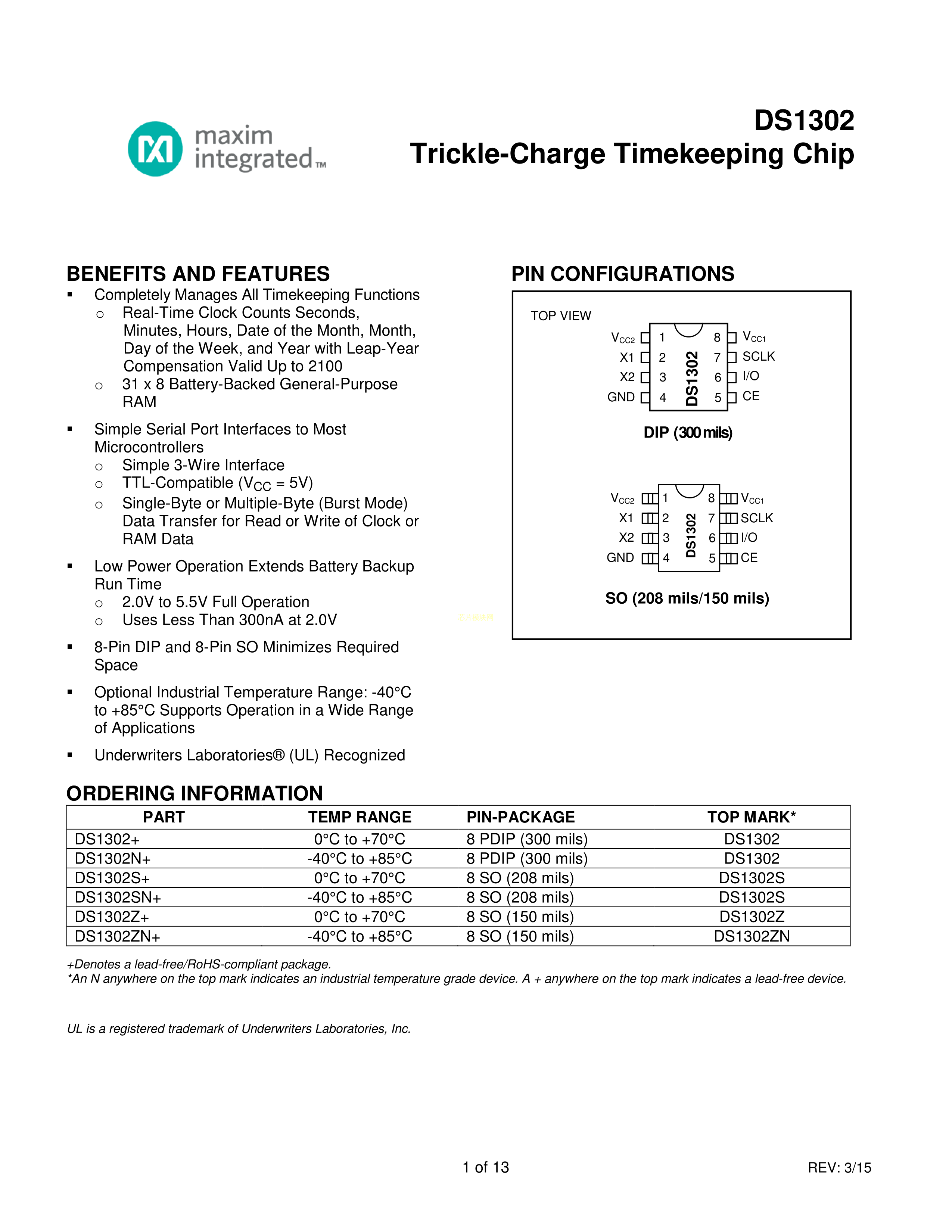 DS1302ZN+数据手册SOIC-8封装MAXIM(美信)PDF规格书,中英文下载