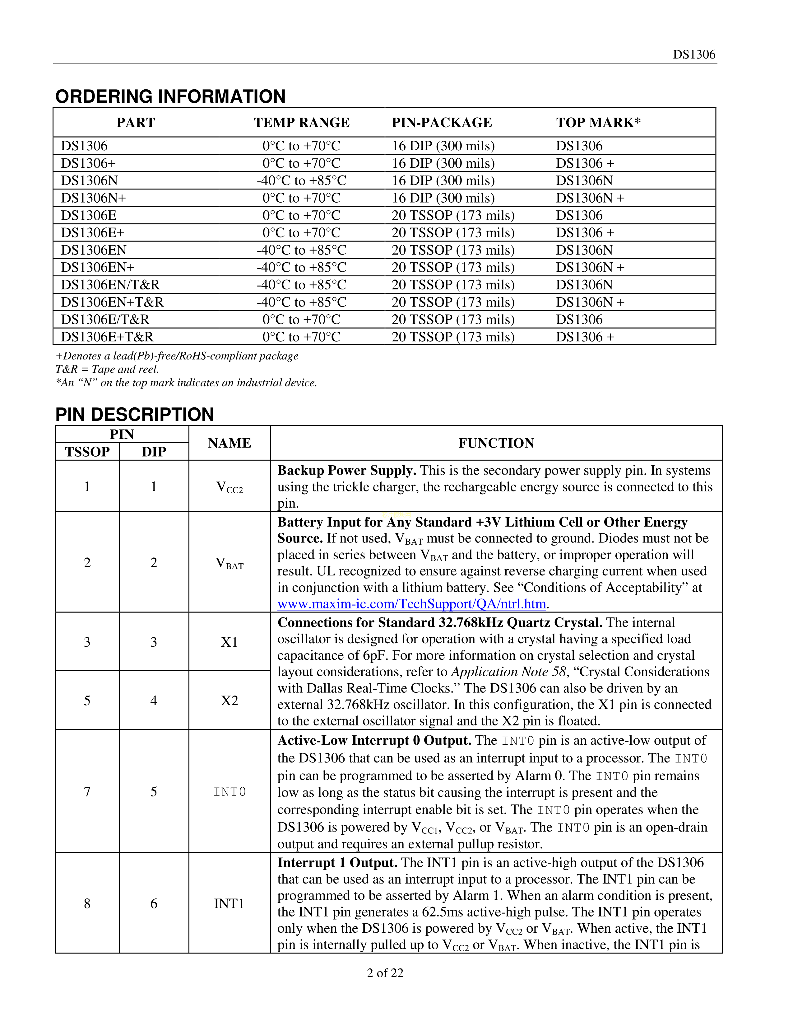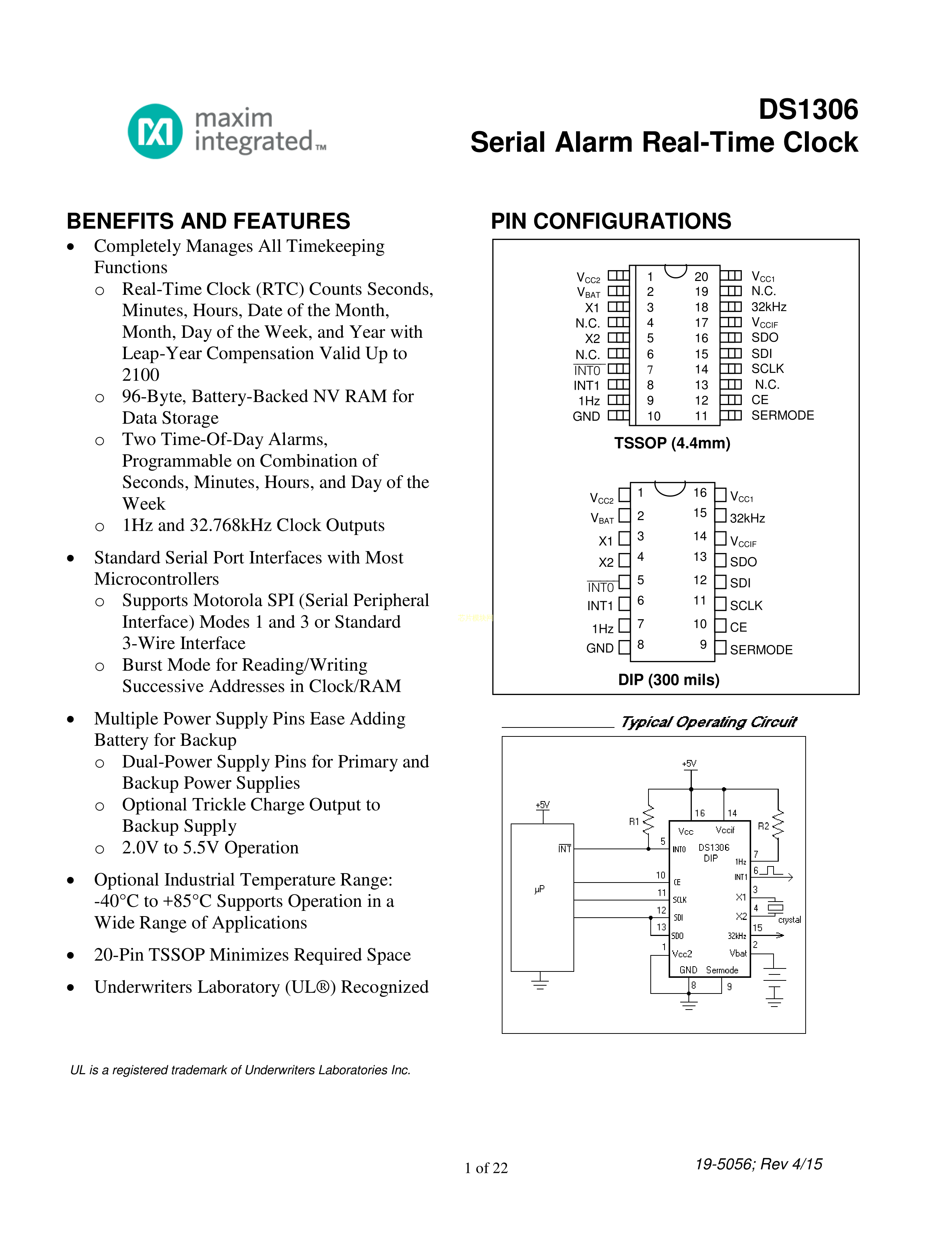 DS1306EN+数据手册TSSOP-20封装MAXIM(美信)PDF规格书,中英文下载
