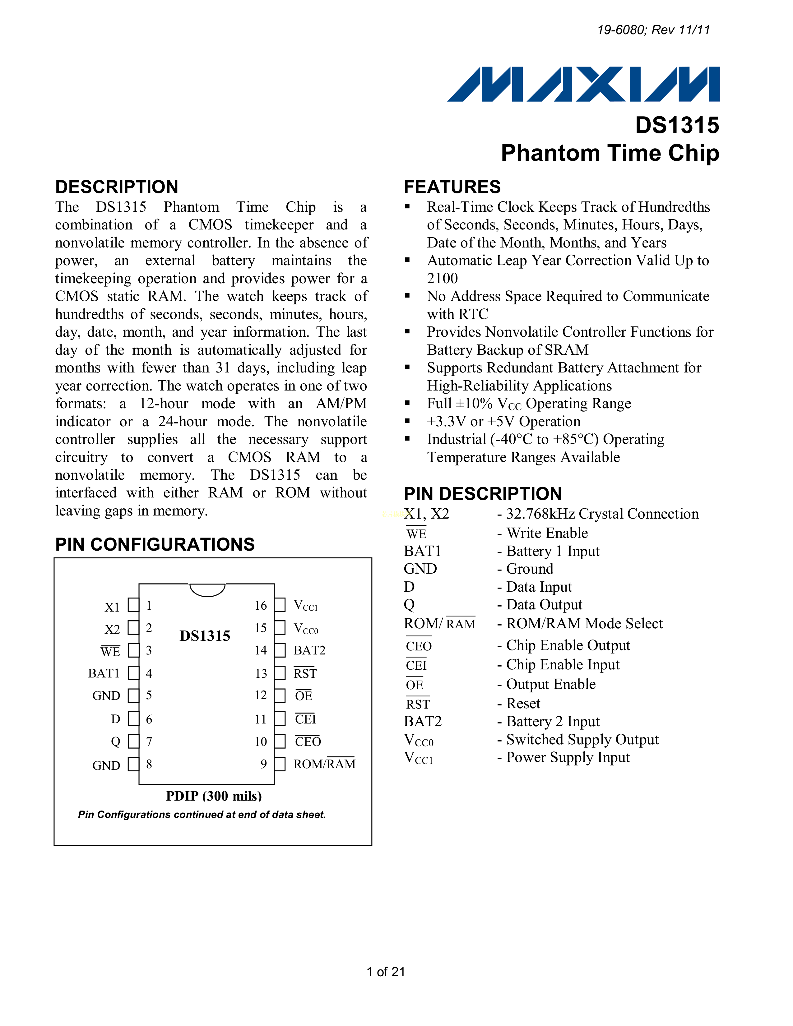 DS1315S-5+数据手册SOIC-16封装MAXIM(美信)PDF规格书,中英文下载