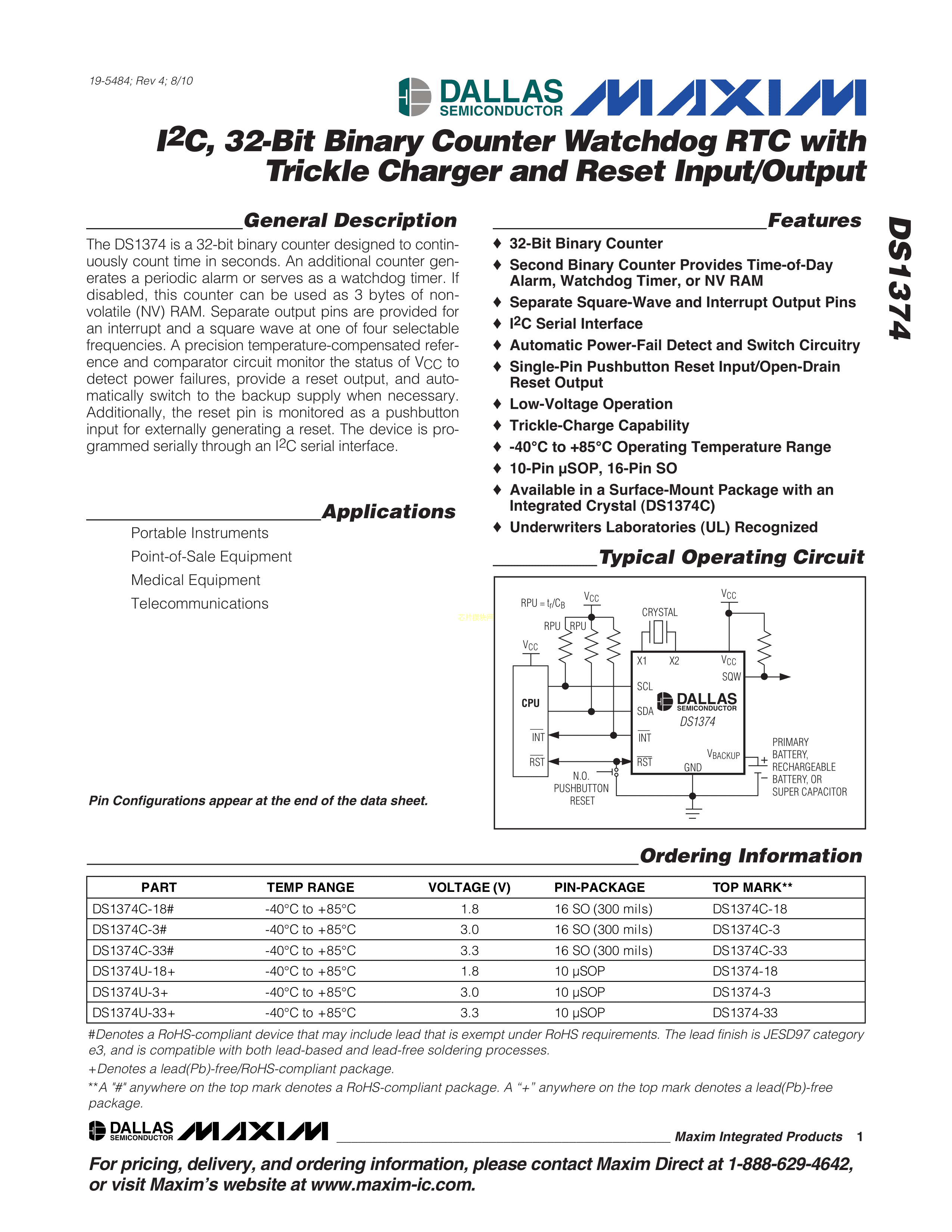 DS1374U-33+TR数据手册10-uMAX封装MAXIM(美信)PDF规格书,中英文下载