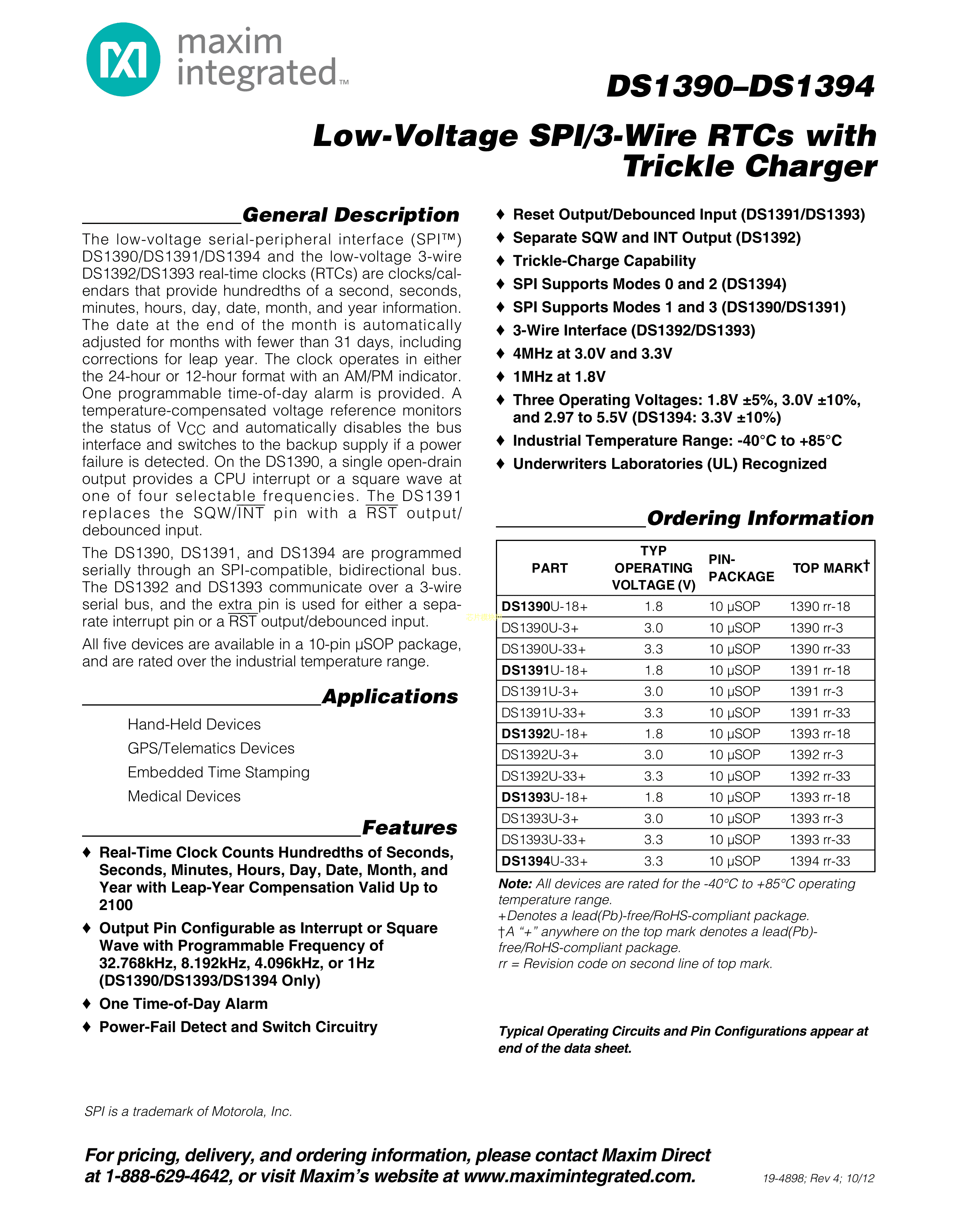 DS1390U-33+TR数据手册MSOP-10封装MAXIM(美信)PDF规格书,中英文下载