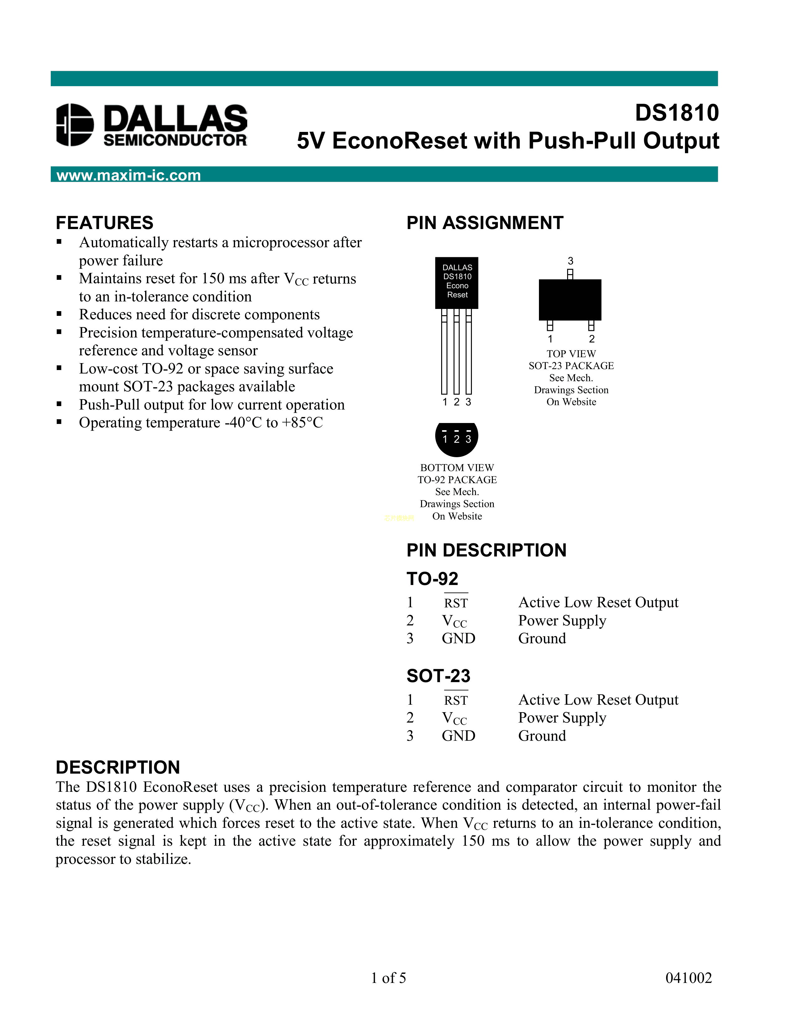 DS1810R-15+TR数据手册SOT-23-3封装MAXIM(美信)PDF规格书,中英文下载