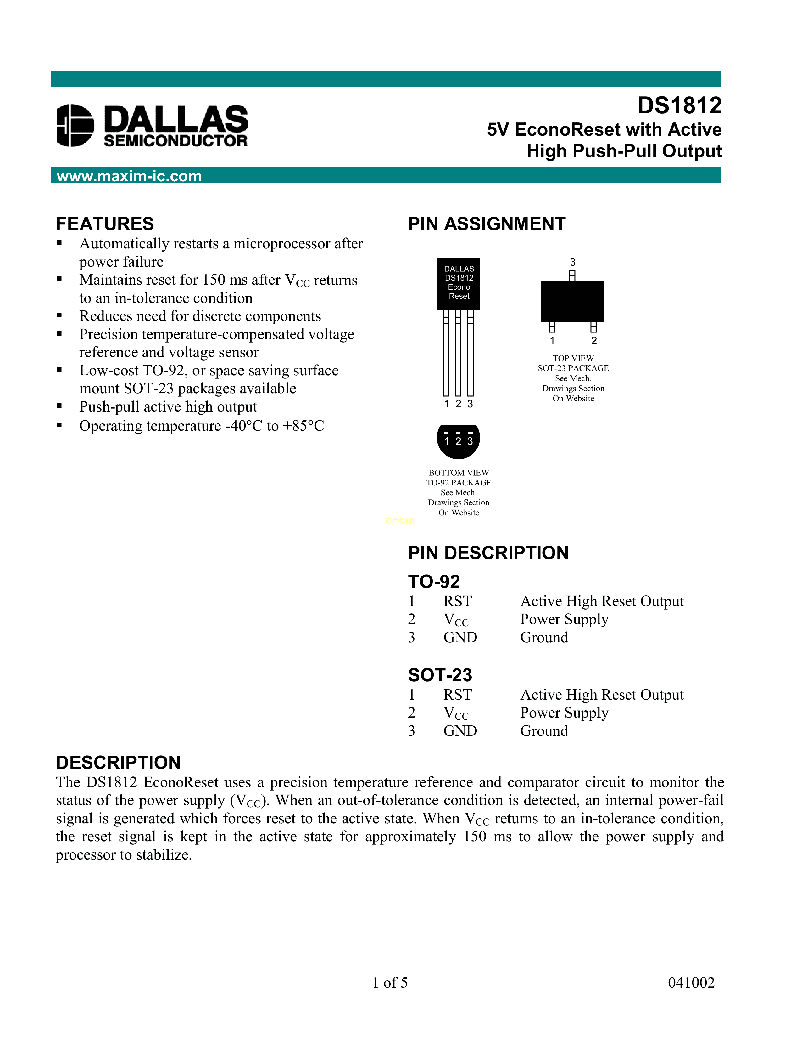 DS1812R-5+TR数据手册SOT-23-3封装MAXIM(美信)PDF规格书,中英文下载