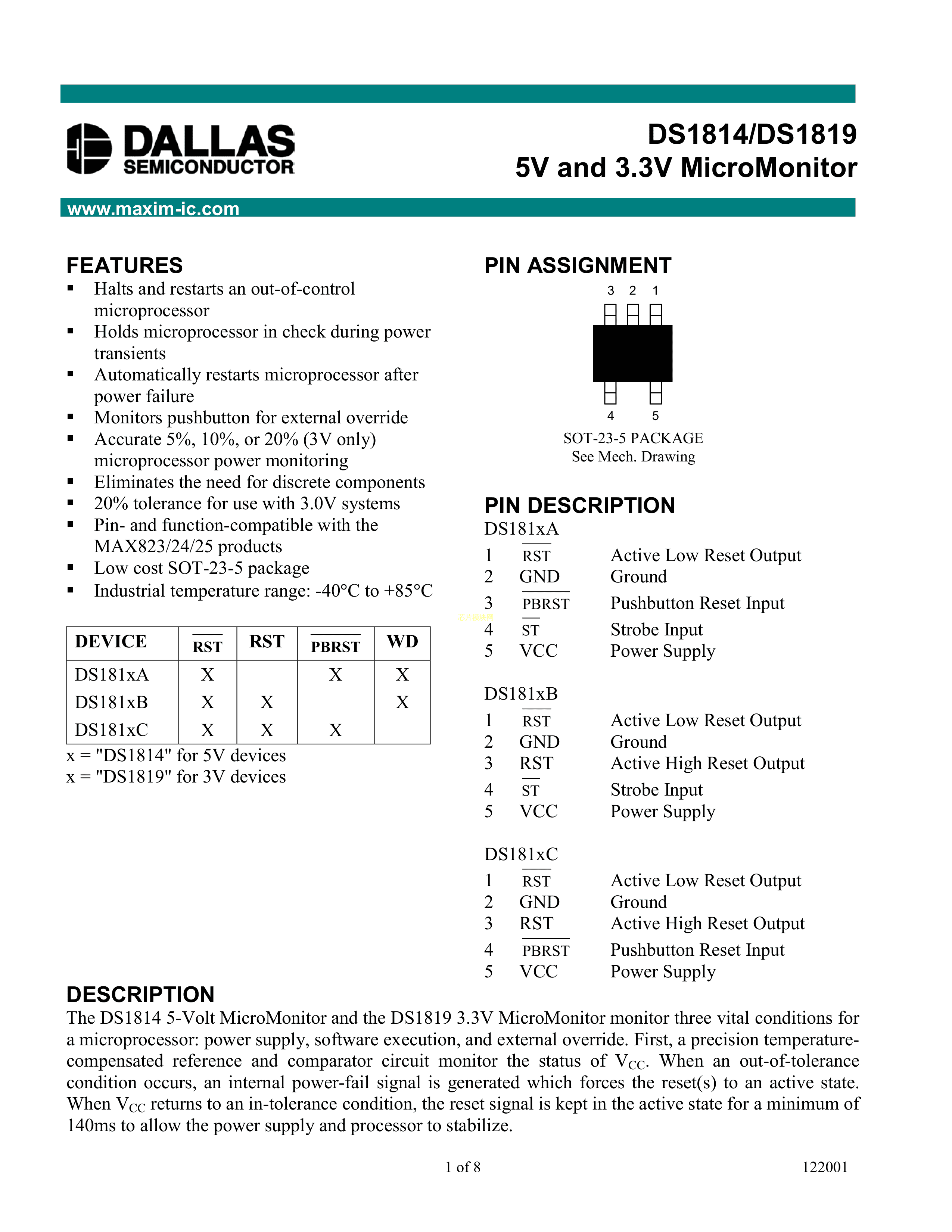 DS1814BR-5+TR数据手册SOT-23-5封装MAXIM(美信)PDF规格书,中英文下载