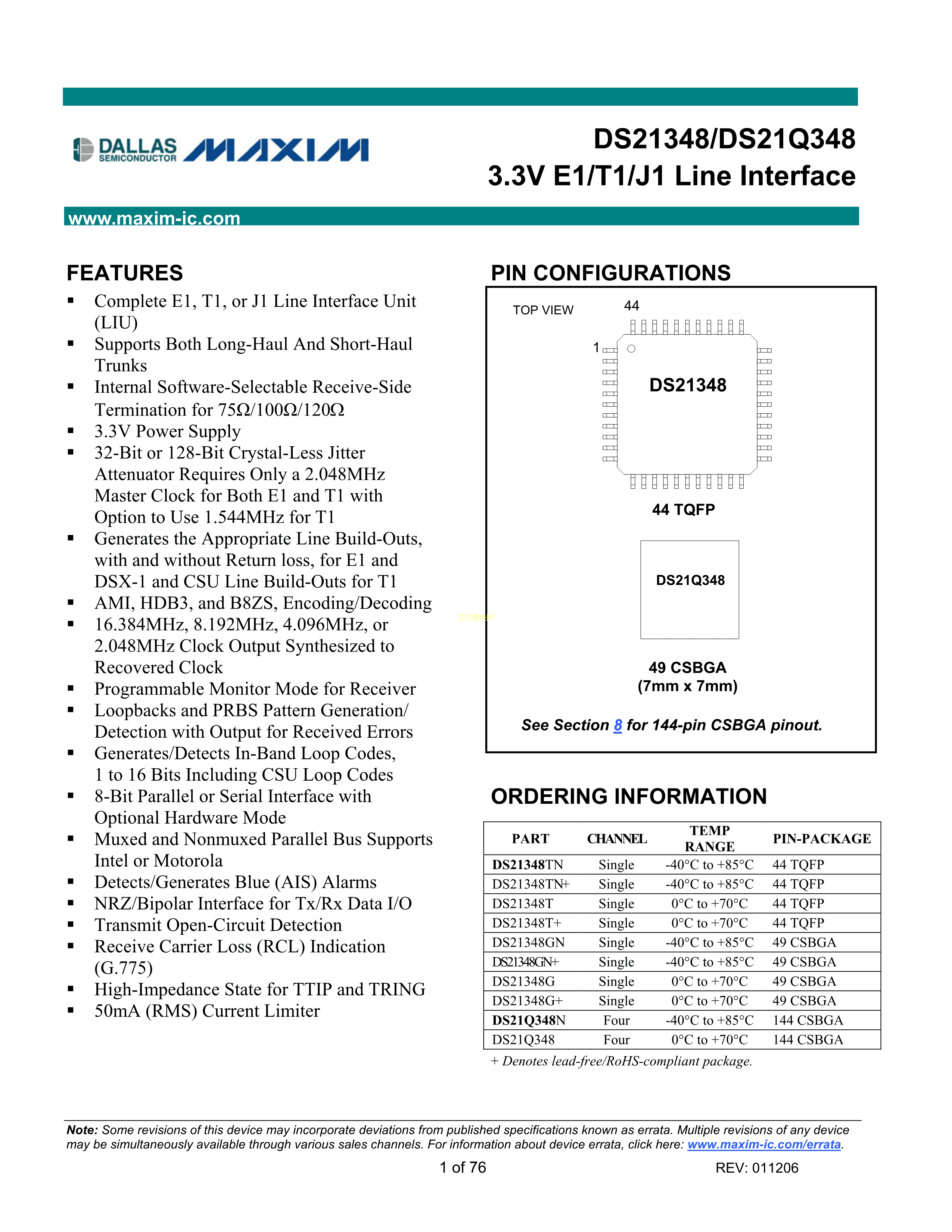 DS21348G+数据手册CSBGA-49(7x7)封装MAXIM(美信)PDF规格书,中英文下载