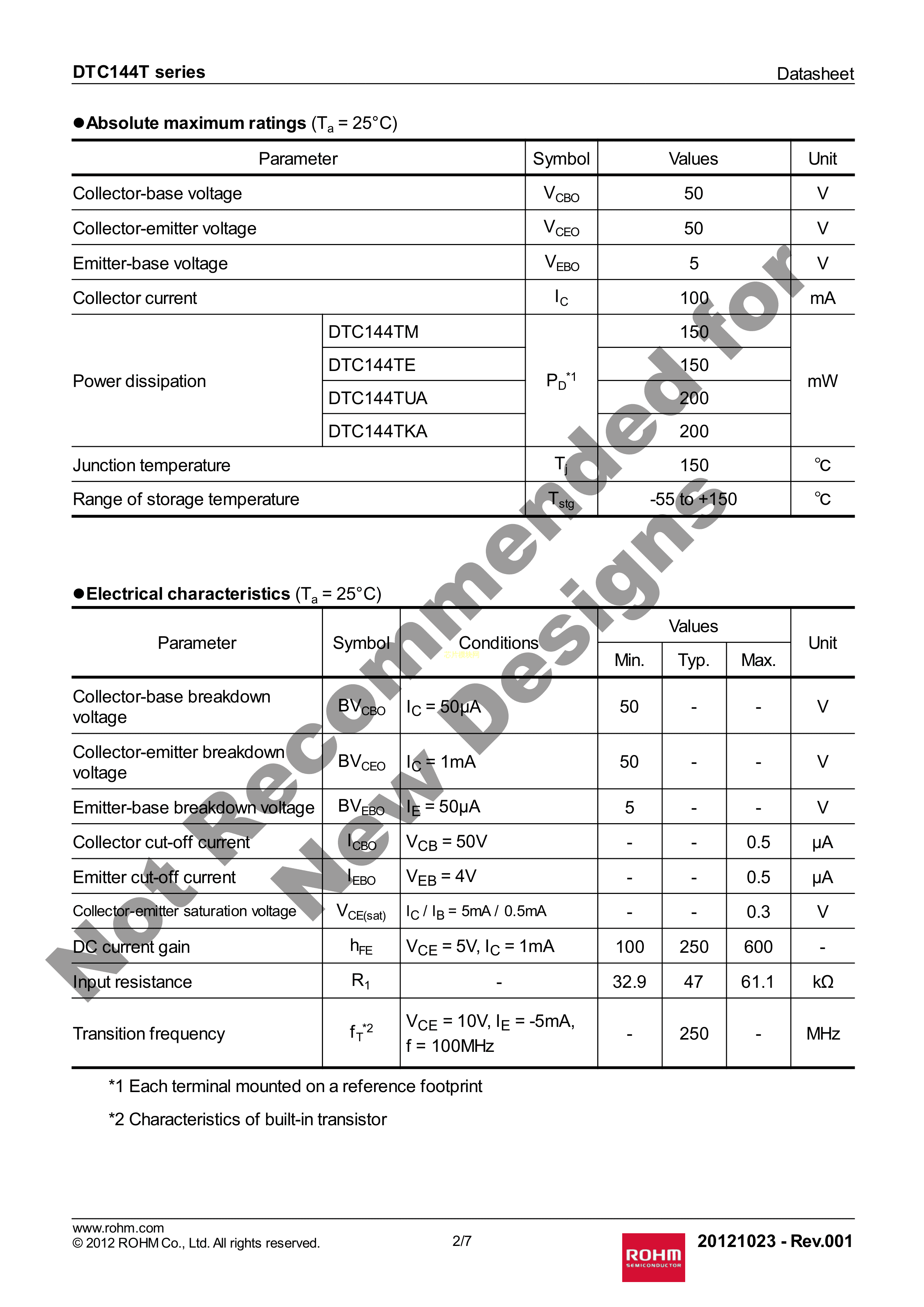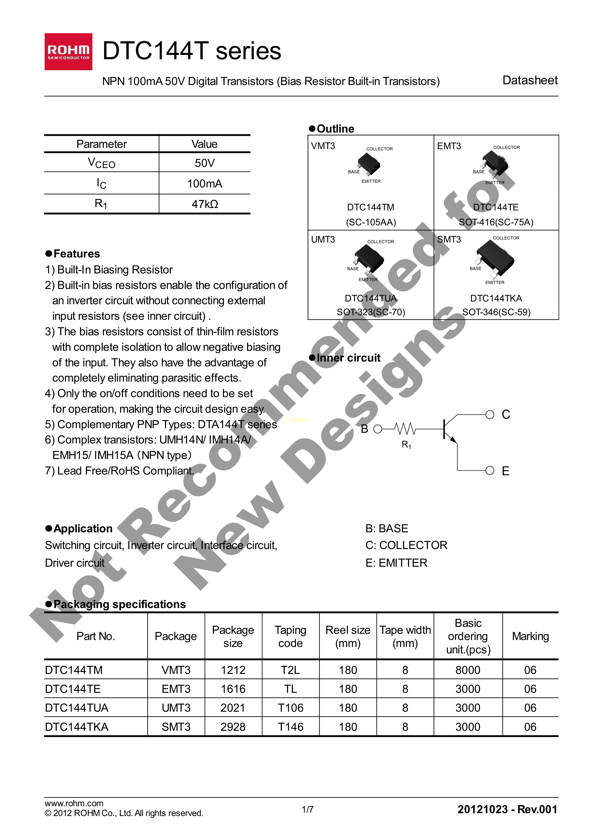 DTC144TUAT106数据手册SOT-323封装ROHM(罗姆)PDF规格书,中英文下载