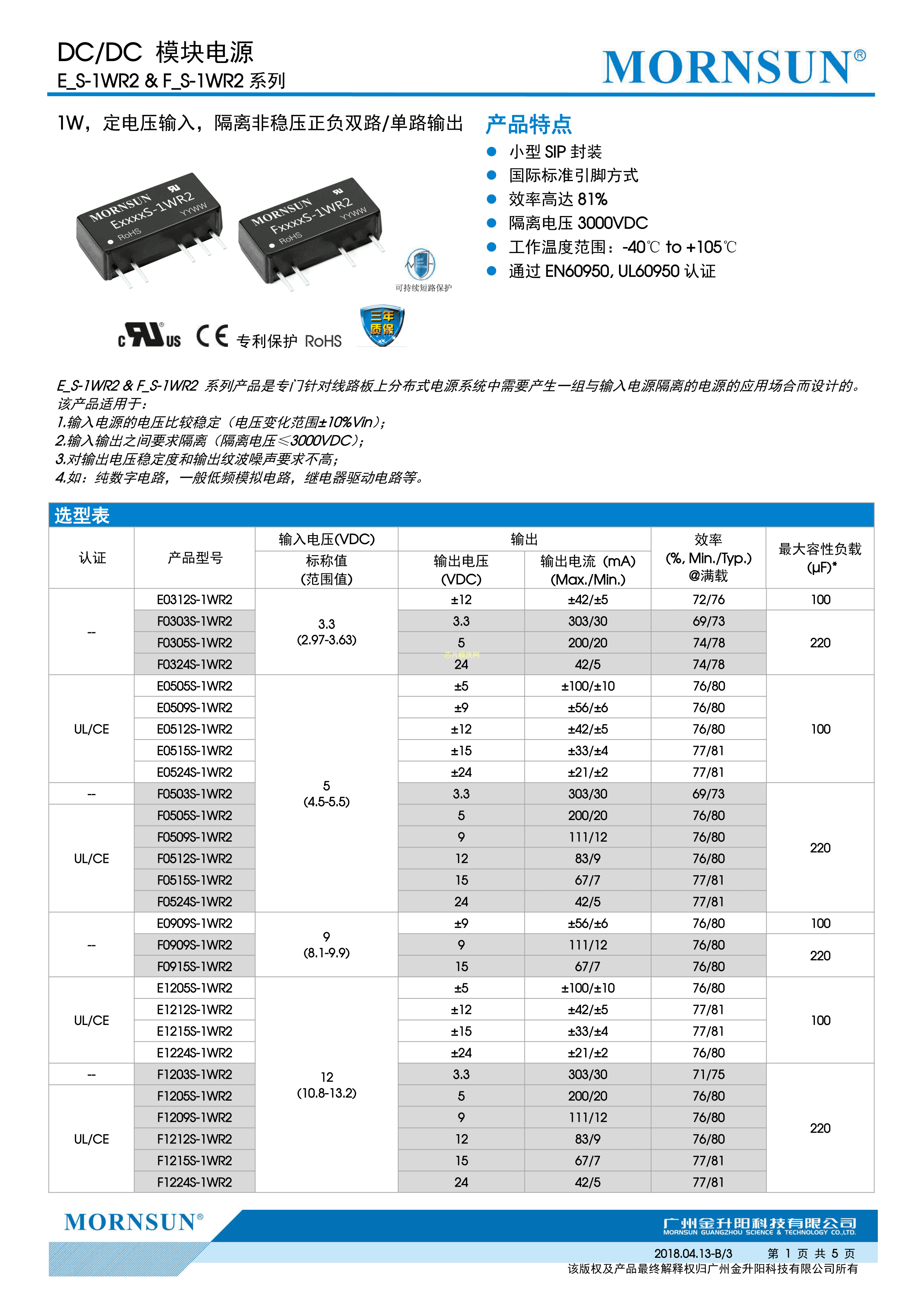 E0505S-1WR2数据手册插件封装MORNSUN(金升阳)PDF规格书,中英文下载